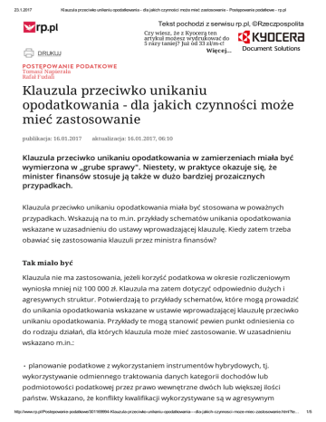 23.1.2017 Klauzula przeciwko unikaniu opodatkowania - dla jakich czynności może mieć zastosowanie - Postępowanie podatkowe - rp.pl Tekst pochodzi z serwisu rp.pl, ©Rzeczpospolita Czy wiesz, że z Kyocerą ten artykuł możesz wydrukować do 5 razy taniej? Już od 33 zł/m-c! Więcej… DRUKUJ P O S T Ę P O W A N IE P O D A T K O W E Tomasz Napierała Rafał Fudali Klauzula przeciwko unikaniu opodatkowania - dla jakich czynności może mieć zastosowanie publikacja: 16.01.2017 aktualizacja: 16.01.2017, 06:10 Klauzula przeciwko unikaniu opodatkowania w zamierzeniach miała być wymierzona w „grube sprawy". Niestety, w praktyce okazuje się, że minister finansów stosuje ją także w dużo bardziej prozaicznych przypadkach. Klauzula przeciwko unikaniu opodatkowania miała być stosowana w poważnych przypadkach. Wskazują na to m.in. przykłady schematów unikania opodatkowania wskazane w uzasadnieniu do ustawy wprowadzającej klauzulę. Kiedy zatem trzeba obawiać się zastosowania klauzuli przez ministra finansów? Tak miało być Klauzula nie ma zastosowania, jeżeli korzyść podatkowa w okresie rozliczeniowym wyniosła mniej niż 100 000 zł. Klauzula ma zatem dotyczyć odpowiednio dużych i agresywnych struktur. Potwierdzają to przykłady schematów, które mogą prowadzić do unikania opodatkowania wskazane w ustawie wprowadzającej klauzulę przeciwko unikaniu opodatkowania. Przykłady te mogą stanowić pewien punkt odniesienia co do rodzaju działań, dla których klauzula może mieć zastosowanie. W uzasadnieniu wskazano m.in.: • planowanie podatkowe z wykorzystaniem instrumentów hybrydowych, tj. wykorzystywanie odmiennego traktowania danych kategorii dochodów lub podmiotowości podatkowej przez prawo wewnętrzne dwóch lub większej ilości państw. Wskazano, że konflikty kwalifikacji wykorzystywane są w agresywnym http://www.rp.pl/Postepowanie-podatkowe/301169994-Klauzula-przeciwko-unikaniu-opodatkowania---dla-jakich-czynnosci-moze-miec-zastosowanie.html?te… 1/5 23.1.2017 Klauzula przeciwko unikaniu opodatkowania - dla jakich czynności może mieć zastosowanie - Postępowanie podatkowe - rp.pl planowaniu podatkowym w celu uzyskania efektu podwójnego nieopodatkowania danych kategorii dochodu, przy czym tworzone są sztuczne struktury podmiotowe zaangażowane w transakcję. • wykorzystywanie przepisów umownych w celu obniżenia podstawy opodatkowania w danym kraju, przy wykorzystaniu tzw. zakładu funkcjonującego dla celów stosowania umów o unikaniu podwójnego opodatkowania oraz możliwość tworzenia podmiotów transparentnych podatkowo. Zakład taki (lub spółka transparentna) tworzony jest na terytorium drugiego państwa, wyłącznie dla celów korzystniejszej podatkowo obsługi transakcji między dwoma podmiotami krajowymi. Struktury planowania podatkowego wykorzystują tutaj jednocześnie specyficzne postanowienia prawa wewnętrznego państwa położenia zakładu oraz przepisy umów podatkowych. • wykorzystanie trustów – instytucji wywodzącej się z tradycji prawnej common law w celu ucieczki przed opodatkowaniem. Umowa trustu zakłada przekazanie własności majątku właściciela na rzecz instytucji powierniczej, która sprawuje nad nim zarząd oraz dokonuje rozporządzeń z majątku na rzecz beneficjenta. • wykorzystanie podmiotów tworzonych w tzw. rajach podatkowych w celu sztucznego transferu dochodu, skutkującego zmniejszeniem podstawy opodatkowania w Polsce. Elementem struktury często jest wyposażenie takiego podmiotu w prawa autorskie do utworów, znaków towarowych czy know-how. • konstrukcje z wykorzystaniem sztucznych podmiotów holdingowych (np. podmiotów cypryjskich, słowackich czy luksemburskich), polegające na umieszczeniu takiego podmiotu pomiędzy polską spółką a jej właścicielem za granicą, w celu obniżenia (lub uniknięcia) opodatkowania dywidend uzyskiwanych przez osoby fizyczne w Polsce. Ministerstwo wskazywało, że struktury agresywnego planowania podatkowego korzystają w tym przypadku z zestawienia regulacji dyrektyw unijnych implementowanych w polskim prawie wewnętrznym, rozwiązań o znamionach szkodliwej konkurencji podatkowej funkcjonujących w prawie wewnętrznym innych państw oraz szkodliwych zapisów zamieszczonych w polskich umowach o unikaniu podwójnego opodatkowania na początku lat 90-tych (klauzule tax sparing, czy też niespotykane nigdzie w światowej praktyce traktatowej zastosowanie metody wyłączenia z progresją w odniesieniu do dochodów pasywnych). http://www.rp.pl/Postepowanie-podatkowe/301169994-Klauzula-przeciwko-unikaniu-opodatkowania---dla-jakich-czynnosci-moze-miec-zastosowanie.html?te… 2/5 23.1.2017 Klauzula przeciwko unikaniu opodatkowania - dla jakich czynności może mieć zastosowanie - Postępowanie podatkowe - rp.pl Trzeba przyznać, że przykłady te rzeczywiście dotyczą w większości dość skomplikowanych i sztucznych struktur. Zastosowanie do nich klauzuli mogłoby być potencjalnie zasadne. Jaka będzie jednak praktyka? Tak robią inni Klauzula przeciwko unikaniu opodatkowania nie jest nowym środkiem w walce z nieuczciwymi podatnikami. Jest stosowana od dłuższego czasu także w innych krajach europejskich. Warto przyjrzeć się przykładowo stosowaniu klauzuli brytyjskiej. Obowiązuje ona od 2013 r. i jest podobna w swojej konstrukcji do polskiej. Już po około 1,5 roku od wejścia w życie klauzuli brytyjskie Ministerstwo Finansów opublikowało przewodnik dotyczący jej stosowania. Zawiera on zbiór czynności, do których klauzula może mieć lub klauzula miałaby zastosowanie w przeszłości. Oto kilka z nich. • capital allowances – double dip – agresywna struktura pozwalająca na dwukrotne dokonywanie odpisów amortyzacyjnych od tej samej wartości. Jej wdrożenie obejmowało m.in. sprzedaż środka trwałego, leasing zwrotny oraz zawarcie opcji jego kupna i sprzedaży. Brytyjski fiskus uznał, że działania te są sprzeczne z przedmiot