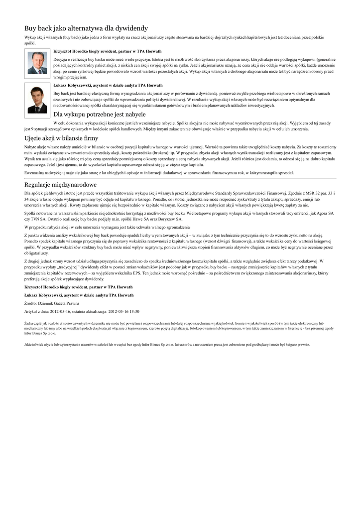 Buy back jako alternatywa dla dywidendy Wykup akcji własnych (buy back) jako jedna z form wypłaty na rzecz akcjonariuszy często stosowana na bardziej dojrzałych rynkach kapitałowych jest też doceniana przez polskie spółki. Krzysztof Horodko biegły rewident, partner w TPA Horwath Decyzja o realizacji buy backu może mieć wiele przyczyn. Istotna jest tu możliwość skorzystania przez akcjonariuszy, których akcje nie podlegają wykupowi (generalnie posiadających kontrolny pakiet akcji), z niskich cen akcji swojej spółki na rynku. Jeżeli akcjonariusze uznają, że cena akcji nie oddaje wartości spółki, każde umorzenie akcji po cenie rynkowej będzie powodowało wzrost wartości pozostałych akcji. Wykup akcji własnych z drobnego akcjonariatu może też być narzędziem obrony przed wrogim przejęciem. Łukasz Kobyszewski, asystent w dziale audytu TPA Horwath Buy back jest bardziej elastyczną formą wynagradzania akcjonariuszy w porównaniu z dywidendą, ponieważ zwykle przebiega wieloetapowo w określonych ramach czasowych i nie zobowiązuje spółki do wprowadzania polityki dywidendowej. W rezultacie wykup akcji własnych może być rozwiązaniem optymalnym dla niedowartościowanej spółki charakteryzującej się wysokim stanem gotówkowym i brakiem planowanych nakładów inwestycyjnych. Dla wykupu potrzebne jest nabycie W celu dokonania wykupu akcji konieczne jest ich wcześniejsze nabycie. Spółka akcyjna nie może nabywać wyemitowanych przez nią akcji. Wyjątkiem od tej zasady jest 9 sytuacji szczegółowo opisanych w kodeksie spółek handlowych. Między innymi zakaz ten nie obowiązuje właśnie w przypadku nabycia akcji w celu ich umorzenia. Ujęcie akcji w bilansie firmy Nabyte akcje własne należy umieścić w bilansie w osobnej pozycji kapitału własnego w wartości ujemnej. Wartość ta powinna także uwzględniać koszty nabycia. Za koszty te rozumiemy m.in. wydatki związane z wezwaniem do sprzedaży akcji, koszty pośrednika (brokera) itp. W przypadku zbycia akcji własnych wynik transakcji rozliczany jest z kapitałem zapasowym. Wynik ten ustala się jako różnicę między ceną sprzedaży pomniejszoną o koszty sprzedaży a ceną nabycia zbywanych akcji. Jeżeli różnica jest dodatnia, to odnosi się ją na dobro kapitału zapasowego. Jeżeli jest ujemna, to do wysokości kapitału zapasowego odnosi się ją w ciężar tego kapitału. Ewentualną nadwyżkę ujmuje się jako stratę z lat ubiegłych i opisuje w informacji dodatkowej w sprawozdaniu finansowym za rok, w którym nastąpiła sprzedaż. Regulacje międzynarodowe Dla spółek giełdowych istotne jest przede wszystkim traktowanie wykupu akcji własnych przez Międzynarodowe Standardy Sprawozdawczości Finansowej. Zgodnie z MSR 32 par. 33 i 34 akcje własne objęte wykupem powinny być odjęte od kapitału własnego. Ponadto, co istotne, jednostka nie może rozpoznać zysku/straty z tytułu zakupu, sprzedaży, emisji lub umorzenia własnych akcji. Kwoty zapłacone ujmuje się bezpośrednio w kapitale własnym. Koszty związane z nabyciem akcji własnych powiększają kwotę zapłaty za nie. Spółki notowane na warszawskim parkiecie niejednokrotnie korzystają z możliwości buy backu. Wieloetapowe programy wykupu akcji własnych stosowali tacy emitenci, jak Agora SA czy TVN SA. Ostatnio realizację buy backu podjęły m.in. spółki Hawe SA oraz Boryszew SA. W przypadku nabycia akcji w celu umorzenia wymagana jest także uchwała walnego zgromadzenia Z punktu widzenia analizy wskaźnikowej buy back powoduje spadek liczby wyemitowanych akcji – w związku z tym technicznie przyczynia się to do wzrostu zysku netto na akcję. Ponadto spadek kapitału własnego przyczynia się do poprawy wskaźnika rentowności z kapitału własnego (wzrost dźwigni finansowej), a także wskaźnika ceny do wartości księgowej spółki. W przypadku wskaźników struktury buy back może mieć wpływ negatywny, ponieważ zwiększa stopień finansowania aktywów długiem, co może być negatywnie oceniane przez obligatariuszy. Z drugiej jednak strony wzrost udziału długu przyczynia się zasadniczo do spadku średnioważonego kosztu kapitału spółki, a także względnie zwiększa efekt tarczy podatkowej. W przypadku wypłaty „tradycyjnej” dywidendy efekt w postaci zmian wskaźników jest podobny jak w przypadku buy backu – następuje zmniejszenie kapitałów własnych z tytułu zmniejszenia kapitałów rezerwowych – za wyjątkiem wskaźnika EPS. Ten jednak może wzrosnąć pośrednio – za pośrednictwem zwiększonego zainteresowania akcjonariuszy, którzy preferują akcje spółek wypłacające dywidendy. Krzysztof Horodko biegły rewident, partner w TPA Horwath Łukasz Kobyszewski, asystent w dziale audytu TPA Horwath Źródło: Dziennik Gazeta Prawna Artykuł z dnia: 2012-05-16, ostatnia aktualizacja: 2012-05-16 13:30 Żadna część jak i całość utworów zawartych w dzienniku nie może być powielana i rozpowszechniania lub dalej rozpowszechniana w jakiejkolwiek formie i w jakikolwiek sposób (w tym także elektroniczny lub mechaniczny lub inny albo na wszelkich polach eksploatacji) włącznie z kopiowaniem, szeroko pojętą digitalizacją, fotokopiowaniem lub kopiowaniem, w tym także zamieszczaniem w Internecie - bez pisemnej zgody Infor Biznes Sp. z o.o. Jakiekolwiek użycie lub wykorzystanie utworów w całości lub w części bez zgody Infor Biznes Sp. z o.o. lub autorów z naruszeniem prawa jest zabronione pod groźbą kary i może być ścigane prawnie.