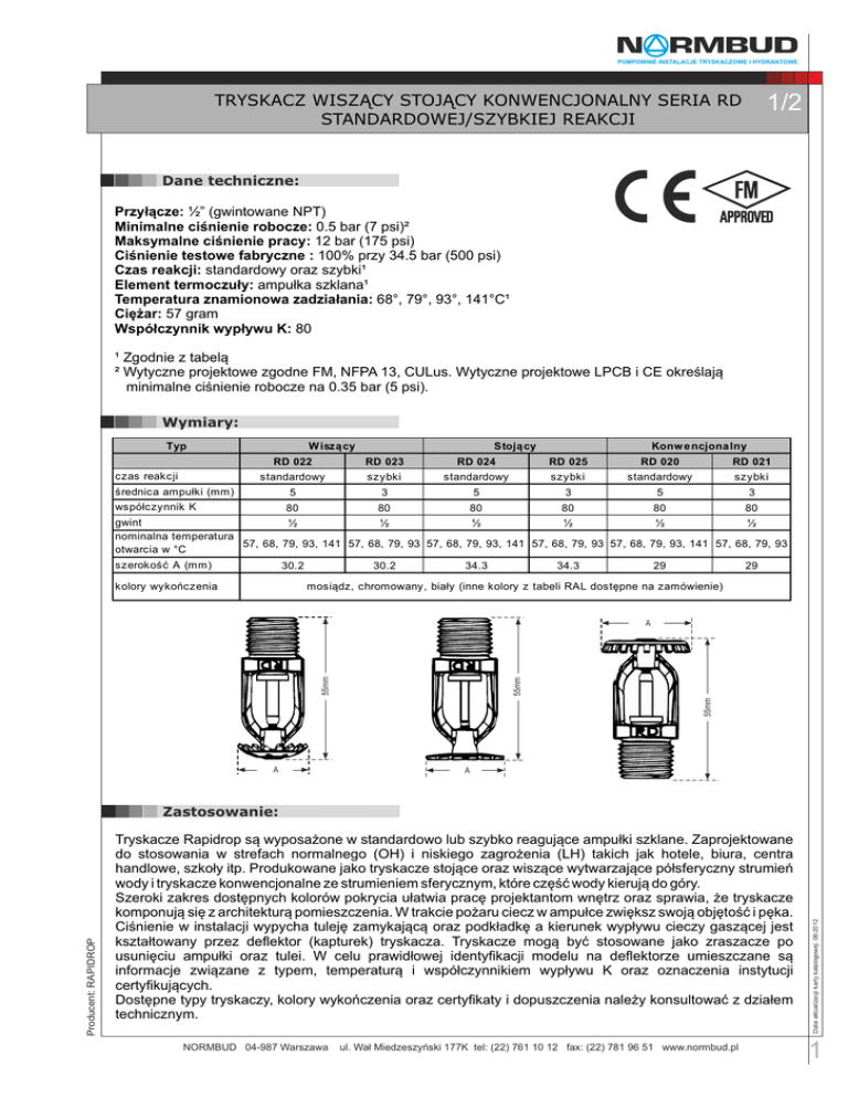 POMPOWNIE INSTALACJE TRYSKACZOWE I HYDRANTOWE 1/2 TRYSKACZ WISZĄCY STOJĄCY KONWENCJONALNY SERIA RD STANDARDOWEJ/SZYBKIEJ REAKCJI Dane techniczne: Przyłącze: ½” (gwintowane NPT) Minimalne ciśnienie robocze: 0.5 bar (7 psi)² Maksymalne ciśnienie pracy: 12 bar (175 psi) Ciśnienie testowe fabryczne : 100% przy 34.5 bar (500 psi) Czas reakcji: standardowy oraz szybki¹ Element termoczuły: ampułka szklana¹ Temperatura znamionowa zadziałania: 68°, 79°, 93°, 141°C¹ Ciężar: 57 gram Współczynnik wypływu K: 80 ¹ Zgodnie z tabelą ² Wytyczne projektowe zgodne FM, NFPA 13, CULus. Wytyczne projektowe LPCB i CE określają minimalne ciśnienie robocze na 0.35 bar (5 psi). Wymiary: Typ czas reakcji W iszą cy Stoją cy Konw e ncjona lny RD 022 RD 023 RD 024 RD 025 RD 020 RD 021 standardowy szybki standardowy szybki standardowy szybki 5 3 5 3 5 3 80 80 80 80 80 80 średnica ampułki (mm) współczynnik K gwint ½ ½ ½ ½ ½ ½ nominalna temperatura 57, 68, 79, 93, 141 57, 68, 79, 93 57, 68, 79, 93, 141 57, 68, 79, 93 57, 68, 79, 93, 141 57, 68, 79, 93 otwarcia w °C szerokość A (mm) 30.2 kolory wykończenia 30.2 34.3 34.3 29 29 mosiądz, chromowany, biały (inne kolory z tabeli RAL dostępne na zamówienie) 55mm 55mm 55mm A A A Tryskacze Rapidrop są wyposażone w standardowo lub szybko reagujące ampułki szklane. Zaprojektowane do stosowania w strefach normalnego (OH) i niskiego zagrożenia (LH) takich jak hotele, biura, centra handlowe, szkoły itp. Produkowane jako tryskacze stojące oraz wiszące wytwarzające półsferyczny strumień wody i tryskacze konwencjonalne ze strumieniem sferycznym, które część wody kierują do góry. Szeroki zakres dostępnych kolorów pokrycia ułatwia pracę projektantom wnętrz oraz sprawia, że tryskacze komponują się z architekturą pomieszczenia. W trakcie pożaru ciecz w ampułce zwiększ swoją objętość i pęka. Ciśnienie w instalacji wypycha tuleję zamykającą oraz podkładkę a kierunek wypływu cieczy gaszącej jest kształtowany przez deflektor (kapturek) tryskacza. Tryskacze mogą być stosowane jako zraszacze po usunięciu ampułki oraz tulei. W celu prawidłowej identyfikacji modelu na deflektorze umieszczane są informacje związane z typem, temperaturą i współczynnikiem wypływu K oraz oznaczenia instytucji certyfikujących. Dostępne typy tryskaczy, kolory wykończenia oraz certyfikaty i dopuszczenia należy konsultować z działem technicznym. NORMBUD 04-987 Warszawa ul. Wał Miedzeszyński 177K tel: (22) 761 10 12 fax: (22) 781 96 51 www.normbud.pl Data aktualizacji karty katalogowej: 06-2012 Producent: RAPIDROP Zastosowanie: 1 POMPOWNIE INSTALACJE TRYSKACZOWE I HYDRANTOWE 2/2 TRYSKACZ WISZĄCY STOJĄCY KONWENCJONALNY SERIA RD STANDARDOWEJ/SZYBKIEJ REAKCJI Zastosowanie: KONWENCJONALNY WISZĄCY/STOJĄCY Ciśnienie Pracy 2 Bary Ciśnienie Pracy 0,5 Bary 3,08 3,00 Sufit 2,50 2,00 1,50 1,00 0,50 Podłoga 4 3 2 1 0 1 2 3 Wysokość w metrach Rd020 i RD021 Tryskacz konwencjonalny może być zainstalowany w pozycji stojącej lub wiszącej wytwarzając sferyczny s t r u m i e ń w o d y, c z ę ś ć strumienia wody wyrzucana jest do góry w kierunku sufitu. 4 Promień w metrach WISZĄCY Ciśnienie Pracy 2 Bary Ciśnienie Pracy 0,5 Bary 3,08 3,00 Sufit 2,50 2,00 1,50 1,00 0,50 Podłoga 4 3 2 1 0 1 2 3 Wysokość w metrach Rd022 i RD023 Tryskacz wiszący może byc zainstalowany wyłącznie w pozycji pionowej (deflektor skierowany w dół) dając półsferyczny strumień wody poniżej deflektora. Niewielka ilość wody może być skierowana w górę. 4 Promień w metrach STOJĄCY Ciśnienie Pracy 2 Bary Ciśnienie Pracy 0,5 Bary 3,08 3,00 Sufit 2,50 2,00 1,50 1,00 0,50 Podłoga 4 3 2 1 0 1 2 3 Wysokość w metrach RD024 i RD025 Tryskacz stojący może byc zainstalowany wyłącznie w pozycji pionowej (deflektor skierowany w górę) dając półsferyczny strumień wody poniżej deflektora. Niewielką ilość wody może skierowana w górę. 4 Producent: RAPIDROP Data aktualizacji karty katalogowej: 06-2012 Promień w metrach NORMBUD 04-987 Warszawa ul. Wał Miedzeszyński 177K tel: (22) 761 10 12 fax: (22) 781 96 51 www.normbud.pl 2