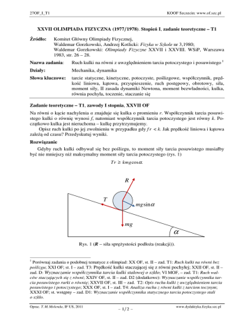 27OF_I_T1 KOOF Szczecin: www.of.szc.pl XXVII OLIMPIADA FIZYCZNA (1977/1978). Stopień I, zadanie teoretyczne – T1 Źródło: Komitet Główny Olimpiady Fizycznej, Waldemar Gorzkowski, Andrzej Kotlicki: Fizyka w Szkole nr 3,1980; Waldemar Gorzkowski: Olimpiady Fizyczne XXVII i XXVIII. WSiP, Warszawa 1983, str. 26 – 28. Nazwa zadania: Ruch kulki na równi z uwzględnieniem tarcia potoczystego i posuwistego 1 Działy: Mechanika, dynamika Słowa kluczowe: tarcie statyczne, kinetyczne, potoczyste, poślizgowe, współczynnik, prędkość liniowa, kątowa, przyspieszenie, ruch postępowy, obrotowy, siła, moment siły, II zasada dynamiki Newtona, moment bezwładności, kulka, równia pochyła, toczenie, staczanie się Zadanie teoretyczne – T1, zawody I stopnia, XXVII OF Na równi o kącie nachylenia α znajduje się kulka o promieniu r. Współczynnik tarcia posuwistego kulki o równię wynosi f, natomiast współczynnik tarcia potoczystego jest równy k. Początkowo kulka jest nieruchoma – kulkę przytrzymujemy. Opisz ruch kulki po jej zwolnieniu w przypadku gdy f r < k. Jak prędkość liniowa i kątowa zależą od czasu? Przedyskutuj wyniki. Rozwiązanie Gdyby ruch kulki odbywał się bez poślizgu, to moment siły tarcia posuwistego musiałby być nie mniejszy niż maksymalny moment siły tarcia potoczystego (rys. 1) Tr ≥ kmgcosα . R T mgsinα mg α Rys. 1 (R – siła sprężystości podłoża (reakcji)). 1 Porównaj zadania o podobnej tematyce z olimpiad: XX OF, st. II – zad. T1: Ruch kulki na równi bez poślizgu; XXI OF; st. I – zad. T3: Prędkość kulki staczającej się z równi pochyłej; XXII OF, st. II – zad. D: Wyznaczanie współczynnika tarcia kulki stalowej o szkło; VI MOF, – zad. T1: Ruch walców staczających się z równi; XXIV OF, st. II – zad. D2 (dodatkowe): Wyznaczanie współczynnika tarcia posuwistego rurki o równię; XXVII OF, st. III – zad. T2: Opis ruchu kulki z uwzględnieniem tarcia posuwistego i potoczystego; XXX OF, st. I – zad. T4: Analiza ruchu z równi kulki z tarciem tocznym; XXXI OF; st. wstępny – zad. D1: Wyznaczanie współczynnika statycznego tarcia potoczystego stali o szkło. Oprac. T. M. Molenda, IF US, 2011 - 1/2 - www.dydaktyka.fizyka.szc.pl 27OF_I_T1 KOOF Szczecin: www.of.szc.pl Wiemy jednak, że musi zachodzić nierówność T ≤ f mgcosα . Z nierówności tych wynika, że musiałby zachodzić związek rf mgcosα ≥ kmgcosα , czyli rf ≥ k wbrew warunkom podanym w treści zadania. Zatem ruch bez poślizgu jest niemożliwy. Równanie ruchu dla środka kulki w kierunku równoległym do równi jest następujące ma = mgsinα – T. (1) Równanie ruchu obrotowego względem środka kulki jest 2 5 mr 2ε = Tr − M , (2) gdzie: a i ε oznaczają odpowiednio przyspieszenie liniowe i kątowe kulki, M – moment siły tarcia potoczystego. Ze względu na związek k > f r po prawej stronie wzoru (2) mamy zero. (Moment M osiąga wartość T r nie dochodząc do swej wartości maksymalnej równej Mmax = kmgcosα . Zatem ε = 0. Wynika stąd, że kulka nie będzie się obracać, gdyż nie obracała się w chwili początkowej. Prawa strona wzoru (1) nie może mieć wartości ujemnej, bo tarcie nie może popychać kulki w górę. Zatem poniżej kata α określonego wzorem mg sin α 0 = fmg cosα 0 czyli tg α 0 = f , siła tarcia T będzie równa mg sin α. Przyspieszenie kulki będzie wtedy równe zeru. Ponieważ kulka początkowo spoczywała, więc będzie w tym wypadku spoczywać cały czas. Natomiast powyżej kąta α 0 przyspieszenie kulki będzie równe a = g (sin α − f cos α ) . Prędkość kulki będzie się wtedy zmieniać według wzoru υ = g (sin α − f cos α )t. Wydaje się, że w zadaniu powyższym najwięcej trudności sprawiło uczestnikom samo pojęcie tarcia potoczystego, a przede wszystkim to, że moment tarcia potoczystego nie musi być równy swej wartości maksymalnej wynoszącej kmgcosα . Jest to analogiczne do oczywistego faktu, że siła tarcia posuwistego nie musi być równa maksymalnej swej wartości ƒP (gdzie P oznacza nacisk). Wiadomo, że jeżeli próbujemy poruszyć jakieś ciało siłą mniejszą od maksymalnej siły tarcia, to ruch ciała byłby przeciwny do zwrotu siły z jaką działamy. Jest to oczywiście nieprawda. Czytelników zainteresowanych zjawiskiem tarcia potoczystego (tocznego) odsyłamy do Encyklopedii Fizyki. Oprac. T. M. Molenda, IF US, 2011 - 2/2 - www.dydaktyka.fizyka.szc.pl