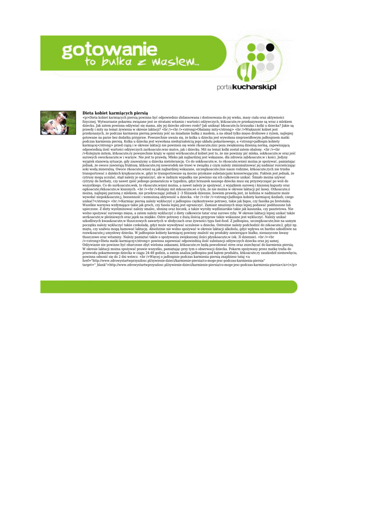 Dieta kobiet karmiących piersią <p>Dieta kobiet karmiących piersią powinna być odpowiednio zbilansowana i dostosowana do jej wieku, masy ciała oraz aktywności fizycznej. Wytwarzanie pokarmu związane jest ze stratami witamin i wartości odżywczych, które przekazywane są wraz z mlekiem dziecku. Jak zatem powinna odżywiać się mama, aby jej dziecko zdrowo rosło? Jak uniknąć bólu brzuszka i kolki u dziecka? Jakie są prawdy i mity na temat żywienia w okresie laktacji? <br /><br /><strong>Obalamy mity</strong> <br />Większość kobiet jest przekonanych, że podczas karmienia piersią powinny jeść na śniadanie bułkę z masłem, a na obiad tylko mięso drobiowe z ryżem, najlepiej gotowane na parze bez dodatku przypraw. Powszechnie uważa się, że kolka u dziecka jest wywołana nieprawidłowym jadłospisem matki podczas karmienia piersią. Kolka u dziecka jest wywołana niedojrzałością jego układu pokarmowego, a <strong>jadłospis kobiety karmiącej</strong> przed ciążą i w okresie laktacji nie powinien się wiele różnic poza zwiększoną dzienną normą, zapewniającą odpowiednią ilość wartości odżywczych zarówno matce, jak i dziecku. Mit na temat kolki został zatem obalony. <br /><br />Kolejnym mitem, który powszechnie krąży w opinii wśród kobiet jest to, że nie powinny pić mleka, soków oraz jeść surowych owoców i warzyw. Nie jest to prawdą. Mleko jak najbardziej jest wskazane, dla zdrowia zębów i kości. Jedyny wyjątek stanowią sytuacje, gdy zauważymy u dziecka nietolerancję. Co do soków, to również można je spożywać, pamiętając jednak, że owoce zawierają fruktozę, której noworodek nie trawi w związku z czym należy zminimalizować jej nadmiar rozcieńczając soki wodą mineralną. Owoce również są jak najbardziej wskazane, szczególnie nasze rodzime, których nie trzeba transportować z dalekich krajów, gdyż te transportowane są mocno pryskane substancjami konserwującymi. Faktem jest jednak, że cytrusy mogą uczulać, stąd należy je ograniczyć, ale w żadnym wypadku nie powinno się ich całkowicie unikać. Śmiało można używać cytryny do herbaty, czy nawet zjeść jednego pomarańcza w tygodniu, gdyż brzuszek naszego dziecka musi się przyzwyczajać po woli do wszystkiego. Co do surówek, to również można, a nawet należy je spożywać, z wyjątkiem surowej i kiszonej kapusty oraz ogórków kiszonych. <br /><br />Kolejny mit mówi o tym, że nie można w okresie laktacji pić kawy. Otóż można, najlepiej parzoną z mlekiem, nie przekraczając jednak 2 -3 filiżanek dziennie, bowiem prawdą jest, że kofeina w nadmiarze może wywołać niepokój, bezsenność i wzmożoną aktywność u dziecka. <br /><br /><strong>Jadłospis kobiety karmiącej – czego unikać?</strong> <br />Karmiąc piersią należy wykluczyć z jadłospisu ciężkostrawne potrawy, takie jak bigos, czy fasolka po bretońsku. Wszelkie warzywa wzdymające takie jak groch, czy fasola lepiej jest ograniczyć. Zamiast smażonych mięs lepiej podawać podduszone lub upieczone. Z diety wyeliminować należy smalec, słoninę oraz boczek, a także wyroby wędliniarskie takie jak kaszanka, czy pasztetowa. Nie wolno spożywać surowego mięsa, a zatem należy wykluczyć z diety całkowicie tatar oraz surowe ryby. W okresie laktacji lepiej unikać także serów pleśniowych oraz jajek na miękko. Ostre potrawy z dużą ilością przypraw także wskazane jest wykluczyć. Należy unikać szkodliwych kwasów tłuszczowych zawartych w słodyczach oraz żywności typu fast-food. Z jadłospisu, szczególnie na samym początku należy wykluczyć także czekoladę, gdyż może wywoływać uczulenie u dziecka. Ostrożnie należy podchodzić do ziół, gdyż np. mięta, czy szałwia mogą hamować laktację. Absolutnie nie wolno spożywać w okresie laktacji alkoholu, gdyż wpływa on bardzo szkodliwie na rozwój umysłowy dziecka. W jadłospisie kobiety karmiącej powinny znaleźć się produkty zawierające białko, nienasycone kwasy tłuszczowe oraz witaminy. Należy pamiętać także o spożywaniu zwiększonej ilości płynów (ok. 3l dziennie). <br /><br /><strong>Dieta matki karmiącej</strong> powinna zapewniać odpowiednią ilość substancji odżywczych dziecku oraz jej samej. Odżywianie nie powinno być obarczone zbyt wieloma zakazami, które będą powodować stres oraz zniechęcać do karmienia piersią. W okresie laktacji można spożywać prawie wszystko, pamiętając przy tym o obserwacji dziecka. Pokarm spożywany przez matkę trafia do przewodu pokarmowego dziecka w ciągu 24-48 godzin, a zatem analiza jadłospisu pod kątem produktu, który zaszkodził niemowlęciu, powinna odnosić się do 2 dni wstecz. <br />Więcej o jadłospisie podczas karmienia piersią znajdziesz tutaj <a href="http://www.zdrowystartwprzyszlosc.pl/zywienie-dzieci/karmienie-piersia/co-moge-jesc-podczas-karmienia-piersia" target="_blank">http://www.zdrowystartwprzyszlosc.pl/zywienie-dzieci/karmienie-piersia/co-moge-jesc-podczas-karmienia-piersia</a>)</p>