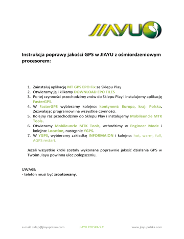 Instrukcja poprawy jakości GPS w JIAYU z ośmiordzeniowym procesorem: 1. Zainstaluj aplikację MT GPS EPO Fix ze Sklepu Play 2. Otwieramy ją i klikamy DOWNLOAD EPO FILES 3. Po tej czynności przechodzimy znów do Sklepu Play i instalujemy aplikację FasterGPS. 4. W FasterGPS wybieramy kolejno: kontynent: Europa, kraj: Polska. Zezwalając programowi na wszystkie czynności. 5. Kolejny raz przechodzimy do Sklepu Play i instalujemy Mobileuncle MTK Tools. 6. Otwieramy Mobileuncle MTK Tools, wchodzimy w Engineer Mode i kolejno: Location, następnie YGPS. 7. W YGPS, wybieramy zakładkę INFORMAION i kolejno: hot, warm, full, AGPS restart. Jeżeli wszystkie kroki zostały wykonane poprawnie jakość działania GPS w Twoim Jiayu powinna ulec polepszeniu. UWAGI: - telefon musi być zrootowany, e-mail: [email protected] JIAYU POLSKA S.C. www.jiayupolska.com