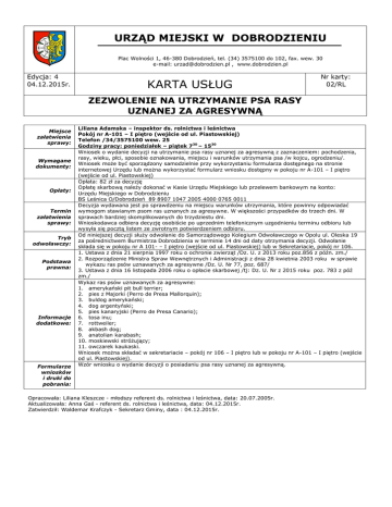 URZĄD MIEJSKI W DOBRODZIENIU Plac Wolności 1, 46-380 Dobrodzień, tel. (34) 3575100 do 102, fax. wew. 30 e-mail: [email protected] , www.dobrodzien.pl Edycja: 4 04.12.2015r. KARTA USŁUG Nr karty: 02/RL ZEZWOLENIE NA UTRZYMANIE PSA RASY UZNANEJ ZA AGRESYWNĄ Miejsce załatwienia sprawy: Wymagane dokumenty: Opłaty: Termin załatwienia sprawy: Tryb odwoławczy: Podstawa prawna: Informacje dodatkowe: Formularze wniosków i druki do pobrania: Liliana Adamska – inspektor ds. rolnictwa i leśnictwa Pokój nr A-101 – I piętro (wejście od ul. Piastowskiej) Telefon /34/3575100 wew. 25 Godziny pracy: poniedziałek – piątek 730 – 1530 Wniosek o wydanie decyzji na utrzymanie psa rasy uznanej za agresywną z zaznaczeniem: pochodzenia, rasy, wieku, płci, sposobie oznakowania, miejscu i warunków utrzymania psa /w kojcu, ogrodzeniu/. Wniosek może być sporządzony samodzielnie przy wykorzystaniu formularza dostępnego na stronie internetowej Urzędu lub można wykorzystać formularz wniosku dostępny w pokoju nr A-101 – I piętro (wejście od ul. Piastowskiej) Opłata: 82 zł za decyzję Opłatę skarbową należy dokonać w Kasie Urzędu Miejskiego lub przelewem bankowym na konto: Urzędu Miejskiego w Dobrodzieniu BS Leśnica O/Dobrodzień 89 8907 1047 2005 4000 0765 0011 Decyzja wydawana jest po sprawdzeniu na miejscu warunków utrzymania, które powinny odpowiadać wymogom stawianym psom ras uznanych za agresywne. W większości przypadków do trzech dni. W sprawach bardziej skomplikowanych do trzydziestu dni. Wnioskodawca odbiera decyzję osobiście po uprzednim telefonicznym uzgodnieniu terminu odbioru lub wysyła się pocztą listem ze zwrotnym potwierdzeniem odbioru. Od niniejszej decyzji służy odwołanie do Samorządowego Kolegium Odwoławczego w Opolu ul. Oleska 19 za pośrednictwem Burmistrza Dobrodzienia w terminie 14 dni od daty otrzymania decyzji. Odwołanie składa się w pokoju nr A 101- – I piętro (wejście od ul. Piastowskiej) lub w Sekretariacie, pokój nr 106. 1. Ustawa z dnia 21 sierpnia 1997 roku o ochronie zwierząt /Dz. U. z 2013 roku poz.856 z późn. zm./ 2. Rozporządzenie Ministra Spraw Wewnętrznych i Administracji z dnia 28 kwietnia 2003 roku w sprawie wykazu ras psów uznawanych za agresywne /Dz. U. Nr 77, poz. 687/ 3. Ustawa z dnia 16 listopada 2006 roku o opłacie skarbowej /tj: Dz. U. Nr z 2015 roku poz. 783 z póź zm./ Wykaz ras psów uznawanych za agresywne: 1. amerykański pit bull terrier; 2. pies z Majorki (Perro de Presa Mallorquin); 3. buldog amerykański; 4. dog argentyński; 5. pies kanaryjski (Perro de Presa Canario); 6. tosa inu; 7. rottweiler; 8. akbash dog; 9. anatolian karabash; 10. moskiewski stróżujący; 11. owczarek kaukaski. Wniosek można składać w sekretariacie – pokój nr 106 – I piętro lub w pokoju nr A-101 – I piętro (wejście od ul. Piastowskiej). Wzór wniosku o wydanie decyzji o posiadaniu psa rasy uznanej za agresywną. Opracowała: Liliana Kleszcze - młodszy referent ds. rolnictwa i leśnictwa, data: 20.07.2005r. Aktualizowała: Anna Gaś - referent ds. rolnictwa i leśnictwa, data: 04.12.2015r. Zatwierdził: Waldemar Krafczyk - Sekretarz Gminy, data : 04.12.2015r.