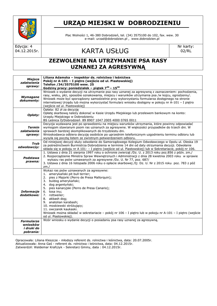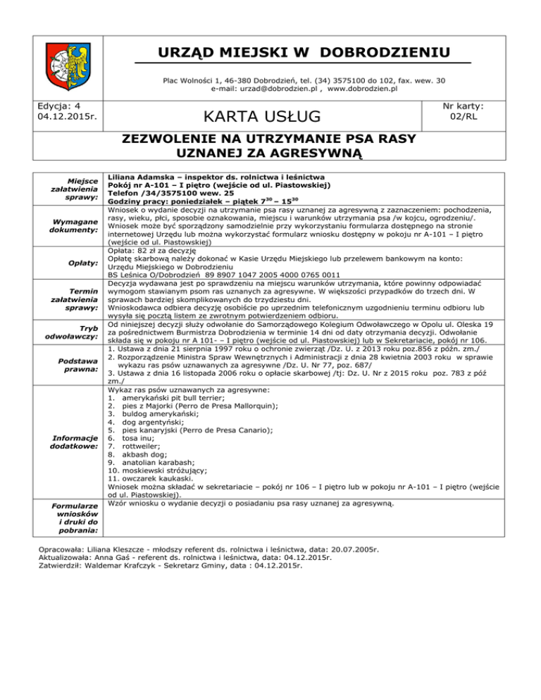 KARTA USŁUG - zezwolenie na utrzymanie psa rasy uznanej za