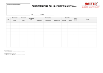 Nazwa lub pieczątka zamawiającego ZAMÓWIENIE NA ŻALUZJE DREWNIANE 50mm Nr ……………... z dnia …………………… Szerokość Wysokość Lp. (mm) (mm) Termin dostawy : …………………………… Podpis zamawiającego…………………….. Kolor taśmy Sterowanie L/P Drewniana Laminowana Drabinka Bambusowa Sznurek Taśma Ilość (szt.) Uwagi