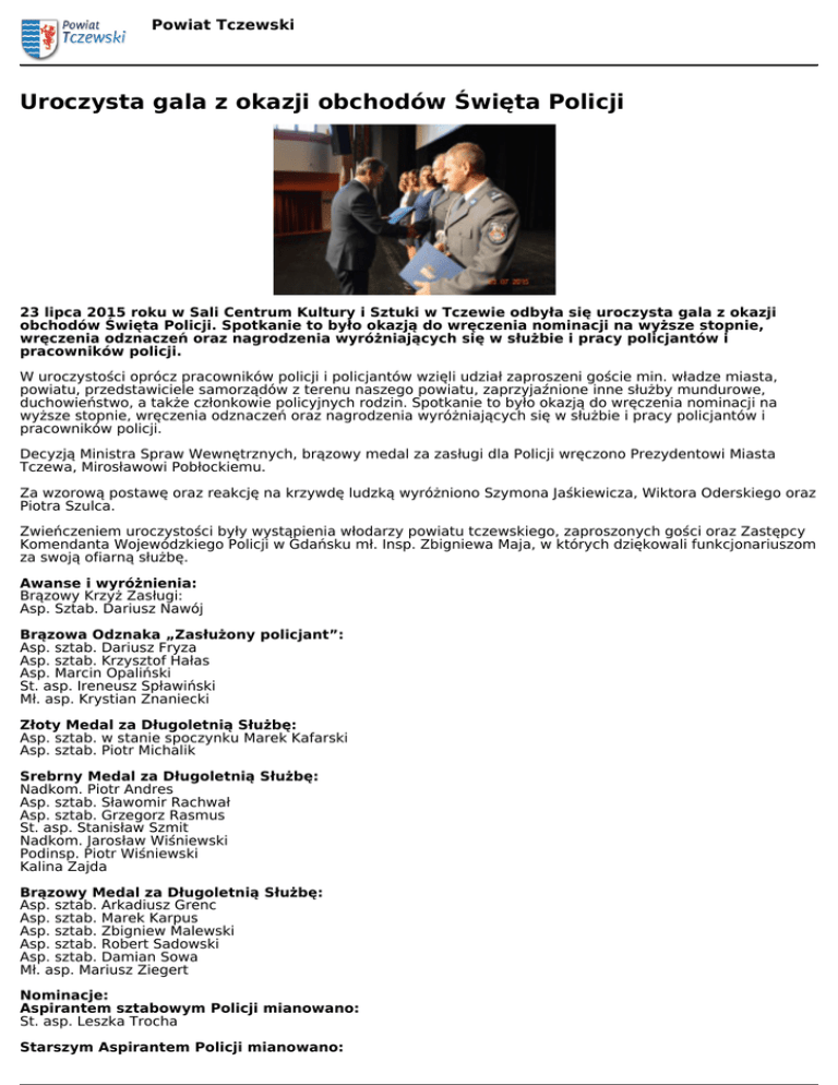 Powiat Tczewski Uroczysta gala z okazji obchodów Święta Policji 23 lipca 2015 roku w Sali Centrum Kultury i Sztuki w Tczewie odbyła się uroczysta gala z okazji obchodów Święta Policji. Spotkanie to było okazją do wręczenia nominacji na wyższe stopnie, wręczenia odznaczeń oraz nagrodzenia wyróżniających się w służbie i pracy policjantów i pracowników policji. W uroczystości oprócz pracowników policji i policjantów wzięli udział zaproszeni goście min. władze miasta, powiatu, przedstawiciele samorządów z terenu naszego powiatu, zaprzyjaźnione inne służby mundurowe, duchowieństwo, a także członkowie policyjnych rodzin. Spotkanie to było okazją do wręczenia nominacji na wyższe stopnie, wręczenia odznaczeń oraz nagrodzenia wyróżniających się w służbie i pracy policjantów i pracowników policji. Decyzją Ministra Spraw Wewnętrznych, brązowy medal za zasługi dla Policji wręczono Prezydentowi Miasta Tczewa, Mirosławowi Pobłockiemu. Za wzorową postawę oraz reakcję na krzywdę ludzką wyróżniono Szymona Jaśkiewicza, Wiktora Oderskiego oraz Piotra Szulca. Zwieńczeniem uroczystości były wystąpienia włodarzy powiatu tczewskiego, zaproszonych gości oraz Zastępcy Komendanta Wojewódzkiego Policji w Gdańsku mł. Insp. Zbigniewa Maja, w których dziękowali funkcjonariuszom za swoją ofiarną służbę. Awanse i wyróżnienia: Brązowy Krzyż Zasługi: Asp. Sztab. Dariusz Nawój Brązowa Odznaka „Zasłużony policjant”: Asp. sztab. Dariusz Fryza Asp. sztab. Krzysztof Hałas Asp. Marcin Opaliński St. asp. Ireneusz Spławiński Mł. asp. Krystian Znaniecki Złoty Medal za Długoletnią Służbę: Asp. sztab. w stanie spoczynku Marek Kafarski Asp. sztab. Piotr Michalik Srebrny Medal za Długoletnią Służbę: Nadkom. Piotr Andres Asp. sztab. Sławomir Rachwał Asp. sztab. Grzegorz Rasmus St. asp. Stanisław Szmit Nadkom. Jarosław Wiśniewski Podinsp. Piotr Wiśniewski Kalina Zajda Brązowy Medal za Długoletnią Służbę: Asp. sztab. Arkadiusz Grenc Asp. sztab. Marek Karpus Asp. sztab. Zbigniew Malewski Asp. sztab. Robert Sadowski Asp. sztab. Damian Sowa Mł. asp. Mariusz Ziegert Nominacje: Aspirantem sztabowym Policji mianowano: St. asp. Leszka Trocha Starszym Aspirantem Policji mianowano: Powiat Tczewski Asp. Marcina Sarkowicza Aspirantem Policji: Mł. Asp. Jacka Chełchowskiego Mł. Asp. Damiana Pawłowskiego Starszego Posterunkowego Policji: Post. Tomasza Bendyka Post. Mateusza Jeżewskiego Post. Magdalenę Miętkiewską Post. Przemysława Piekarskiego Post. Radosława Sekulskiego Post. Kamila Tyburskiego Post. Adama Wasilewskiego Sierżantem Policji: St. post. Kingę Brauer St. post. Dawida Jaworskiego St. post. Mateusza Jochim St. post. Michała Kirschner St. post. Mateusza Kukawka St. post. Tomasza Lange St. post. Krzysztofa Lubawskiego St. post. Daniela Lutka St. post. Patrycję Młyńską St. post. Wioletę Nawrocką St. post. Grzegorza Rychłowskiego Starszym Sierżantem Policji: Sierż. Krzysztofa Górskiego Sierż. Łukasza Kaliszewskiego Sierż. Grzegorza Kostka Sierż. Michała Laskowskiego Sierż. Karolinę Loduchowską Sierż. Wioletę Maras – Dudyńską Sierż. Łukasza Rychłowskiego Sierż. Piotra Samujło Sierż. Roberta Treder Sierż. Przemysława Zulewskiego Sierżantem Sztabowym Policji: St. sierż. Marcina Kmieciak St. sierż. Karolinę Las St. sierż. Mateusza Meller St. sierż. Łukasza Miszker St. sierż. Annę Modrzejewską St. sierż. Mateusza Petza Młodszym Aspirantem Policji: Sierż. sztab. Marcina Baranowskiego Sierż. sztab. Beatę Drwięga Sierż. sztab. Joannę Falińską Sierż. sztab. Artura Gałązkę Sierż. sztab. Andrzeja Kąkolewskiego Sierż. sztab. Annę Kinder Sierż. sztab. Annę Krause – Olech Sierż. sztab. Kamila Wołoszyk Aspirantem Policji: Mł. asp. Adama Ćwiklik Mł. asp. Krzysztofa Kapałka Mł. asp. Mariusza Ziegert Starszym Aspirantem Policji: Asp. Krzysztofa Klunder Asp. Magdalenę Małecką – Oroń Asp. Dariusza Nędzę Asp. Sławomira Wedeł Aspirantem Sztabowym Policji: St. asp. Tycjana Andrzejczaka St. asp. Roberta Czochór St. asp. Roberta Godlewskiego St. asp. Marcina Hopa St. asp. Grzegorza Jasnocha St. asp. Andrzeja Kabat Powiat Tczewski St. St. St. St. St. St. St. St. asp. asp. asp. asp. asp. asp. asp. asp. Ireneusza Kluczewskiego Andrzeja Knitter Małgorzatę Modliszewską Mirosława Simon Macieja Skotnickiego Ireneusza Spławińskiego Stanisława Szmit Macieja Wołyńskiego Młodszym Inspektorem Policji: Podinsp. Krzysztofa Bielskiego Komendant Powiatowy Policji w Tczewie za wzorową i pełną poświęcenia dwudziestoletnią służbę w Policji wyróżnił nagrodami rzeczowymi niżej wymienionych policjantów: Asp. Jacka Chełchowskiego St. asp. Grzegorza Felczak Podinsp. Piotra Paul Asp. sztab. Rafała Woźniak Za wzorowo wykonywane obowiązki i zaangażowanie w codziennej pracy z okazji Święta Policji Komendant Powiatowy Policji w Tczewie wyróżnił listami gratulacyjnymi pracowników Policji: Martynę Olszewską, Małgorzatę Wittkowską, Kornelię Wielgosz, Marka Lubiewskiego. Z okazji Święta Policji w uznaniu za wieloletnią, wzorową pracę wykonywaną w Policji dyplomem uznania wyróżniono: Monikę Kwiatkowską. Komendant Główny Policji nadinsp. Krzysztof Gajewski za sprawowanie posługi kapłańskiej w Policji złożył serdeczne podziękowania oraz wyrazy wdzięczności za świadectwo wiary i obecność w środowisku policyjnym księdzu prałatowi Stanisławowi Cieniewiczowi. Nagrody Starosty Tczewskiego dla: Asp. Dawida Ratajczak Sierż. sztab. Wiesława Sulewskiego Beaty Olszewskiej Ewy Guta Kaliny Zajda Nagrody Prezydenta Miasta Tczewa dla: Asp. sztab. Tycjana Andrzejczaka Asp. sztab. Mirosława Chrzonowskiego Sierż. Danuty Jedynak St. sierż. Marka Taflińskiego Sierż. sztab. Dawida Zielińskiego Nagrody Wójta Gminy Tczew: St. asp. Krzysztofa Klunder Sierż. sztab. Macieja Opiela Nagrody Burmistrza Miasta i Gminy Pelplin: Asp. sztab