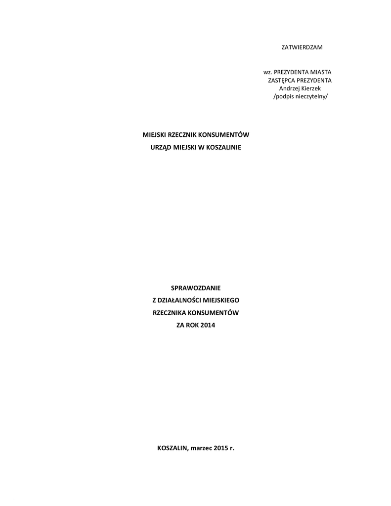 ZATWIERDZAM wz. PREZYDENTA MIASTA ZASTĘPCA PREZYDENTA Andrzej Kierzek /podpis nieczytelny/ MIEJSKI RZECZNIK KONSUMENTÓW URZĄD MIEJSKI W KOSZALINIE SPRAWOZDANIE Z DZIAŁALNOŚCI MIEJSKIEGO RZECZNIKA KONSUMENTÓW ZA ROK 2014 KOSZALIN, marzec 2015 r. 2 SPIS TREŚCI I. WSTĘP I UWAGI OGÓLNE DOTYCZĄCE DZIAŁALNOŚCI MIEJSKIEGO RZECZNIKA KONSUMENTÓW 3 II. REALIZACJA ZADAŃ WYNIKAJĄCYCH Z USTAWY Z DNIA 16 LUTEGO 2007 R. O OCHRONIE KONKURENCJI I KONSUMENTÓW 4 1. 2. 3. 4. 5. 6. 7. III. Zapewnienie bezpłatnego poradnictwa konsumenckiego i informacji prawnej w zakresie ochrony interesów konsumentów Składanie wniosków w sprawie stanowienia i zmiany przepisów prawa miejscowego w zakresie ochrony interesów konsumentów Występowanie do przedsiębiorców w sprawach ochrony praw i interesów konsumentów Wytaczanie powództw na rzecz konsumentów oraz pozwy przygotowywane konsumentom Współdziałanie z UOKiK, organami Inspekcji Handlowej oraz organizacjami konsumenckimi i innymi instytucjami w zakresie ochrony konsumentów Działania o charakterze edukacyjno-informacyjnym Podejmowanie działań wynikających z: • art. 479 (38) Kpc (niedozwolone postanowienia umowne) • ustawy o przeciwdziałaniu nieuczciwym praktykom rynkowym • ustawy o dochodzeniu roszczeń w postępowaniu grupowym • art. 42 ust. 3 uokik (występowanie w sprawach o wykroczenia na szkodę konsumentów) • art. 42 ust. 5 uokik w zw. z art. 63 Kpc (przedstawianie sądowi istotnego poglądu dla sprawy) 4 6 6 9 10 11 12 12 12 12 12 WNIOSKI KOŃCOWE, PROPOZYCJE ZMIAN ZMIERZAJĄCYCH DO POPRAWY REALIZACJI PRAW KONSUMENTÓW 13 1. 2. 13 13 Wnioski dotyczące polepszenia standardów ochrony konsumentów Wnioski dotyczące pracy Rzecznika IV. TABELE 14 3 I. WSTĘP I UWAGI OGÓLNE DOTYCZĄCE DZIAŁALNOŚCI MIEJSKIEGO RZECZNIKA KONSUMENTÓW Zgodnie z art. 4 ust. 1 pkt 18 ustawy z dnia 5 czerwca 1998 r. o samorządzie powiatowym (Dz.U. z 2013 r., poz. 595 ze zm.) do zadań własnych powiatu należy ochrona praw konsumenta. Zadania te wykonuje powiatowy/miejski rzecznik konsumentów. Umocowanie prawne i zakres obowiązków rzecznika regulują przepisy ustawy z dnia 16 lutego 2007 r. o ochronie konkurencji i konsumentów (Dz.U. z 2015 r., poz. 184). W Urzędzie Miejskim w Koszalinie funkcję Miejskiego Rzecznika Konsumentów pełni Krystyna Piwońska. W strukturze organizacyjnej Urzędu Miejski Rzecznik Konsumentów jest bezpośrednio podporządkowany Prezydentowi Miasta Koszalina, co jest zgodne z wymogiem art. 40 ust. 3 ustawy z dnia 16 lutego 2007 r. o ochronie konkurencji i konsumentów. Interesanci przyjmowani są w pok. 322 w gmachu Urzędu Miejskiego w Koszalinie, w poniedziałki w godz. od 9:00 do 17:00, we wtorki, środy, czwartki i piątki w godz. od 8:00 do 14:30. Porady udzielane są także telefonicznie pod bezpośrednim numerem telefonu: (94) 348-88-44 oraz pocztą elektroniczną – adres dostępny na stronie internetowej Urzędu Miejskiego w Koszalinie (e-mail: [email protected]). Struktura biura Rzecznika, stan kadrowy. 1. Województwo Zachodniopomorskie 2. Miasto /Powiat 3. PRK/ MRK 4. Imię i nazwisko Rzecznika Konsumentów Koszalin 5. Wykształcenie (np. wyższe prawnicze) Wyższe prawnicze 6. Funkcja Rzecznika Konsumentów jest wykonywana w pełnym wymiarze czasu pracy (1 etat). Proszę napisać TAK lub NIE. NIE DOTYCZY TYCH RZECZNIKÓW, KTÓRZY ODPOWIEDZIELI „TAK” NA PYT. 6 TAK 7. Funkcja Rzecznika Konsumentów jest wykonywana w niepełnym wymiarze czasu pracy. Proszę zaznaczyć odpowiednią odpowiedź. Miejski Rzecznik Konsumentów Krystyna Piwońska - 3 - 1 - 2 - 1 5 2 5 5 etatu etatu etatu etatu - inne, np. dyżury DOTYCZY TYCH RZECZNIKÓW, KTÓRZY ODPOWIEDZIELI NA PYT. 7 8. Liczba dni/godzin w tygodniu, w których wykonywane są zadania Rzecznika Konsumentów (np. 5 razy w tygodniu po 3 godziny). 9. Rzecznik działa w ramach wyodrębnionego biura (art. 40 pkt 4 ustawy z dnia 16 lutego 2007 r. o ochronie konkurencji i konsument ów Dz. U. Nr 50, poz. 331 ze zm.) Proszę napisać TAK lub NIE. Nie 4 10. Rzecznik Konsumentów w ramach działalności Rzecznika korzysta z pomocy innych osób. Proszę napisać TAK lub NIE. 11. Liczba osób, która stale pomaga Rzecznikowi Konsumentów w wykonywaniu obowiązków Rzecznika (jeśli liczba nie jest stała, to wpisać średnią liczbę). Nie 0 II. REALIZACJA ZADAŃ WYNIKAJĄCYCH Z USTAWY Z DNIA KONSUMENTÓW. 16 LUTEGO 2007 R. O OCHRONIE KONKURENCJI I 1. Zapewnienie bezpłatnego poradnictwa konsumenckiego i informacji prawnej w zakresie ochrony interesów konsumentów (tabela nr 1) Głównym celem działalności Rzecznika Konsumentów jest wzmocnienie słabszej strony - konsumenta w stosunkach z przedsiębiorcą - profesjonalistą oraz zapewnienie pomocy konsumentom w dochodzeniu przez nich roszczeń wobec przedsiębiorców. Celowi temu służy realizacja podstawowego zadania, jakim jest bezpłatne poradnictwo konsumenckie. Spośród 2744 spraw konsumenckich prowadzonych w 2014 r., Rzecznik udzielił 2595 porad, w tym 1455 w zakresie umów sprzedaży, 840 w zakresie usług i 300 w zakresie umów zawieranych poza lokalem przedsiębiorstwa i na odległość. Porady udzielane były osobiście, pisemnie, telefonicznie i e-mailowo. Szczegółową problematykę udzielonych porad zawiera tabela nr 1. Podobnie jak w latach ubiegłych, najliczniejszą grupę porad stanowiły porady w zakresie umów sprzedaży obuwia i odzieży. W roku sprawozdawczym udzielono ich 723. Przyczynami reklamacji obuwia było jego rozklejanie się, pękanie cholewek, wadliwe działanie zamków i odrywanie się ozdób. Odzież konsumenci reklamowali z uwagi na przecieranie się tkanin, prucie na szwach, supełkowanie (pilingowanie) materiału, wychodzenie ociepliny lub jej przemieszczanie się i nierówne rozkładanie, a także rozciąganie lub kurczenie się materiału po praniu lub czyszczeniu. Powodem sporów z przedsiębiorcami była odmowa uznania reklamacji przez sprzedawcę, załatwiani