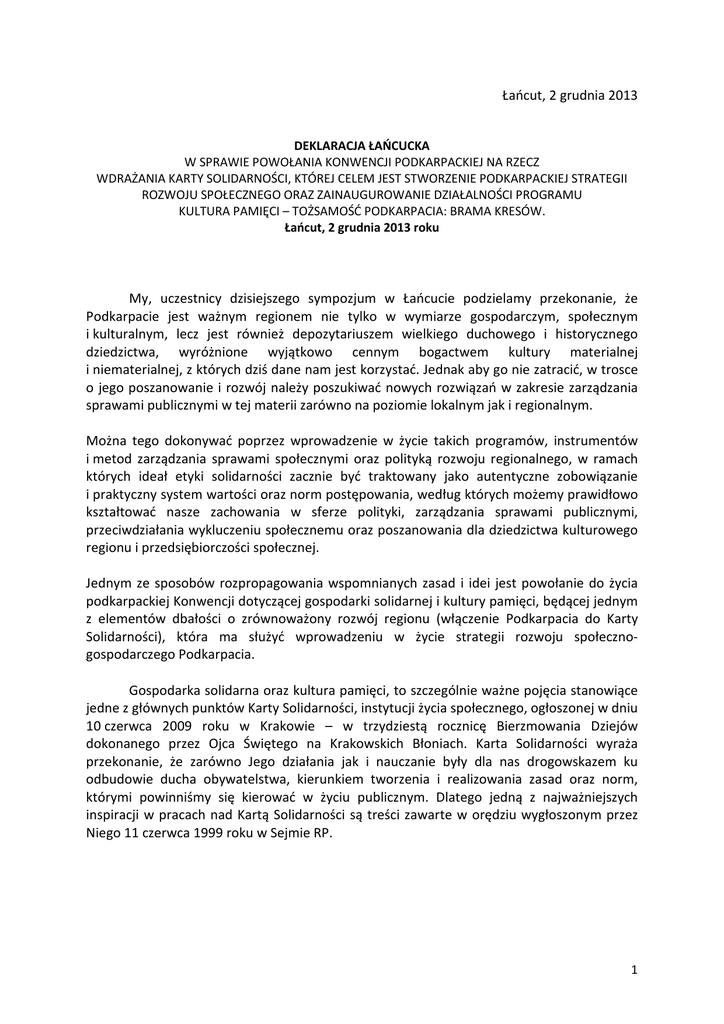 Łańcut, 2 grudnia 2013 DEKLARACJA ŁAŃCUCKA W SPRAWIE POWOŁANIA KONWENCJI PODKARPACKIEJ NA RZECZ WDRAŻANIA KARTY SOLIDARNOŚCI, KTÓREJ CELEM JEST STWORZENIE PODKARPACKIEJ STRATEGII ROZWOJU SPOŁECZNEGO ORAZ ZAINAUGUROWANIE DZIAŁALNOŚCI PROGRAMU KULTURA PAMIĘCI – TOŻSAMOŚĆ PODKARPACIA: BRAMA KRESÓW. Łańcut, 2 grudnia 2013 roku My, uczestnicy dzisiejszego sympozjum w Łańcucie podzielamy przekonanie, że Podkarpacie jest ważnym regionem nie tylko w wymiarze gospodarczym, społecznym i kulturalnym, lecz jest również depozytariuszem wielkiego duchowego i historycznego dziedzictwa, wyróżnione wyjątkowo cennym bogactwem kultury materialnej i niematerialnej, z których dziś dane nam jest korzystać. Jednak aby go nie zatracić, w trosce o jego poszanowanie i rozwój należy poszukiwać nowych rozwiązań w zakresie zarządzania sprawami publicznymi w tej materii zarówno na poziomie lokalnym jak i regionalnym. Można tego dokonywać poprzez wprowadzenie w życie takich programów, instrumentów i metod zarządzania sprawami społecznymi oraz polityką rozwoju regionalnego, w ramach których ideał etyki solidarności zacznie być traktowany jako autentyczne zobowiązanie i praktyczny system wartości oraz norm postępowania, według których możemy prawidłowo kształtować nasze zachowania w sferze polityki, zarządzania sprawami publicznymi, przeciwdziałania wykluczeniu społecznemu oraz poszanowania dla dziedzictwa kulturowego regionu i przedsiębiorczości społecznej. Jednym ze sposobów rozpropagowania wspomnianych zasad i idei jest powołanie do życia podkarpackiej Konwencji dotyczącej gospodarki solidarnej i kultury pamięci, będącej jednym z elementów dbałości o zrównoważony rozwój regionu (włączenie Podkarpacia do Karty Solidarności), która ma służyć wprowadzeniu w życie strategii rozwoju społecznogospodarczego Podkarpacia. Gospodarka solidarna oraz kultura pamięci, to szczególnie ważne pojęcia stanowiące jedne z głównych punktów Karty Solidarności, instytucji życia społecznego, ogłoszonej w dniu 10 czerwca 2009 roku w Krakowie – w trzydziestą rocznicę Bierzmowania Dziejów dokonanego przez Ojca Świętego na Krakowskich Błoniach. Karta Solidarności wyraża przekonanie, że zarówno Jego działania jak i nauczanie były dla nas drogowskazem ku odbudowie ducha obywatelstwa, kierunkiem tworzenia i realizowania zasad oraz norm, którymi powinniśmy się kierować w życiu publicznym. Dlatego jedną z najważniejszych inspiracji w pracach nad Kartą Solidarności są treści zawarte w orędziu wygłoszonym przez Niego 11 czerwca 1999 roku w Sejmie RP. 1 Warunkiem prawidłowego rozwoju społeczeństwa obywatelskiego jest stosowanie zasady solidarności rozumianej zarówno jako budowanie międzyludzkiej więzi, zjednoczenie wspólnoty na rzecz dobra, będącej czynnikiem organizującym życie społeczne, a w następstwie będącej rzeczywistym stymulatorem rozwoju kapitału społecznego, dla tworzenia spójności społecznej oraz dla trwałego i zrównoważonego rozwoju społecznogospodarczego regionu, stanowiącej zachętę do budowania razem wspólnoty obywateli opartej na uniwersalnych zasadach pokoju społecznego, solidarności, sprawiedliwości i wolności. Tylko tak rozumiana solidarność może stanowić punkt wyjścia do gospodarki solidarnej i prospołecznej przedsiębiorczości, w której ta właśnie solidarność ujawnia się jako zasada inspirująca gospodarowanie i życie społeczne (wspólnotowe). Nie należy zapomnieć tu o podkreślanym w Karcie Solidarności, a niezbędnym do prawidłowego wzrostu kapitału społecznego pojęciu, jakim jest samorządność. Jest ona cechą dojrzałego społeczeństwa i oznacza sposób tworzenia dobra wspólnego przede wszystkim przez pryzmat miejsca człowieka w społeczeństwie. Przyjęcie postawy ukierunkowanej na drugiego człowieka wymaga dwóch zasadniczych kompetencji: empatii i uczciwości. W tym kontekście pojęcie „duch solidarności” oznacza otwartość, chęć dostrzeżenia najbardziej potrzebujących, umiejętność zrozumienia ich problemów oraz praktyczną pomoc i zaangażowanie. Niemniej sens samorządności realizuje się tylko wówczas, gdy zasada pomocniczości nie zatrzymuje się na poziomie władzy samorządowej, ale gdy działa głębiej – do obywatela. Obecnie, w dobie przemian społeczno-gospodarczych, wobec postępującego rozwarstwienia społecznego i ekonomicznego, tym większa musi być rola samorządu terytorialnego w realizacji praw osób słabszych. Ponieważ w każdym społeczeństwie są ludzie, którzy nie są w stanie zaspokoić swoich podstawowych potrzeb poprzez pracę, również obowiązkiem wspólnoty społecznej staje się nie tylko udzielenie im pomocy, uważając by nie wzmacniać ich bierności, lecz także włączanie w aktywne tworzenie gospodarczego i społecznego dobra wspólnego. Dopiero przeciwdziałanie wykluczeniu społecznemu inspirowane duchem solidarności w takim rozumieniu, pozbawionym krótkookresowego, skoncentrowanego wyłącznie na zysku punktu widzenia, staje się korzystne także z ekonomicznego punktu widzenia. Dopiero współistnienie działań gospodarczych ze wzrostem człowieka jako niepowtarzalnej osoby stanowi sens ekonomii solidarności i podkreśla korzyści prospołeczne polegające na długookresowym zorientowaniu na rozwój działań przedsiębiorców. Uniknięcie groźby zabrnięcia w ślepą uliczkę uprzedmiotowienia człowieka możliwe jest tylko poprzez nasycanie rynkowej gospodarki ludzką duchowością i wspólnotowym zakorzenieniem. Idea ekonomii solidarnej podkreśla korzyści z działań zorientowanych wspólnotowo, prospołecznie i lokalnie. Współczesny rozwój gospodarczy oferuje szanse dla odrodzenia się form oddolnego, wspólnotowego działania, a dostrzeżenie i „dowartościowanie” ludzi wykluczonych wspomaga dynamikę i trwałość rozwoju gospodarczego. Trzeba pamiętać, 