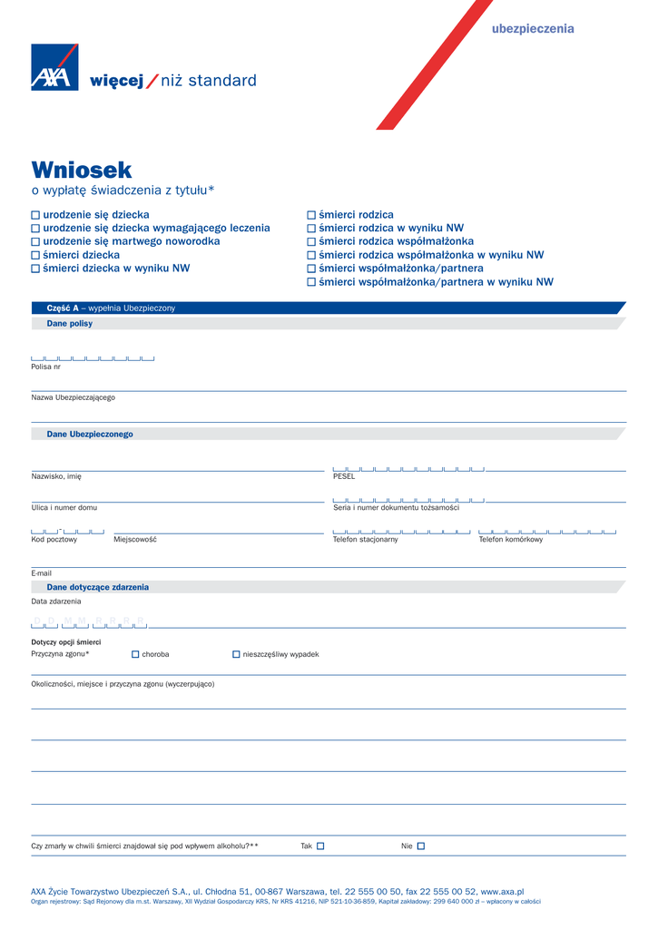 ubezpieczenia Wniosek o wypłatę świadczenia z tytułu* urodzenie się dziecka urodzenie się dziecka wymagającego leczenia urodzenie się martwego noworodka śmierci dziecka śmierci dziecka w wyniku NW śmierci rodzica śmierci rodzica w wyniku NW śmierci rodzica współmałżonka śmierci rodzica współmałżonka w wyniku NW śmierci współmałżonka/partnera śmierci współmałżonka/partnera w wyniku NW Część A – wypełnia Ubezpieczony Dane polisy Polisa nr Nazwa Ubezpieczającego Dane Ubezpieczonego Nazwisko, imię PESEL Ulica i numer domu Seria i numer dokumentu tożsamości Kod pocztowy Miejscowość Telefon stacjonarny Telefon komórkowy E-mail Dane dotyczące zdarzenia Data zdarzenia D D M M R R R R Dotyczy opcji śmierci Przyczyna zgonu* choroba nieszczęśliwy wypadek Okoliczności, miejsce i przyczyna zgonu (wyczerpująco) Czy zmarły w chwili śmierci znajdował się pod wpływem alkoholu?** Tak Nie AXA Życie Towarzystwo Ubezpieczeń S.A., ul. Chłodna 51, 00-867 Warszawa, tel. 22 555 00 50, fax 22 555 00 52, www.axa.pl Organ rejestrowy: Sąd Rejonowy dla m.st. Warszawy, XII Wydział Gospodarczy KRS, Nr KRS 41216, NIP 521-10-36-859, Kapitał zakładowy: 299 640 000 zł – wpłacony w całości Czy w związku z wypadkiem policja, prokuratura, sąd prowadzi postępowanie wyjaśniające?** Jeżeli tak, należy dołączyć protokół. Tak Nie Adres policji, prokuratury, sądu prowadzącego(ych) postępowanie wyjaśniające Forma wypłaty świadczenia* Przelew bankowy Właściciel rachunku bankowego Adres właściciela rachunku bankowego Numer rachunku bankowego Przekaz pocztowy Adres Oświadczam, że powyższe informacje są zgodne z prawdą. D D M M R R R R Miejscowość Data Podpis Uprawnionego/Uposażonego Beneficjent rzeczywisty osoba fizyczna będąca właścicielem osoby prawnej uprawnionej do otrzymania środków osoba fizyczna posiadająca więcej niż 25% udziałów/akcji/głosów w zgromadzeniu wspólników w osobie prawnej uprawnionej do otrzymania środków (np. udziałowiec posiadający więcej niż 25% udziałów w danej spółce) Nazwisko, imię PESEL Ulica i numer domu Kod pocztowy Miejscowość Oświadczenie Wyrażam zgodę na przekazywanie mi informacji dotyczących niniejszego wniosku (w tym decyzji o wypłacie, odmowie wypłaty lub uzupełnieniu dokumentów) przez AXA Polska S.A. i AXA Życie Towarzystwo Ubezpieczeń S.A., z siedzibami w Warszawie, za pośrednictwem wiadomości tekstowych SMS na podany przeze mnie powyżej numer telefonu. Decyzja o wypłacie, odmowie wypłaty lub uzupełnieniu dokumentów zostanie przekazana wnioskodawcy również na piśmie. D D M M R R R R Miejscowość Data Podpis Ubezpieczonego Oświadczenie*** My niżej podpisani oświadczamy, że pozostawaliśmy w ważnym związku małżeńskim w chwili zajścia zdarzenia ubezpieczeniowego. D D M M R R R R Miejscowość Data Podpis Ubezpieczonego Podpis małżonka Ubezpieczonego Część B – wypełnia Ubezpieczający Nazwa zakładu pracy Adres zakładu pracy Potwierdza się, że Ubezpieczony Nazwisko Imię PESEL Seria i numer dokumentu tożsamości był(a) objęty(a) grupowym ubezpieczeniem w AXA Życie Towarzystwie Ubezpieczeń S.A. w dniu zajścia zdarzenia ubezpieczeniowego. * Prosimy zaznaczyć odpowiednie pole. ** Prosimy wypełnić w przypadku zgonu w wyniku NW. *** Prosimy wypełnić w przypadku zgłoszenia roszczenia z tytułu śmierci rodzica współmałżonka. D D M M R R R R Data zatrudnienia ubezpieczonego pracownika D D M M R R R R Data ustania zatrudnienia ubezpieczonego pracownika D D M M R R R R Data opłacenia ostatniej składki D D M M R R R R Miejscowość Data Pieczątka zakładu pracy Podpis osoby obsługującej Dokumenty niezbędne do rozpatrzenia zasadności roszczenia Urodzenie się dziecka Ubezpieczonego wypełniony wniosek o wypłatę świadczenia z tytułu urodzenia się dziecka Ubezpieczonego odpis skrócony aktu urodzenia dziecka Ubezpieczonego kserokopia dowodu osobistego Ubezpieczonego · ·· · ·· ·· · · Urodzenie się dziecka wymagającego leczenia wypełniony wniosek o wypłatę świadczenia z tytułu urodzenia się dziecka Ubezpieczonego wymagającego leczenia odpis skrócony aktu urodzenia dziecka Ubezpieczonego kserokopia dowodu osobistego Ubezpieczonego karta informacyjna leczenia szpitalnego z dnia porodu wyniki badań biochemicznych lub okresowych po upływie 3 miesięcy od daty urodzenia (dziecko z wadą wrodzoną) dokumentacja medyczna z przebiegu leczenia zawierająca opis stanu zdrowia po upływie 2 tygodni od dnia porodu (wcześniak) kserokopia książeczki zdrowia dziecka z wpisanym pomiarem w skali Apgar po urodzeniu dziecka Urodzenie się martwego noworodka Ubezpieczonemu wypełniony wniosek o wypłatę świadczenia z tytułu urodzenia się martwego noworodka akt urodzenia się martwego noworodka kserokopia dowodu osobistego Ubezpieczonego karta informacyjna leczenia szpitalnego ·· ·· ·· · ·· Śmierć dziecka Ubezpieczonego wypełniony wniosek o wypłatę świadczenia z tytułu śmierci dziecka Ubezpieczonego odpis skrócony aktu zgonu dziecka Ubezpieczonego kopia statystycznej karty zgonu lub inny dokument medyczny wydany przez lekarza, określający przyczynę zgonu dziecka Ubezpieczonego kserokopia dowodu osobistego Ubezpieczonego w przypadku zgonu spowodowanego nieszczęśliwym wypadkiem – dokumentacja potwierdzająca nieszczęśliwy wypadek w postaci protokołu powypadkowego (protokół BHP, protokół policyjny, notatka służbowa w przypadku kolizji drogowej, karta wypadku itp.) Śmierć rodzica Ubezpieczonego wypełniony wniosek o wypłatę świadczenia z tytułu śmierci rodzica Ubezpieczonego odpis skrócony aktu zgonu rodzica Ubezpieczonego kserokopia dowodu osobistego Ubezpieczonego w przypadku zgonu spowodowanego nieszczęśliwym wypadkiem – dokumentacja potwierdzająca nieszczęśliwy wypadek w postaci protokołu powypadkowego (protokół BHP, protokół policyjny, notatka służbowa w prz