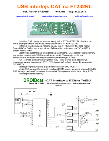 USB interfejs CAT na FT232RL opr. Piotrek SP2DMB www.sp2dmb.cba.pl 9.03.2015 www.sp2dmb.blogspot.com uzup. 14.03.2015 [email protected] Interfejs CAT oparty na starszej wersji chipa FTDI – FT232RL. Jest trochę mniej skomplikowany, ale ma te same funkcje co CAT na FT232BL. Interfejs współpracuje z radiami Yaesu (np. FT-857, 817 itp.) oraz ICOM. Sygnał RxD z CAT-a łączymy z pinem TxD w radiu, natomiast pin TxD w CAT z pinem RxD w radiu. Zachowana jest także pełna izolacja galwaniczna. CAT zasilany jest od strony komputera poprzez miniUSB oraz od strony radia. Ta ostatnia część jest zabezpieczona dodatkowo bezpiecznikiem polimerowym 200mA. CAT oprócz izolowanych sygnałów RxD i TxD oferuje dwa dodatkowe izolowane wyjścia sygnałowe: DTR i RTS. Mogą być wykorzystane do sterowania CW i RTTY. Izolacja sygnałów opiera się na transoptorach SMD PC817. Jeśli CAT ma współpracować z radiami ICOM, należy zewrzeć końcówki RxD i TxD. Istnieje możliwość obserwacji transmisji. Do tego celu służą dwie diody LED. Poniżej schemat ideowy: A tu schemat montażowy: Płytka drukowana jest jednostronna, cynowana i pokryta soldermaską. Wymiary płytki wynoszą 63 x 23mm Po montażu, przed pierwszym podłączeniem do komputera, należy wgrać sterowniki ze strony producenta układu FTDI. Link do strony producenta ze sterownikami: http://www.ftdichip.com/Drivers/D2XX.htm Uwaga ! Ma to być zakładka D2XX a nie VCP drivers. Wgrywamy sterowniki obsługujące FT232RL. Są to sterowniki uniwersalne i nadają się dla systemów 32 i 64 bitowych ( w razie potrzeby klikamy komunikat „Pomimo to kontynuuj”): Po podłączeniu do komputera, system powinien wykryć nowe urządzenie. Jeśli wykrywa, ale żąda sterowników – wgrywamy ponownie. Jeśli nasze radio nie ma CAT-a, to można ten interfejs wykorzystać np. dokluczowania CW w zawodach. Lutujemy wtedy tylko tor DTR: A tak wygląda cały interfejs CAT: Widok podłączenia dla YAESU: Podłączenia ICOM-ów: Piny dla PTT i CW Po włożeniu w metalową obudowę, stanie się DROIDcat-em na USB: A w połączeniu z modemem do emisji cyfrowych będzie DROIDmulti, czyli 2 w 1: USB CW interfejs – kolor czarny. Ten model akurat dla IC-730: Te interfejsy oraz inne dodatki do radia można obejrzeć na YouTube: http://www.youtube.com/watch?v=EzVMwcHKUN4 - DROIDcat http://www.youtube.com/watch?v=qqJvLWRMtfo - DROIDface https://www.youtube.com/watch?v=r72KWW9vNoQ - DROIDmulti Masz pytania ? Pisz –> [email protected] Vy 73 – Piotrek SP2DMB Wykaz elementów: C3 C7 C1,C2 C4,C5,C6 = 1 x 10µ „A” = 1 x 470n 0805 = 2 x 10n 0805 = 3 x 100n 0805 D1,D2 = 2 x 1N4148 SOD80 F1 SMD = 1 x 200mA 0805 IC1 = 1 x FT232RL SSOP28 L1 = 1 x FB LED1,LED2 = 2 x opcja Q1,Q2 = 2 x BC 547 SOT23 R3 = 1 x 1k 0805 R12 = 1 x 360 0805 R1,R2,R4,R9, R10,R11 = 6 x 470 0805 R5,R6,R7,R8 = 4 x 10k 0805 Transoptor1, Transoptor2, Transoptor3, Transoptor4 = 4 x 817s SMD VR1 = 1 x 7805 SOT223