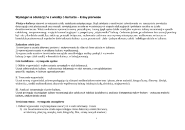 Wymagania edukacyjne z wiedzy o kulturze – klasy pierwsze Wiedza o kulturze stanowi zwieńczenie cyklu kształcenia artystycznego. Stąd założenie o możliwości odwoływania się nauczyciela do wiedzy dotyczącej sztuk plastycznych oraz muzyki zdobytej przez ucznia na wcześniejszych etapach edukacyjnych i położenie nacisku na dzieła dwudziestowieczne. Wiedza o kulturze wprowadza nową perspektywę i nowy język opisu dzieła sztuki jako wytworu kultury rozumianej w sposób całościowy, interpretowanego w ujęciu komunikacyjnym i z perspektywy „użytkownika” kultury. Co istotne jednak, przedmiotem interpretacji powinny być nie tylko dzieła sztuki, lecz także np. praktyki świąteczne, zachowania codzienne oraz wytwory nieartystyczne, analizowane zwłaszcza w kontekście podstawowych wymiarów doświadczenia kultury: czasu, przestrzeni i ciała – jednym słowem, całość ludzkiego udziału w kulturze. Zadaniem szkoły jest: 1) rozwijanie u ucznia aktywnej postawy i motywowanie do różnych form udziału w kulturze; 2) wprowadzenie ucznia w problemy kultury współczesnej; 3) wyposażenie ucznia w intelektualne narzędzia umożliwiające analizę praktyk i wytworów kultury (w tym dzieł sztuki) w kontekście kultury, w której powstają. Cele kształcenia – wymagania ogólne: I. Odbiór wypowiedzi i wykorzystanie zawartych w nich informacji. Uczeń odbiera teksty kultury i wykorzystuje informacje w nich zawarte, z uwzględnieniem specyfiki medium, w którym są przekazywane. II. Tworzenie wypowiedzi. Uczeń tworzy wypowiedzi, celowo posługując się różnymi mediami (słowo mówione i pisane, obraz malarski, fotograficzny, filmowy, dźwięk, widowisko, środki multimedialne); aktywnie współtworzy kulturę lokalną (szkoły, dzielnicy, miejscowości). III. Analiza i interpretacja tekstów kultury. Uczeń posługuje się pojęciem kultury rozumianej jako całokształt ludzkiej działalności; analizuje i interpretuje teksty kultury – potoczne praktyki kultury, a także dzieła sztuki. Treści nauczania – wymagania szczegółowe 1. Odbiór wypowiedzi i wykorzystanie zawartych w nich informacji. Uczeń: 1) zna dwudziestowieczne dzieła reprezentujące różne dziedziny sztuki (literaturę, architekturę, plastykę, muzykę, teatr, fotografię, film, sztukę nowych mediów) 1 i dostrzega związki pomiędzy nimi; 2) wskazuje różne funkcje dzieła sztuki (np. estetyczną, komunikacyjną, społeczną, użytkową, kultową, poznawczą, ludyczną); 3) analizuje temat dzieła oraz treści i formę w kontekście jego różnych funkcji, wykorzystując podstawowe wiadomości o stylach i epokach z różnych dziedzin sztuki; 4) analizuje film lub analizuje spektakl teatralny, posługując się podstawowymi pojęciami z zakresu właściwej dziedziny sztuki; 5) charakteryzuje podstawowe media kultury (słowo, obraz, dźwięk, widowisko); 6) wymienia różne formy mediów kultury (słowo mówione, pismo, książka, obraz malarski, fotografia, film, program telewizyjny, spektakl teatralny) oraz użycia (nowe media, media masowe, media interaktywne, multimedia); 7) wyjaśnia, na czym polegają różne formy kontaktu z kulturą (odbiór bierny, aktywny, konsumpcja, produkcja, twórczość, użytkowanie, uczestnictwo, animacja); 8) lokuje wytwory kultury (zachowania, zwyczaje, normy moralne, wytwory materialne, dzieła sztuki) w kontekście grup społecznych, w których są tworzone i odbierane (rodzina, rówieśnicy, społeczność lokalna, naród); 9) samodzielnie wyszukuje informacje na temat kultury w różnych mediach, bibliotekach. 2. Tworzenie wypowiedzi. Uczeń: 1) wypowiada się – w mowie i w piśmie – na temat wytworów kultury i ludzkich praktyk w kulturze (zachowań, obyczajów, przedmiotów materialnych, dzieł sztuki); 2) wypowiada się na temat dzieła sztuki, używając pojęć zarówno swoistych dla poszczególnych sztuk, jak i wspólnych (forma, kompozycja, funkcja, nadawca, odbiorca, użytkownik, znaczenie, kontekst, medium); 3) przygotowuje prezentację lub inną formę wypowiedzi multimedialnej – blog, forum, strona WWW – na tematy związane z kulturą lokalną i regionu lub z szeroko pojętymi problemami kultury współczesnej; 4) bierze aktywny udział w szkolnych przedsięwzięciach artystycznych, animacyjnych, społecznych i innych (wystawa, happening, przedstawienie 2 szkolne, gazetka szkolna, kulturalna akcja charytatywna); 5) organizuje proste działania o charakterze kulturalnym (spotkanie z twórcą kultury, przedsięwzięcie artystyczne, prezentacja własnych zainteresowań, tradycji lokalnej lub regionalnej); 6) określa swoje zainteresowania, potrzeby i preferencje kulturalne oraz uzasadnia je w dyskusji; 7) dba o ład i estetykę otoczenia, otacza opieką elementy dziedzictwa kulturowego. 3. Analiza i interpretacja tekstów kultury. Uczeń: 1) odróżnia pojęcie kultury rozumianej jako dorobek artystyczny od kultury rozumianej jako całokształt dorobku ludzkości, ze zrozumieniem używa określeń: kulturowy i kulturalny; 2) rozróżnienie, o którym mowa w pkt 1, stosuje w interpretacji wytworów kultury; 3) odnosi elementy kultury (zachowania, zwyczaje, praktyki, przedmioty materialne, dzieła sztuki) do kategorii: czas, przestrzeń, ciało, grupa społeczna (rodzina, rówieśnicy, społeczność lokalna, naród); 4) interpretuje praktyki kultury z najbliższego otoczenia (klasa, szkoła, dom, osiedle, podwórko, miasto, kościół, stadion piłkarski); 5) dostrzega i nazywa związek między dziełem a sytuacją społeczno-historyczną i obyczajami epoki, w której powstało; 6) posługuje się pojęciami: kultura popularna, ludowa, masowa, wysoka, narodowa, zglobalizowana, subkultura w ich właściwym znaczeniu i używa ich w kontekście interpretowanych dzieł sztuki oraz praktyk kulturowych; 7) wskazuje relacje między kulturami: lokalną, regionalną, narodową i europejską, ujawniające się w konkretnych dziełach sztuki i prakt