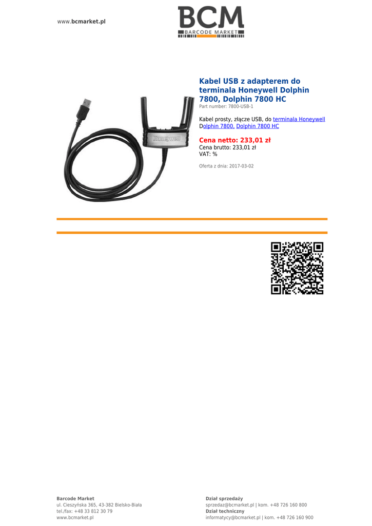 www.bcmarket.pl Kabel USB z adapterem do terminala Honeywell Dolphin 7800, Dolphin 7800 HC Part number: 7800-USB-1 Kabel prosty, złącze USB, do terminala Honeywell Dolphin 7800, Dolphin 7800 HC Cena netto: 233,01 zł Cena brutto: 233,01 zł VAT: % Oferta z dnia: 2017-03-02 Barcode Market ul. Cieszyńska 365, 43-382 Bielsko-Biała tel./fax: +48 33 812 30 79 www.bcmarket.pl Dział sprzedaży [email protected] | kom. +48 726 160 800 Dział techniczny [email protected] | kom. +48 726 160 900