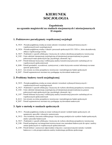 KIERUNEK SOCJOLOGIA Zagadnienia na egzamin magisterski na studiach stacjonarnych i niestacjonarnych II stopnia 1. Podstawowe paradygmaty współczesnej socjologii K_W25 – Posiada pogłębioną wiedzę na temat założeń i twierdzeń wybranych historycznych i współczesnych teorii socjologicznych K_W26 – Posiada pogłębioną wiedzę o ideach i procesach społecznych XX i XXI w., które ukształtowały oblicze współczesnego świata K_W27 – Podchodzi w sposób refleksyjny i krytyczny do wyboru określonej perspektywy teoretycznej K_U02 – Umie odróżnić interpretację socjologiczną od interpretacji przeprowadzonej na gruncie pokrewnych nauk społecznych (np. psychologii, ekonomii, itp.) K_U07 – Potrafi dokonać krytycznej i refleksyjnej analizy konsekwencji procesów zachodzących we współczesnych społeczeństwach K_K06 – Potrafi gromadzić, wyszukiwać, syntetyzować, a także krytycznie oceniać informacje na temat zjawisk społecznych K_K14 – Jest otwarty na różne perspektywy teoretyczne i metodologiczne badań społecznych K_K07 – Potrafi argumentować stawiane tezy posługując się dowodami naukowymi 2. Problemy budowy teorii socjologicznej K_W25 – Posiada pogłębioną wiedzę na temat założeń i twierdzeń wybranych historycznych i współczesnych teorii socjologicznych K_W27 – Podchodzi w sposób refleksyjny i krytyczny do wyboru określonej perspektywy teoretycznej K_U02 – Umie odróżnić interpretację socjologiczną od interpretacji przeprowadzonej na gruncie pokrewnych nauk społecznych (np. psychologii, ekonomii, itp.) K_U07 – Potrafi dokonać krytycznej i refleksyjnej analizy konsekwencji procesów zachodzących we współczesnych społeczeństwach K_K14 – Jest otwarty na różne perspektywy teoretyczne i metodologiczne badań społecznych K_K07 – Potrafi argumentować stawiane tezy posługując się dowodami naukowymi 3. Spór o metodę w naukach społecznych K_W11 – Posiada pogłębioną wiedzę na temat wybranych metod i technik badań społecznych, ich ograniczeń, specyfiki i obszarów zastosowania K_W12 – Jest świadomy znaczenia refleksyjnego i krytycznego podejścia do wyników badań społecznych, analiz i procedur badawczych K_W27 – Podchodzi w sposób refleksyjny i krytyczny do wyboru określonej perspektywy teoretycznej K_U06 – Potrafi posługiwać się kategoriami teoretycznymi oraz metodami badawczymi do opisu i analizy zmian społecznych we współczesnych społeczeństwach K_U09 – Potrafi dobrać i zastosować odpowiednie (włącznie z zaawansowanymi) metody i techniki badawcze w celu przeprowadzenia analizy konkretnego problemu społecznego K_K03 – Umie zaproponować rozwiązanie problemów, które wymagają interdyscyplinarności w podejściu badawczym K_K14 – Jest otwarty na różne perspektywy teoretyczne i metodologiczne badań społecznych K_K07 – Potrafi argumentować stawiane tezy posługując się dowodami naukowymi 4. Zmiana społeczna w świetle różnych orientacji teoretycznych K_W21 – Posiada pogłębioną wiedzę na temat procesów leżących u podstaw stabilności i zmiany społecznej, a także jest refleksyjny i krytyczny w ich interpretacji K_W22 – Jest refleksyjny i krytyczny w interpretacji procesów zachodzących w społeczeństwie polskim i globalnym oraz ich konsekwencji w zakresie postaw i instytucji społecznych. Jest świadomy złożoności zmian struktur i instytucji społecznych K_W23 – Posiada pogłębioną wiedzę na temat aktualnych potrzeb i problemów społeczeństwa polskiego oraz zmian w tym zakresie K_U02 – Umie odróżnić interpretację socjologiczną od interpretacji przeprowadzonej na gruncie pokrewnych nauk społecznych (np. psychologii, ekonomii, itp.) K_U03 – Potrafi dokonać krytycznej analizy zjawisk i procesów społecznych, zwłaszcza dotyczących współczesnego społeczeństwa polskiego K_U05 – Potrafi samodzielnie formułować i weryfikować sądy na temat przyczyn wybranych procesów i zjawisk społecznych K_U06 – Potrafi posługiwać się kategoriami teoretycznymi oraz metodami badawczymi do opisu i analizy zmian społecznych we współczesnych społeczeństwach K_K06 – Potrafi gromadzić, wyszukiwać, syntetyzować, a także krytycznie oceniać informacje na temat zjawisk społecznych K_K07 – Potrafi argumentować stawiane tezy posługując się dowodami naukowymi 5. Problem równowagi i napięć w strukturze społecznej w świetle różnych teorii K_W02 – Posiada pogłębioną wiedzę o strukturach, wybranych instytucjach społecznych i ich wzajemnych relacjach K_W04 – Jest refleksyjny i krytyczny wobec problemu zróżnicowania społecznego i nierówności społecznych K_W22 – Jest refleksyjny i krytyczny w interpretacji procesów zachodzących w społeczeństwie polskim i globalnym oraz ich konsekwencji w zakresie postaw i instytucji społecznych. Jest świadomy złożoności zmian struktur i instytucji społecznych K_U01 – Potrafi zidentyfikować przyczyny i przewidzieć potencjalne skutki przeszłych i bieżących wydarzeń społecznych. Potrafi formułować krytyczne sądy na temat bieżących i przeszłych wydarzeń społecznych K_U02 – Umie odróżnić interpretację socjologiczną od interpretacji przeprowadzonej na gruncie pokrewnych nauk społecznych (np. psychologii, ekonomii, itp.) K_U03 – Potrafi dokonać krytycznej analizy zjawisk i procesów społecznych, zwłaszcza dotyczących współczesnego społeczeństwa polskiego K_U05 – Potrafi samodzielnie formułować i weryfikować sądy na temat przyczyn wybranych procesów i zjawisk społecznych K_K06 – Potrafi gromadzić, wyszukiwać, syntetyzować, a także krytycznie oceniać informacje na temat zjawisk społecznych 6. Społeczeństwo z perspektywy teorii interakcji i działań społecznych K_W07 – Jest świadomy złożoności i różnorodności zachowań ludzkich, społecznych oraz relacji łączących jednostki, grupy i instytucje społeczne K_W08 