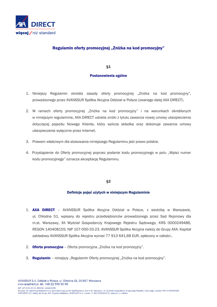 Regulamin oferty promocyjnej „Zniżka na kod promocyjny” §1 Postanowienia ogólne 1. Niniejszy Regulamin określa zasady oferty promocyjnej „Zniżka na kod promocyjny”, prowadzonego przez AVANSSUR Spółka Akcyjna Oddział w Polsce (zwanego dalej AXA DIRECT). 2. W ramach oferty promocyjnej „Zniżka na kod promocyjny” i na warunkach określonych w niniejszym regulaminie, AXA DIRECT udziela zniżki z tytułu zawarcia nowej umowy ubezpieczenia dotyczącej pojazdu Nowego Klienta, który wylicza składkę oraz dokonuje zawarcia umowy ubezpieczenia wyłącznie przez Internet. 3. Prawem właściwym dla stosowania niniejszego Regulaminu jest prawo polskie. 4. Przystąpienie do Oferty promocyjnej poprzez podanie kodu promocyjnego w polu „Wpisz numer kodu promocyjnego” oznacza akceptację Regulaminu. §2 Definicje pojęć użytych w niniejszym Regulaminie 1. AXA DIRECT – AVANSSUR Spółka Akcyjna Oddział w Polsce, z siedzibą w Warszawie, ul. Chłodna 51, wpisany do rejestru przedsiębiorców prowadzonego przez Sad Rejonowy dla m.st. Warszawy, XII Wydział Gospodarczy Krajowego Rejestru Sądowego, KRS 0000249486, REGON 140408155; NIP 107-000-33-23. AVANSSUR Spółka Akcyjna należy do Grupy AXA. Kapitał zakładowy AVANSSUR Spółka Akcyjna wynosi 77 913 641,68 EUR, opłacony w całości.. 2. Oferta promocyjna – Oferta promocyjna „Zniżka na kod promocyjny”. 3. Regulamin – niniejszy „Regulamin Oferty promocyjnej „Zniżka na kod promocyjny”. 4. Pojazd– dopuszczony do ruchu i posiadający ważne badania techniczne samochód osobowy, zarejestrowany lub podlegający rejestracji w Polsce, stosownie do przepisów ustawy Prawo o ruchu drogowym. Pod tym pojęciem rozumie się także pojazdy z nadwoziem samochodów osobowych, zarejestrowane jako samochody ciężarowe oraz samochody terenowe o dopuszczalnej masie całkowitej do 3,5 tony. 5. Umowa ubezpieczenia – umowa ubezpieczenia, zawarta po raz pierwszy pomiędzy AXA DIRECT a Nowym Klientem obejmująca swoim zakresem co najmniej ubezpieczenie odpowiedzialności cywilnej posiadaczy pojazdów mechanicznych (OC). Za Umowę ubezpieczenia nie są uważane umowy ubezpieczenia OC zawierane na okres krótszy niż 12 miesięcy (tzw. krótkoterminowe umowy ubezpieczenia) 6. Nowy Klient – osoba fizyczna, która po raz pierwszy składa wniosek o zawarcie Umowy ubezpieczenia w AXA DIRECT i która spełnia wymogi określone w § 3 niniejszego Regulaminu. Nowym Klientem może być również osoba fizyczna prowadząca działalność gospodarczą, o ile ubezpiecza pojazd niesłużący jej do prowadzenie działalności gospodarczej. 7. Call Center – Centrum telefoniczne AXA DIRECT dostępne pod numerem telefonu 22 599 95 22. 8. Doradca – pracownik AXA DIRECT w Call Center lub osoba świadcząca w imieniu i na rzecz AXA DIRECT usługi w Call Center, na podstawie umowy cywilnoprawnej. 9. Strona internetowa – strona internetowa AXA DIRECT, zamieszczona pod adresem internetowym www.axadirect.pl. 10. Czas trwania Oferty promocyjnej – okres, w którym Nowy Klient może skorzystać z Oferty promocyjnej, określony w §6 niniejszego Regulaminu. 11. Zniżka – jednorazowa zniżka dla Nowego Klienta w wysokości 20% w składce należnej obliczanej wyłącznie przy użyciu Kalkulatora OC AC AXA DIRECT dostępnego na stronie internetowej z tytułu zawarcia przez Nowego Klienta Umowy ubezpieczenia. W przypadku opłacania składki w ratach zniżkę stosuję się do każdej z rat składki obniżając odpowiednio wysokość raty składki. Zniżka nie ma zastosowania w przypadku zawarcia kolejnych umów ubezpieczenia dotyczących pojazdu, którego dotyczyły wcześniej zawarte z AXA DIRECT umowy ubezpieczenia, w tym umów ubezpieczenia zawartych w trybie art. 28 ust.1 ustawy z dnia 22 maja 2003 roku o ubezpieczeniach obowiązkowych Ubezpieczeniowym Funduszu Gwarancyjnym i Polskim Biurze Ubezpieczycieli Komunikacyjnych (Dz. U. 2003 r., nr 214 poz. 1152, z późn. zm.). Składka w kolejnych okresach ubezpieczenia dla pojazdu, do ubezpieczenia którego miała już zastosowanie Zniżka lub do innego pojazdu Nowego Klienta, który już wcześniej skorzystał z Oferty promocyjne, obliczana będzie bez uwzględnienia wykorzystanej już, jednorazowej Zniżki wynikającej z niniejszego Regulaminu. 12. Kod promocyjny - ciąg siedmiu znaków, utworzony i udostępniony Nowemu Klientowi przez AXA DIRECT, umożliwiający skorzystanie ze Zniżki w czasie trwania Oferty promocyjnej „Zniżka na kod promocyjny”. Kod udostępniony może zostać Klientowi w reklamach AXA DIRECT ukazujących się w czasie trwania Oferty promocyjnej w mediach publicznych lub drogą reklamy bezpośredniej. §3 Zasady korzystania z Oferty promocyjnej 1. Z Oferty promocyjnej mogą skorzystać wyłącznie Nowi Klienci, którzy spełnią wszystkie warunki określone w Regulaminie. 2. Oferta promocyjna przeznaczona jest dla Nowych Klientów, którzy w Czasie trwania Oferty promocyjnej: 1) samodzielnie wyliczą składkę należną z tytułu Umowy ubezpieczenia przy użyciu Kalkulatora OC AC AXA DIRECT dostępnego na stronie internetowej; 2) w Kalkulatorze OC AC, w polu „Wpisz numer kodu promocyjnego” wpiszą prawidłowy Kod promocyjny; 3) w Kalkulatorze OC AC, w sekcji „Dane kontaktowe ubezpieczającego” podadzą imię, nazwisko, adres e-mail, numer telefonu oraz wyrażą zgody prawne wymagane przez Kalkulator OC AC; 4) złożą przez Internet wniosek o ubezpieczenie pojazdu w AXA DIRECT, bez kontaktowania się z Call Center w trakcie wyliczania składki oraz składania wniosku o zawarcie Umowy ubezpieczenia. Warunki, o których mowa w pkt 1,2 i 3 musza być spełnione łącznie. 3. Ze Zniżki w ramach Oferty promocyjnej Nowy Klient, który spełnił wszystkie warunki opisane w ust. 2, może skorzystać, o ile Umowa ubezpieczenia zostanie zawarta nie później niż w terminie 30 dni kalendarzowych od dnia złożenia przez Internet wniosku o zawarcie Umowy ubezpieczenia w AX