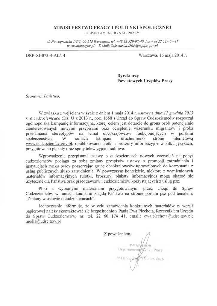M INISTERSTWO PRACY I POLITYKI SPOŁECZNEJ DEPARTAMENT RYNKU PRACY ul. Nowogrodzka 1/3/5, 00-513 Warszawa, tel. +48 22 529-07-40, fa x +48 22 529-07-41 www.mpips.gov.pl; E-Mail: [email protected] DRP-XI-073-4-AL/14 Warszawa, 16 maja 2014 r. Dyrektorzy Powiatowych Urzędów Pracy Szanowni Państwo, W związku z wejściem w życie z dniem 1 maja 2014 r. ustawy z dnia 12 grudnia 2013 r. o cudzoziemcach (Dz. U z 2013 r., poz. 1650 ) Urząd do Spraw Cudzoziemców rozpoczął ogólnopolską kampanię informacyjną, której celem jest dotarcie do grona osób potencjalnie zainteresowanych nowymi przepisami oraz ocieplenie wizerunku migrantów i próba przełamania stereotypów na temat obcokrajowców funkcjonujących w polskim społeczeństwie. W ramach kampanii uruchomiono stronę internetową www.cudzoziemcy.gov.pl opublikowano ulotki i broszury informacyjne w kilku językach, przygotowano plakaty oraz spoty telewizyjne i radiowe. Wprowadzenie przepisami ustawy o cudzoziemcach nowych zezwoleń na pobyt cudzoziemców pociąga za sobą zmiany przepisów ustawy o promocji zatrudnienia i instytucjach rynku pracy poszerzając grupę obcokrajowców uprawnionych do korzystania z usług publicznych służb zatrudnienia. W powyższym kontekście, niektóre z wymienionych materiałów informacyjnych (ulotki, broszury, plakaty informacyjne) mogą okazać się użyteczne dla Państwa oraz pracodawców i cudzoziemców korzystających z usług psz. Pliki z wybranymi materiałami przygotowanymi przez Urząd do Spraw Cudzoziemców w ramach kampanii znajdą Państwo na stronie portalu psz pod tematem: „Zmiany w ustawie o cudzoziemcach”. Jednocześnie informuję, że w celu zamówienia konkretnych materiałów w wersji papierowej należy skontaktować się bezpośrednio z Panią Ewą Piechotą, Rzecznikiem Urzędu do Spraw Cudzoziemców, nr. tel. 22 60 174 41, email: ewa.piechota@ udsc.gov.pl; media@udsc. gov.pl Z poważaniem,