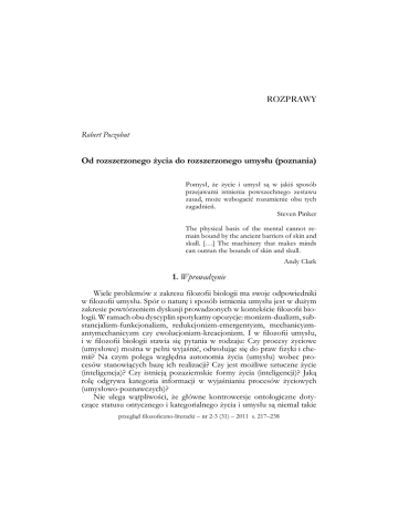 ROZPRAWY Robert Poczobut Od rozszerzonego życia do rozszerzonego umysłu (poznania) Pomysł, że życie i umysł są w jakiś sposób przejawami istnienia powszechnego zestawu zasad, może wzbogacić rozumienie obu tych zagadnień. Steven Pinker The physical basis of the mental cannot remain bound by the ancient barriers of skin and skull. […] The machinery that makes minds can outrun the bounds of skin and skull. Andy Clark 1. Wprowadzenie Wiele problemów z zakresu filozofii biologii ma swoje odpowiedniki w filozofii umysłu. Spór o naturę i sposób istnienia umysłu jest w dużym zakresie powtórzeniem dyskusji prowadzonych w kontekście filozofii biologii. W ramach obu dyscyplin spotykamy opozycje: monizm-dualizm, substancjalizm-funkcjonalizm, redukcjonizm-emergentyzm, mechanicyzmantymechanicyzm czy ewolucjonizm-kreacjonizm. I w filozofii umysłu, i w filozofii biologii stawia się pytania w rodzaju: Czy procesy życiowe (umysłowe) można w pełni wyjaśnić, odwołując się do praw fizyki i chemii? Na czym polega względna autonomia życia (umysłu) wobec procesów stanowiących bazę ich realizacji? Czy jest możliwe sztuczne życie (inteligencja)? Czy istnieją pozaziemskie formy życia (inteligencji)? Jaką rolę odgrywa kategoria informacji w wyjaśnianiu procesów życiowych (umysłowo-poznawczych)? Nie ulega wątpliwości, że główne kontrowersje ontologiczne dotyczące statusu ontycznego i kategorialnego życia i umysłu są niemal takie przegląd filozoficzno-literacki – nr 2-3 (31) – 2011 s. 217–238 Robert Poczobut same. Również błędy pojęciowe, jakie popełniano, dokonując konceptualizacji życia, czyniono przy okazji konceptualizacji zjawisk umysłowych. Celem artykułu jest próba pokazania, w jaki sposób przyjęcie umiarkowanej wersji funkcjonalizmu, nazywanego na użytek tego artykułu „funkcjonalizmem emergencyjnym”, prowadzi do niestandardowych teorii, takich jak teoria rozszerzonego życia i rozszerzonego umysłu (poznania). 2. Kontrowersja funkcjonalizm-substancjalizm w filozofii biologii i filozofii umysłu 2.1. Klasyczną kontrowersją występującą w filozofii umysłu i filozofii biologii jest spór wyrażony przez opozycję substancjalizm-funkcjonalizm. Kiedyś wydawało się niemożliwe, jak zbiór nieożywionych atomów może być żywy; jak z nie-życia może powstać życie. Postulowano w związku z tym istnienie specjalnej niefizycznej siły lub substancji ożywiającej i organizującej układy fizyczne. Wnioskowano w następujący sposób: ponieważ rozkład układu żywego na elementy składowe (cząsteczki, atomy) nie prowadzi do wykrycia czegoś takiego jak życie, musi ono być czymś niefizycznym, pochodzącym spoza układu fizycznego. Stanowisko to zaczęto określać mianem „witalizmu” 1. W opozycji do inspirowanego poglądami Kartezjusza mechanicyzmu witaliści wskazywali na istnienie wielu własności układów żywych, które nie występują w układach nieożywionych. Zdaniem H. Driescha, czołowego przedstawiciela witalizmu, fizyka nie jest w stanie wyjaśnić samoregulacji w strukturach płodowych, regeneracji, rozmnażania ani procesów psychicznych, takich jak inteligencja czy pamięć. O ile w warstwie negatywnej witaliści mieli wiele racji, to formułując pozytywne wyjaśnienia wskazywanych przez siebie zjawisk, postulowali istnienie bytów, które z perspektywy rozwoju biologii okazały się bytami fikcyjnymi. Jak pisze E. Mayr: 1 Por. P. Davies, Bóg i nowa fizyka, przeł. P. Amsterdamski, Warszawa 2006, s. 81. Rozpowszechniony jest pogląd, że różne wersje witalizmu stanowią próbę przeniesienia kartezjańskiego programu z teorii umysłu do teorii życia. Kartezjusz twierdził, że do wyjaśnienia świadomego umysłu niezbędne jest przyjęcie istnienia niefizycznej substancji (res cogitans). Wyjaśnienie procesów życiowych jest zaś możliwe w kategoriach czysto mechanicystycznych. Witaliści odrzucili kartezjańską koncepcję życia, ale przenieśli postulat Kartezjusza z teorii umysłu na teren biologii. O ile odrzucenie mechanicystycznej koncepcji życia zyskało szerokie uznanie, to postulat zakładający istnienie niefizycznej siły lub substancji życiowej spotkał się z powszechną krytyką. Biologia „nie poszła drogą” wskazaną przez witalistów. Na temat kontrowersji mechanicyzm-witalizm w filozofii biologii por. J.A. Stuchliński, Mechanicyzm i witalizm. Klasyczny spór o podstawy metodologiczne biologii, „Zagadnienia Naukoznawstwa” 1977, 13, nr 4, s. 595-620. 218 Od rozszerzonego życia do rozszerzonego umysłu (poznania) Niektórzy witaliści uważali, że życie ma związek ze specjalną substancją (którą nazywali „protoplazmą”) niewystępującą w materii nieożywionej albo ze specjalnym stanem materii (takim jak stan koloidalny), do którego przeanalizowania fizyka i chemia nie są przygotowane. Inny odłam witalistów utrzymywał, że istnieje specjalna siła życiowa (czasem nazywana Lebenskraft, entelechią lub élan vital), różna od sił, którymi zajmują się fizycy. W istnienie tej siły wierzyło wielu teologów, którzy sądzili, że życie powstało w jakimś określonym celu. Część witalistów twierdziła, że specyficzne właściwości organizmów żywych są efektem oddziaływania sił psychicznych lub umysłowych (psychowitalizm, psycholamarkizm). […] J.F. Blumenbach […] wysunął tezę, że decydującą rolę nie tylko w rozwoju płodu, ale i w procesach wzrostu, regeneracji i rozmnażania odgrywa szczególna siła kształtująca, nisus formativus2. Obecnie dominuje pogląd, że witaliści słusznie poddawali krytyce mechanicystyczną koncepcję życia. Jednakże z powodu słabego rozwoju biologii w XIX wieku nie byli w stanie wyjaśnić procesów, które z dużą dokładnością opisywali. Zdaniem Mayra, mechanicyści mieli rację, twierdząc, że wyjaśnienie procesów życiowych nie wymaga odwoływania się do tajemniczych sił (przyn