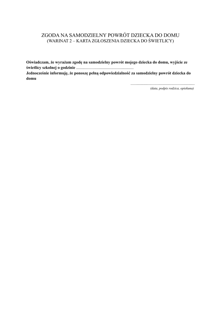 ZGODA NA SAMODZIELNY POWRÓT DZIECKA DO DOMU (WARINAT 2 – KARTA ZGŁOSZENIA DZIECKA DO ŚWIETLICY) Oświadczam, że wyrażam zgodę na samodzielny powrót mojego dziecka do domu, wyjście ze świetlicy szkolnej o godzinie .............................................................. Jednocześnie informuję, że ponoszę pełną odpowiedzialność za samodzielny powrót dziecka do domu ..................................................................... (data, podpis rodzica, opiekuna)