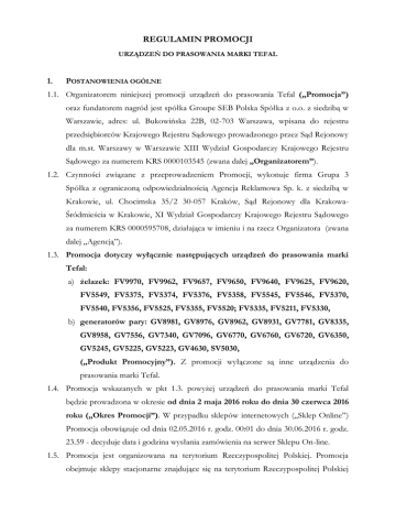 REGULAMIN PROMOCJI URZĄDZEŃ DO PRASOWANIA MARKI TEFAL 1. POSTANOWIENIA OGÓLNE 1.1. Organizatorem niniejszej promocji urządzeń do prasowania Tefal („Promocja”) oraz fundatorem nagród jest spółka Groupe SEB Polska Spółka z o.o. z siedzibą w Warszawie, adres: ul. Bukowińska 22B, 02-703 Warszawa, wpisana do rejestru przedsiębiorców Krajowego Rejestru Sądowego prowadzonego przez Sąd Rejonowy dla m.st. Warszawy w Warszawie XIII Wydział Gospodarczy Krajowego Rejestru Sądowego za numerem KRS 0000103545 (zwana dalej „Organizatorem”). 1.2. Czynności związane z przeprowadzeniem Promocji, wykonuje firma Grupa 3 Spółka z ograniczoną odpowiedzialnością Agencja Reklamowa Sp. k. z siedzibą w Krakowie, ul. Chocimska 35/2 30-057 Kraków, Sąd Rejonowy dla KrakowaŚródmieścia w Krakowie, XI Wydział Gospodarczy Krajowego Rejestru Sądowego za numerem KRS 0000595708, działająca w imieniu i na rzecz Organizatora (zwana dalej „Agencją”). 1.3. Promocja dotyczy wyłącznie następujących urządzeń do prasowania marki Tefal: a) żelazek: FV9970, FV9962, FV9657, FV9650, FV9640, FV9625, FV9620, FV5549, FV5375, FV5374, FV5376, FV5358, FV5545, FV5546, FV5370, FV5540, FV5356, FV5525, FV5355, FV5520; FV5335, FV5211, FV5330, b) generatorów pary: GV8981, GV8976, GV8962, GV8931, GV7781, GV8335, GV8958, GV7556, GV7340, GV7096, GV6770, GV6760, GV6720, GV6350, GV5245, GV5225, GV5223, GV4630, SV5030, („Produkt Promocyjny”). Z promocji wyłączone są inne urządzenia do prasowania marki Tefal. 1.4. Promocja wskazanych w pkt 1.3. powyżej urządzeń do prasowania marki Tefal będzie prowadzona w okresie od dnia 2 maja 2016 roku do dnia 30 czerwca 2016 roku („Okres Promocji”). W przypadku sklepów internetowych („Sklep Online”) Promocja obowiązuje od dnia 02.05.2016 r. godz. 00:01 do dnia 30.06.2016 r. godz. 23.59 - decyduje data i godzina wysłania zamówienia na serwer Sklepu On-line. 1.5. Promocja jest organizowana na terytorium Rzeczypospolitej Polskiej. Promocja obejmuje sklepy stacjonarne znajdujące się na terytorium Rzeczypospolitej Polskiej oraz sklepy internetowe prowadzone przez podmioty z siedzibą w Polsce, z wyłączeniem sklepów stacjonarnych Home&Cook, które nie biorą udziału w Promocji („Punkty Sprzedaży”). 1.6. Promocją objęte są wyłącznie fabrycznie nowe Produkty Promocyjne zakupione przez Uczestników w Okresie Promocji w Punktach Sprzedaży, w stosunku do których gwarantem jest Organizator. 1.7. Promocja kierowana jest wyłącznie do konsumentów i tylko konsument może wziąć w niej udział. Przez konsumenta rozumie się osobę fizyczną dokonującą z przedsiębiorcą czynności prawnej niezwiązanej bezpośrednio z jej działalnością gospodarczą lub zawodową (art. 22¹ kodeksu cywilnego). 1.8. Osoby biorące udział w Promocji, poprzez zaakceptowanie oświadczenia zawartego w Kuponie Promocyjnym potwierdzają zapoznanie się z postanowieniami niniejszego Regulaminu. 2. ZASADY UDZIAŁU W PROMOCJI 2.1. Uczestnikiem Promocji może być jedynie osoba fizyczna, która ukończyła 18 lat, zamieszkała na terytorium Rzeczypospolitej Polskiej, posiadająca pełną zdolność do czynności prawnych, która dokonała w Okresie Promocji zakupu w Punkcie Sprzedaży Produktu Promocyjnego objętego niniejszą Promocją jako konsument w rozumieniu art. 22¹ kodeksu cywilnego, a więc nie w związku z jej działalnością gospodarczą lub zawodową spełniająca jednocześnie łącznie następujące warunki: („Uczestnik”): a) w Okresie Promocji dokona zakupu Produktu Promocyjnego w Punkcie Sprzedaży; b) spełni warunki wskazane w pkt 2.3 -2.16. Regulaminu, c) wypełni i wyśle Kupon Promocyjny, zgodnie z postanowieniami Regulaminu, – z zastrzeżeniem pkt 2.2. poniżej. 2.2. W Promocji nie mogą brać udziału: a) pracownicy Organizatora i Agencji oraz pracownicy podmiotów współpracujących przy przygotowaniu i realizacji Promocji, b) współpracownicy podmiotów wymienionych pod lit. a) tj. osoby i jednostki organizacyjne współdziałające na podstawie umów cywilnoprawnych, ani też członkowie organów podmiotów wskazanych pod lit. a), c) inne osoby biorące udział w jakikolwiek sposób w organizacji i przeprowadzeniu Promocji, d) osoby najbliższe wobec osób wymienionych pod lit. a-c) powyżej, przez które rozumie się małżonków, dzieci, rodziców, teściów oraz rodzeństwo. 2.3. Uczestnictwo w Promocji jest dobrowolne. 2.4. Uczestnictwo w Promocji wyłącza możliwość brania udziału w innych promocjach organizowanych przez Organizatora w Okresie Promocji dotyczących sprzedaży urządzeń do prasowania marki Tefal. 2.5. Każdy Uczestnik może wziąć udział w Promocji tylko jeden raz, wysyłając jeden Kupon Promocyjny. 2.6. Warunkiem koniecznym udziału w Promocji jest zakup przez Uczestnika w sprzedaży detalicznej w Punktach Sprzedaży w Okresie Promocji jednego z Produktów Promocyjnych tj. urządzeń do prasowania marki Tefal o symbolach: FV9970, FV9962, FV9657, FV9650, FV9640, FV9625, FV9620, FV5549, FV5375, FV5374, FV5376, FV5358, FV5545, FV5546, FV5370, FV5540, FV5356, FV5525, FV5355, FV5520; FV5335, FV5211, FV5330, GV8981, GV8976, GV8962, GV8931, GV7781, GV8335, GV8958, GV7556, GV7340, GV7096, GV6770, GV6760, GV6720, GV6350, GV5245, GV5225, GV5223, GV4630, SV5030 oraz spełnienie pozostałych warunków Promocji określonych w niniejszym Regulaminie. 2.7. Nagroda, o której mowa w pkt 2.8. poniżej nie przysługuje w przypadku odstąpienia przez Uczestnika od umowy sprzedaży Produktu na podstawie przepisów ustawy z dnia 30 maja 2014 r. o prawach konsumenta . Jeśli mimo skutecznego odstąpienia od umowy sprzedaży Produktu przez Uczestnika Nagroda została przekazana Uczestnikowi, to podlega ona zwrotowi na rzecz Organizatora. 2.8. Uczestnik Promocji, który w Okresie Promocji kupi w Punkcie Sprzedaży Produkt Promocyjny i spełni pozostałe warunki Promocji wskazane w Regulaminie otrzyma nagrodę premi