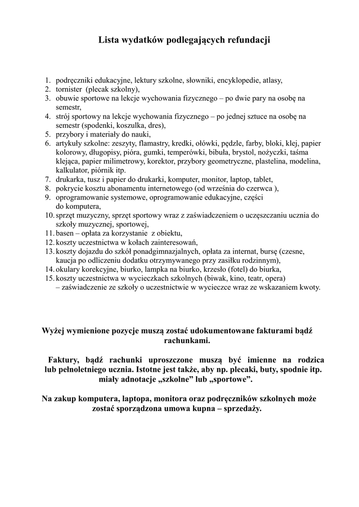 Lista wydatków podlegających refundacji 1. podręczniki edukacyjne, lektury szkolne, słowniki, encyklopedie, atlasy, 2. tornister (plecak szkolny), 3. obuwie sportowe na lekcje wychowania fizycznego – po dwie pary na osobę na semestr, 4. strój sportowy na lekcje wychowania fizycznego – po jednej sztuce na osobę na semestr (spodenki, koszulka, dres), 5. przybory i materiały do nauki, 6. artykuły szkolne: zeszyty, flamastry, kredki, ołówki, pędzle, farby, bloki, klej, papier kolorowy, długopisy, pióra, gumki, temperówki, bibuła, brystol, nożyczki, taśma klejąca, papier milimetrowy, korektor, przybory geometryczne, plastelina, modelina, kalkulator, piórnik itp. 7. drukarka, tusz i papier do drukarki, komputer, monitor, laptop, tablet, 8. pokrycie kosztu abonamentu internetowego (od września do czerwca ), 9. oprogramowanie systemowe, oprogramowanie edukacyjne, części do komputera, 10. sprzęt muzyczny, sprzęt sportowy wraz z zaświadczeniem o uczęszczaniu ucznia do szkoły muzycznej, sportowej, 11. basen – opłata za korzystanie z obiektu, 12. koszty uczestnictwa w kołach zainteresowań, 13. koszty dojazdu do szkół ponadgimnazjalnych, opłata za internat, bursę (czesne, kaucja po odliczeniu dodatku otrzymywanego przy zasiłku rodzinnym), 14. okulary korekcyjne, biurko, lampka na biurko, krzesło (fotel) do biurka, 15. koszty uczestnictwa w wycieczkach szkolnych (biwak, kino, teatr, opera) – zaświadczenie ze szkoły o uczestnictwie w wycieczce wraz ze wskazaniem kwoty. Wyżej wymienione pozycje muszą zostać udokumentowane fakturami bądź rachunkami. Faktury, bądź rachunki uproszczone muszą być imienne na rodzica lub pełnoletniego ucznia. Istotne jest także, aby np. plecaki, buty, spodnie itp. miały adnotacje „szkolne” lub „sportowe”. Na zakup komputera, laptopa, monitora oraz podręczników szkolnych może zostać sporządzona umowa kupna – sprzedaży.