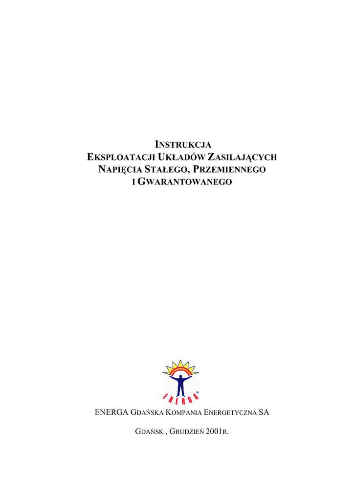 INSTRUKCJA EKSPLOATACJI UKŁADÓW ZASILAJĄCYCH NAPIĘCIA STAŁEGO, PRZEMIENNEGO I GWARANTOWANEGO ENERGA GDAŃSKA KOMPANIA ENERGETYCZNA SA GDAŃSK , GRUDZIEŃ 2001R. Instrukcja eksploatacji układów zasilających Podpisem stwierdzam, że zapoznałem się z niniejszą instrukcją i zobowiązuję się do jej przestrzegania: Podpis Stanowisko Imię i nazwisko Data zapoznanego zapoznanego zapoznanego Lp. potwierz instrukcją z instrukcją z instrukcją dzenia 1 2 3 4 5 6 7 8 9 10 11 12 13 14 15 16 17 18 19 20 21 22 23 2 Instrukcja eksploatacji układów zasilających 24 25 26 27 28 29 30 31 32 33 34 35 36 37 38 39 40 41 42 43 44 45 46 47 48 3 Instrukcja eksploatacji układów zasilających Spis treści 1. 2. 3. 4. 5. 6. 7. 8. Wstęp .................................................................................................................... 1.1. Przedmiot instrukcji .................................................................................... 1.2. Zakres instrukcji .......................................................................................... 1.3. Przeznaczenie instrukcji .............................................................................. 1.4. Definicje określeń stosowanych w instrukcji .............................................. 1.5. Dokumenty związane .................................................................................. Wymagania ........................................................................................................... 2.1. Wymagania zdrowotne i psychologiczne ................................................... 2.2. Wymagania kwalifikacyjne ......................................................................... Dokumentacja ....................................................................................................... 3.1. Wykaz dokumentacji ................................................................................... 3.2. Miejsce przechowywania dokumentacji ..................................................... 3.3. Aktualizacja dokumentacji .......................................................................... Zakresy prac eksploatacyjnych ............................................................................. 4.1. Zabiegi eksploatacyjne przy rozdzielnicach potrzeb własnych prądu stałego .............................................................................................................. 4.2. Zabiegi eksploatacyjne przy bateriach akumulatorów i prostownikach ..... 4.3. Zabiegi eksploatacyjne przy rozdzielnicach prądu przemiennego ............. 4.4. Zabiegi eksploatacyjne przy systemach bezprzerwowego zasilania - UPS i przetwornice tyrystorowe .......................................................................... Zagrożenia przy wykonywaniu prac .................................................................... 5.1. Zagrożenia podczas wykonywania prac przy bateriach akumulatorów ...... Terminy wykonywania prac eksploatacyjnych .................................................... 6.1. Baterie akumulatorów i prostowniki ........................................................... 6.2. Rozdzielnice prądu stałego i przemiennego ................................................ 6.3. Systemy bezprzerwowego zasilania ............................................................ Wycofywanie urządzeń z eksploatacji ................................................................. 7.1. Ocena stanu technicznego ........................................................................... 7.2. Utylizacja odpadów ..................................................................................... Zapasy awaryjne ................................................................................................... 4 8 8 8 8 8 12 14 14 14 14 14 15 15 15 15 16 24 26 28 28 29 29 30 30 31 31 31 31 Instrukcja eksploatacji układów zasilających 1. WSTĘP 1.1. Przedmiot instrukcji Instrukcja określa wymagania i zasady w zakresie obsługi i konserwacji układów zasilających: a) napięcia stałego, b) napięcia przemiennego, c) napięcia gwarantowanego. Instrukcja dotyczy urządzeń już zainstalowanych, które przeszły procedurę uruchomienia, eksploatowanych w obiektach elektroenergetycznych. 1.2. Zakres instrukcji Instrukcja obowiązuje w zakresie wykonywania: • oględzin i przeglądów urządzeń wymienionych w pkt. 1.1., • prac eksploatacyjnych innych urządzeń elektroenergetycznych w części dotyczącej zasilania napięciem pomocniczym. Instrukcja nie obowiązuje w zakresie: • badań laboratoryjnych, • ruchu próbnego urządzeń, • napraw serwisowych. Badania urządzeń nowych i zmodernizowanych należy przeprowadzać zgodnie z „Instrukcją badań odbiorczych oraz przyjmowania urządzeń elektroenergetycznych do eksploatacji” wydaną przez PTPiREE w styczniu 2001 roku wykorzystując metody i zakresy realizacji badań ujęte w tej instrukcji. 1.3. Przeznaczenie instrukcji Instrukcja przeznaczona jest dla pracowników eksploatujących układy zasilające napięcia stałego, przemiennego i gwarantowanego w stacjach elektroenergetycznych, siłowniach telekomunikacyjnych i pomieszczeniach informatycznych (serwerowniach) zatrudnionych na stanowiskach dozoru i eksploatacji, a także dla dyżurnych stacji w zakresie oględzin ww. układów. 1.4. Definicje określeń stosowanych w instrukcji 1.4.1. Agregat prądotwórczy - rezerwowe źródło zasilania z długim czasem podtrzymywania. 1.4.2. Automatyka SZR - Układ samoczynnego sterowania łącznikami załączającymi i wyłączającymi obwody zasilania rezerwowego. Rodzaje automatyk SZR: a) automatyka SZR z samoczynnym powrotem przy ponownym pojawieniu się napięcia na szynach rozdzielni dwusekcyjnej, 5 Instrukcja eksploatacji układów zasilających b) automatyka SZR z samoczynnym powrotem przy ponownym pojawieniu się napięcia na szynach rozdzielni wielosekcyjnej, c) automatyka SZR z samoczynnym powrotem przy ponownym 