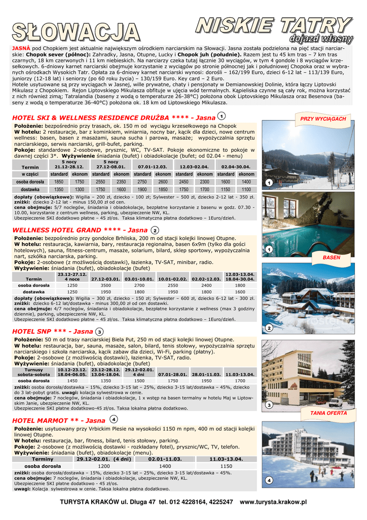 JASNÁ pod Chopkiem jest aktualnie największym ośrodkiem narciarskim na Słowacji. Jasna została podzielona na pięć stacji narciarskie: Chopok sever (północ): Zahradky, Jasna, Otupne, Lucky i Chopok juh (południe). Razem jest tu 45 km tras – 7 km tras czarnych, 18 km czerwonych i 11 km niebieskich. Na narciarzy czeka tutaj łącznie 30 wyciągów, w tym 4 gondole i 8 wyciągów krzesełkowych. 6-dniowy karnet narciarski obejmuje korzystanie z wyciągów po stronie północnej jak i południowej Chopoka oraz w wybranych ośrodkach Wysokich Tatr. Opłata za 6-dniowy karnet narciarski wynosi: dorośli – 162/199 Euro, dzieci 6-12 lat – 113/139 Euro, juniorzy (12-18 lat) i seniorzy (po 60 roku życia) – 130/159 Euro. Key card – 2 Euro. Hotele usytuowane są przy wyciągach w Jasnej, wille prywatne, chaty i pensjonaty w Demianowskiej Dolinie, która łączy Liptovski Mikulasz z Chopokiem. Rejon Liptovskiego Mikulasza obfituje w ujęcia wód termalnych. Kąpieliska czynne są cały rok, można korzystać z nich również zimą; Tatralandia (baseny z wodą o temperaturze 26-38°C) położona obok Liptovskiego Mikulasza oraz Besenova (baseny z wodą o temperaturze 36-40°C) położona ok. 18 km od Liptowskiego Mikulasza. HOTEL SKI & WELLNESS RESIDENCE DRUŻBA **** - Jasna 1 PRZY WYCIĄGACH Położenie: bezpośrednio przy trasach, ok. 150 m od wyciągu krzesełkowego na Chopok W hotelu: 2 restauracje, bar z kominkiem, winiarnia, nocny bar, kącik dla dzieci, nowe centrum wellness: basen, basen z masażami, sauna sucha i parowa, masaże; wypożyczalnia sprzętu narciarskiego, serwis narciarski, grill-bufet, parking. Pokoje: standardowe 2-osobowe, prysznic, WC, TV-SAT. Pokoje ekonomiczne to pokoje w dawnej części 3*. Wyżywienie śniadania (bufet) i obiadokolacje (bufet; od 02.04 - menu) 5 nocy 21.12-28.12. Termin w części 5 nocy 27.12-08.01. 07.01-12.03. 12.03-02.04. 02.04-30.04. standard ekonom standard ekonom standard ekonom standard ekonom standard ekonom osoba dorosła 1850 1750 2550 2350 2750 2600 2450 2300 1600 1400 dostawka 1350 1300 1750 1600 1900 1850 1750 1700 1150 1100 1 dopłaty (obowiązkowe): Wigilia – 200 zł, dziecko - 100 zł; Sylwester – 500 zł, dziecko 2-12 lat - 350 zł. zniżki: dziecko 2-12 lat - minus 150,00 zł od cen. cena obejmuje: 5/7 noclegów, śniadania i obiadokolacje, bezpłatne korzystanie z basenu w godz. 07.30 10.00, korzystanie z centrum wellness, parking, ubezpieczenie NW, KL. Ubezpieczenie SKI dodatkowo płatne – 45 zł/os. Taksa klimatyczna płatna dodatkowo – 1Euro/dzień. WELLNESS HOTEL GRAND **** - Jasna 2 Położenie: bezpośrednio przy gondolce Brhliska, 200 m od stacji kolejki linowej Otupne. W hotelu: restauracja, kawiarnia, bary, restauracja regionalna, basen 6x9m (tylko dla gości hotelowych), sauna, fitness-centrum, masaże, solarium, bilard, sklep sportowy, wypożyczalnia nart, szkółka narciarska, parking. Pokoje: 2-osobowe (z możliwością dostawki), łazienka, TV-SAT, minibar, radio. Wyżywienie: śniadania (bufet), obiadokolacje (bufet) Termin 23.12-27.12. 4 noce 27.12-03.01. 03.01-10.01. 10.01-02.02. 02.02-12.03. 12.03-13.04. 18.04-30.04. osoba dorosła 1250 3500 2700 2550 2400 1800 dostawka 1250 1950 1800 1950 1800 1600 1 BASEN dopłaty (obowiązkowe): Wigilia – 300 zł, dziecko - 150 zł; Sylwester – 600 zł, dziecko 6-12 lat - 300 zł. zniżki: dziecko 6-12 lat/dostawka - minus 300,00 zł od cen dostawki. cena obejmuje: 4/7 noclegów, śniadania i obiadokolacje, bezpłatne korzystanie z wellness (max 3 godziny dziennie), parking, ubezpieczenie NW, KL. Ubezpieczenie SKI dodatkowo płatne – 45 zł/os. Taksa klimatyczna płatna dodatkowo – 1Euro/dzień. HOTEL SNP *** - Jasna 2 3 Położenie: 50 m od trasy narciarskiej Biela Put, 250 m od stacji kolejki linowej Otupne. W hotelu: restauracja, bar, sauna, masaże, salon, bilard, tenis stołowy, wypożyczalnia sprzętu narciarskiego i szkoła narciarska, kącik zabaw dla dzieci, Wi-Fi, parking (płatny). Pokoje: 2-osobowe (z możliwością dostawki), łazienka, TV-SAT, radio. Wyżywienie: śniadania (bufet), obiadokolacje (bufet) Turnusy sobota-sobota 10.12-23.12. 18.04-06.05. 23.12-28.12. 13.04-18.04. 29.12-02.01. 4 dni 07.01-28.01. 28.01-11.03. 11.03-13.04. osoba dorosła 1450 1350 1500 1750 1950 1700 zniżki: osoba dorosła/dostawka – 15%, dziecko 3-15 lat – 25%, dziecko 3-15 lat/dostawka – 45%, dziecko do 3 lat-pobyt gratis. uwagi: kolacja sylwestrowa w cenie. cena obejmuje: 7 noclegów, śniadania i obiadokolacje, 1 x wstęp na basen termalny w hotelu Maj w Liptowskim Janie, ubezpieczenie NW, KL. Ubezpieczenie SKI płatne dodatkowo-45 zł/os. Taksa lokalna płatna dodatkowo. 3 TANIA OFERTA HOTEL MARMOT ** - Jasna 4 Położenie: usytuowany przy Vrbickim Plesie na wysokości 1150 m npm, 400 m od stacji kolejki linowej Otupne. W hotelu: restauracja, bar, fitness, bilard, tenis stołowy, parking. Pokoje: 2-osobowe (z możliwością dostawki - rozkładany fotel), prysznic/WC, TV, telefon. Wyżywienie: śniadania (bufet), obiadokolacje (menu). Terminy 29.12-02.01. (4 dni) 02.01-11.03. 11.03-13.04. osoba dorosła 1200 1400 1150 zniżki: osoba dorosła/dostawka – 15%, dziecko 3-15 lat – 25%, dziecko 3-15 lat/dostawka – 45%. cena obejmuje: 7 noclegów, śniadania i obiadokolacje, ubezpieczenie NW, KL. Ubezpieczenie SKI płatne dodatkowo - 45 zł/os. uwagi: Kolacja sylwestrowa w cenie. Taksa lokalna płatna dodatkowo. TURYSTA KRAKÓW ul. Długa 47 tel. 012 4228164, 4225247 4 www.turysta.krakow.pl 1 HOTEL SRDIECKO *** - Chopok Południe PRZY WYCIĄGACH 1 Położenie: usytuowany na wyskości 1213 m npm w centrum Chopok Południe. W pobliżu dolna stacja 4-osobowej krzesełkowej kolei Srdiečko – Kosodrevina. W hotelu: restauracja, bar, zewnętrzne jacuzzi, sauny, pokój relaksacyjny, kącik dla dzieci, bilard, przechowalnia nart, parking. Pokoje: 2-osobowe (z możliwością dostawki), prysznic, WC, TV-SAT. Wyżywienie: śniadania (bufet), kolacje (men