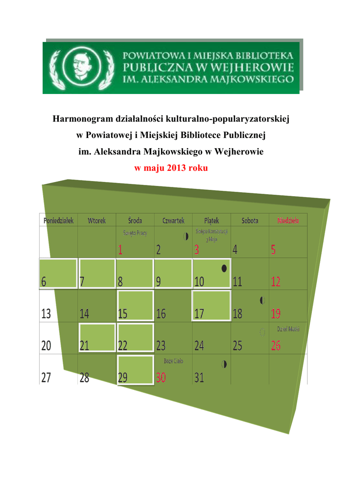 Harmonogram działalności kulturalno-popularyzatorskiej w Powiatowej i Miejskiej Bibliotece Publicznej im. Aleksandra Majkowskiego w Wejherowie w maju 2013 roku 06.05 – 10.05 – Tydzień Bibliotek „Biblioteka przestrzenią dla kreatywnych. Kreatywni wczoraj i dziś” 06.05 godz. 10.00 – ratuszowa sala narad Urzędu Miejskiego przy placu Jakuba Wejhera 8 wykład dr Justyny Pomierskiej – adiunkta w Katedrze Polonistyki Stosowanej Uniwersytetu Gdańskiego na temat współczesnego odbioru poezji księdza Pasierba. Wykład interaktywny, transmitowany na żywo w Internecie. Po wykładzie wręczenie nagród w konkursie na interpretację poezji księdza Pasierba. 07.05 maraton biblioteczny – zajęcia dla dzieci z klas 0-3 SP z wykorzystaniem różnorodnych technik multimedialnych : „Zaczarowana kraina”, „Otchłań złości” oraz lekcje biblioteczne w Czytelni Naukowej dla uczniów klas 4-6 SP (zajęcia dla grup zorganizowanych, obowiązują wcześniejsze zapisy) 08.05 maraton biblioteczny – zajęcia dla dzieci z klas 0-3 SP z wykorzystaniem różnorodnych technik multimedialnych : „Zaczarowana kraina”, „Otchłań złości” oraz lekcje biblioteczne w Czytelni Naukowej dla uczniów klas 4-6 SP (zajęcia dla grup zorganizowanych, obowiązują wcześniejsze zapisy) 09.05 godz. 12.00 – spotkanie z Pauliną Wnuk – autorką blogu „From movie to kitchen" nagrodzonego pierwszym miejscem w ogólnopolskim konkursie „Blog roku 2012”. Spotkanie poprowadzi Aleksandra Michalak – autorka blogu „Matka Sanepid” i książki pod tym samym tytułem, nagrodzonej w konkursie „Gryf Literacki 2012”. 10.05 godz. 10.00 – 14.00 - „Telewizja Tuwimowska – kreatywne reportaże o Julianie Tuwimie” – zajęcia dla uczniów klas 4-6 SP z wykorzystaniem technik multimedialnych (zajęcia dla grup zorganizowanych, obowiązują wcześniejsze zapisy) 10.05 godz. 17.00 - „Czôrlińsczi na scenie - w 75. Rocznicę śmierci Aleksandra Majkowskiego” Aula Gimnazjum nr 1 w Wejherowie – przedstawienie „Bôjka ò zbójcu Czôrlińsczim" w wykonaniu chórzystów z Chóru Męskiego „Harmonia” w reżyserii Eweliny Kuc Ponadto przez cały tydzień (07.05-10.05) konkursy z nagrodami i twórcze zabawy plastyczne w Wypożyczalni dla Dzieci i Młodzieży oraz „Wróżka czyta dzieciom” w kąciku zabaw dla małych dzieci. 15.05 (środa) godz. 17.00 – wernisaż fotografii autorstwa uczniów z sekcji fotograficznej z II Liceum Ogólnokształcącego w Wejherowie pt. „Cztery pory roku” 17.05 (piątek) godz. 16.00 – spotkanie Dyskusyjnego Klubu Książki dla Młodzieży poświęcone książce Marcina Szczygielskiego „Za niebieskimi drzwiami”. 21.05. (wtorek) godz. 11.30 – spotkanie autorskie z Ewą Nowak – polską pisarką i publicystką, autorką książek dla dzieci i młodzieży, min. „Wszystko tylko nie mięta”, „Diupa”, „Bardzo biała wrona”, „Pajączek na rowerze”. Spotkanie w ramach Dyskusyjnego Klubu Książki dla Młodzieży. 22.05. (środa) godz. 11.00 – spotkanie Klubu Małego Czytelnika 29.05 (środa) godz. 12.30 – projekt „Literackie spacery po Wejherowie” Spacer trzeci. Ratusz w literaturze, publicystyce i fotografii – Henryk Połchowski. maj – spotkanie Dyskusyjnego Klubu Książki dla Dorosłych maj – realizacja projektu „Czytam, więc wszystko gra!” dofinansowanego ze środków Ministerstwa Kultury i Dziedzictwa Narodowego, nagranie słuchowisk radiowych dla dzieci na podstawie książek Anny CzerwińskiejRydel „Wędrując po niebie z Janem Heweliuszem” i „Ciepło-zimno. Zagadka Fahrenheita”. Wystawki związane z rocznicami: Tydzień Bibliotek (08.-15.05) – organizowany po raz dziesiąty przez Stowarzyszenie Bibliotekarzy Polskich program promocji czytelnictwa i bibliotek. Ma on na celu podkreślanie roli bibliotek w poprawie jakości życia, edukacji oraz zwiększanie prestiżu zawodu bibliotekarza i zainteresowania książką szerokich kręgów społeczeństwa polskiego. Hasłem Tygodnia Bibliotek 2013 jest „Biblioteka przestrzenią dla kreatywnych”– Czytelnia Naukowa. 130. rocznica śmierci Cypriana Kamila Norwida (23.05) – polskiego poety, prozaika, dramatopisarza, eseisty, grafika, rzeźbiarza, malarza i filozofa – Wypożyczalnia dla Dorosłych 310. rocznica śmierci CHARLESA PERRAULTA (16.05) – pisarza francuskiego, autora baśni opartych na motywach ludowych, m.in.: „Kot w butach”, „Czerwony Kapturek”, „Kopciuszek”, „Śpiąca królewna” – Filia nr 2 70. rocznica urodzin MARII EKIER (04.05) – graficzki, ilustratorki, autorki ilustracji do książek dla dzieci, m.in.: H. Krall („Co się stało z naszą bajką”), J. Kulmowej („Dębołki”), A. Onichimowskiej („Dobry potwór nie jest zły”), M. E. Letki („Królewna w koronie” – wyróżnienie Książka Roku 2005), do antologii („Polskie baśnie i legendy”) – Wypożyczalnia dla Dzieci i Młodzieży Biblioteka zastrzega sobie prawo do zmian w harmonogramie. Szczegółowe i aktualne informacje na stronie www.biblioteka.wejherowo.pl oraz www.facebook.com/BibliotekaWejherowo www.bibliotekawejherowo.blox.pl