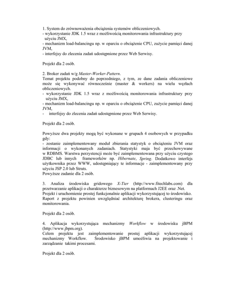 1. System do zrównoważenia obciążenia systemów obliczeniowych. - wykorzystanie JDK 1.5 wraz z możliwością monitorowania infrastruktury przy użyciu JMX, - mechanizm load-balancingu np. w oparciu o obciążenie CPU, zużycie pamięci danej JVM, - interfejsy do zlecenia zadań udostępnione przez Web Serwisy. Projekt dla 2 osób. 2. Broker zadań w/g Master-Worker-Pattern. Temat projektu podobny do poprzedniego, z tym, ze dane zadania obliczeniowe może się wykonywać równocześnie (master & workers) na wielu węzłach obliczeniowych. - wykorzystanie JDK 1.5 wraz z możliwością monitorowania infrastruktury przy użyciu JMX, - mechanizm load-balancingu np. w oparciu o obciążenie CPU, zużycie pamięci danej JVM, - interfejsy do zlecenia zadań udostępnione przez Web Serwisy. Projekt dla 2 osób. Powyższe dwa projekty mogą być wykonane w grupach 4 osobowych w przypadku gdy: - zostanie zaimplementowany moduł zbierania statystyk o obciążeniu JVM oraz informacji o wykonanych zadaniach. Statystyki maja być przechowywane w RDBMS. Warstwa perzystencji może być zaimplementowana przy użyciu czystego JDBC lub innych frameworków np. Hibernate, Spring. Dodatkowo interfejs użytkownika przez WWW, udostępniający te informacje - zaimplementowany przy użyciu JSP 2.0 lub Struts. Powyższe zadanie dla 2 osób. 3. Analiza środowiska gridowego X-Tier (http://www.fitechlabs.com) dla przetwarzanie aplikacji o charakterze biznesowym na platformach J2EE oraz .Net. Projekt i uruchomienie prostej funkcjonalnie aplikacji wykorzystującej to środowisko. Raport z projektu powinien uwzględniać architekturę brokera, clusteringu oraz monitorowania. Projekt dla 2 osób. 4. Aplikacja wykorzystująca mechanizmy Workflow w środowisku jBPM (http://www.jbpm.org). Celem projektu jest zaimplementowanie prostej aplikacji wykorzystującej mechanizmy Workflow. Środowisko jBPM umożliwia na projektowanie i zarządzanie takimi procesami. Projekt dla 2 osób.