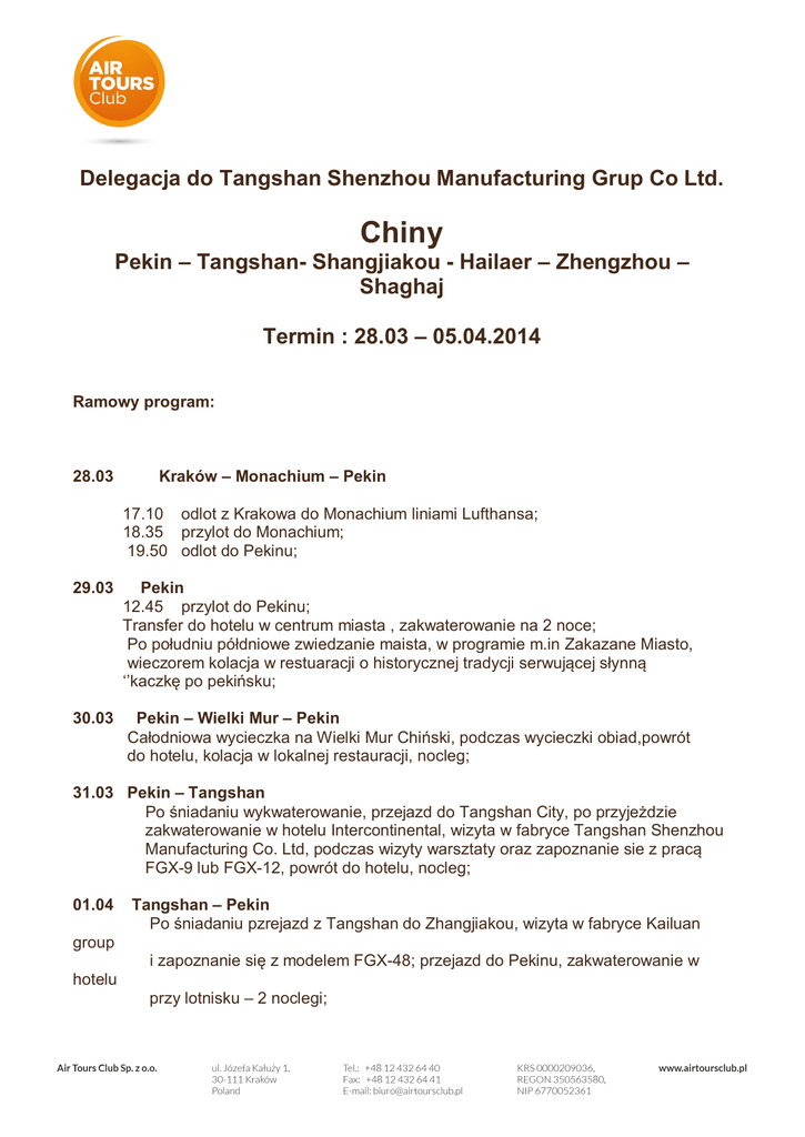 Delegacja do Tangshan Shenzhou Manufacturing Grup Co Ltd. Chiny Pekin – Tangshan- Shangjiakou - Hailaer – Zhengzhou – Shaghaj Termin : 28.03 – 05.04.2014 Ramowy program: 28.03 Kraków – Monachium – Pekin 17.10 odlot z Krakowa do Monachium liniami Lufthansa; 18.35 przylot do Monachium; 19.50 odlot do Pekinu; 29.03 Pekin 12.45 przylot do Pekinu; Transfer do hotelu w centrum miasta , zakwaterowanie na 2 noce; Po po udniu pó dniowe zwiedzanie maista, w programie m.in Zakazane Miasto, wieczorem kolacja w restuaracji o historycznej tradycji serwuj cej s ynn ‘’kaczk po peki sku; 30.03 Pekin – Wielki Mur – Pekin Ca odniowa wycieczka na Wielki Mur Chi ski, podczas wycieczki obiad,powrót do hotelu, kolacja w lokalnej restauracji, nocleg; 31.03 Pekin – Tangshan Po niadaniu wykwaterowanie, przejazd do Tangshan City, po przyje dzie zakwaterowanie w hotelu Intercontinental, wizyta w fabryce Tangshan Shenzhou Manufacturing Co. Ltd, podczas wizyty warsztaty oraz zapoznanie sie z prac FGX-9 lub FGX-12, powrót do hotelu, nocleg; 01.04 Tangshan – Pekin Po niadaniu pzrejazd z Tangshan do Zhangjiakou, wizyta w fabryce Kailuan group i zapoznanie si z modelem FGX-48; przejazd do Pekinu, zakwaterowanie w hotelu przy lotnisku – 2 noclegi; 02.04 Pekin – Hailaer – Pekin Wcze nie rano transfer na lotnisko; 07.15 odlot z Pekinu do Hailaer City; 09.30 przylot do Hailaer; Przejazd do kopalni Tongda wykorzystuj cej model FGX-48; zapoznanie si z prac maszyny; Przejazd na lotnisko; 21.55 odlot do pekinu; 23.55 przylot do Pekinu; Transfer do hotelu przy lotnisku, nocleg; 03.04 Pekin - Zhengzhou Wykwaterowanie i transfer na lotnisko; 09.05 odlot do Zhengzhou; 10.45 przylot do Zhenzhou; Przejazd do kopalni w gla Xiangyang, wykorzytsuj cej model FGX-24, zapoznanie si z prac maszyny; nocleg w Zhengzhou; 04.04 Zhengzhou – Shanghaj Transfer na lotnisko; 08.05 odlot do Shanghaju; 09.40 przylot do Shanghaju; Transfer do centrum miasta, zakwaterowanie, zwiedzanie Shanghaju, obiad w lokalnej restauracji, wieczorem kolacja w lokalnej restauracji - degustacja potraw kuchni seczuanskiej; 05.04 Shanghaj – Frankfurt – Kraków Po niadaniu transfer na lotnisko; 13.15 odlot do Frankfurtu; 19.10 przylot do Frankfurtu; 21.05 odlot do Krakowa; 22.35 przylot do Krakowa.