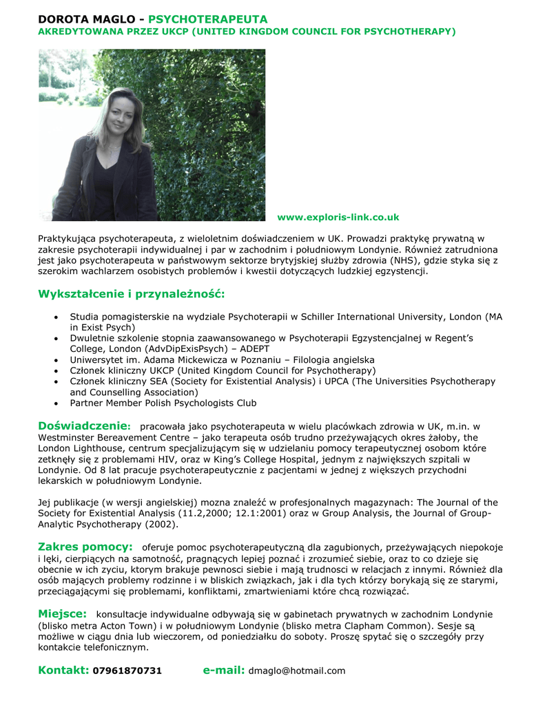 DOROTA MAGLO - PSYCHOTERAPEUTA AKREDYTOWANA PRZEZ UKCP (UNITED KINGDOM COUNCIL FOR PSYCHOTHERAPY) www.exploris-link.co.uk Praktykująca psychoterapeuta, z wieloletnim doświadczeniem w UK. Prowadzi praktykę prywatną w zakresie psychoterapii indywidualnej i par w zachodnim i południowym Londynie. Również zatrudniona jest jako psychoterapeuta w państwowym sektorze brytyjskiej służby zdrowia (NHS), gdzie styka się z szerokim wachlarzem osobistych problemów i kwestii dotyczących ludzkiej egzystencji. Wykształcenie i przynależność: Studia pomagisterskie na wydziale Psychoterapii w Schiller International University, London (MA in Exist Psych) Dwuletnie szkolenie stopnia zaawansowanego w Psychoterapii Egzystencjalnej w Regent’s College, London (AdvDipExisPsych) – ADEPT Uniwersytet im. Adama Mickewicza w Poznaniu – Filologia angielska Członek kliniczny UKCP (United Kingdom Council for Psychotherapy) Członek kliniczny SEA (Society for Existential Analysis) i UPCA (The Universities Psychotherapy and Counselling Association) Partner Member Polish Psychologists Club Doświadczenie: pracowała jako psychoterapeuta w wielu placówkach zdrowia w UK, m.in. w Westminster Bereavement Centre – jako terapeuta osób trudno przeżywających okres żałoby, the London Lighthouse, centrum specjalizującym się w udzielaniu pomocy terapeutycznej osobom które zetknęły się z problemami HIV, oraz w King’s College Hospital, jednym z największych szpitali w Londynie. Od 8 lat pracuje psychoterapeutycznie z pacjentami w jednej z większych przychodni lekarskich w południowym Londynie. Jej publikacje (w wersji angielskiej) mozna znaleźć w profesjonalnych magazynach: The Journal of the Society for Existential Analysis (11.2,2000; 12.1:2001) oraz w Group Analysis, the Journal of GroupAnalytic Psychotherapy (2002). Zakres pomocy: oferuje pomoc psychoterapeutyczną dla zagubionych, przeżywających niepokoje i lęki, cierpiących na samotność, pragnących lepiej poznać i zrozumieć siebie, oraz to co dzieje się obecnie w ich zyciu, ktorym brakuje pewnosci siebie i mają trudnosci w relacjach z innymi. Również dla osób mających problemy rodzinne i w bliskich związkach, jak i dla tych którzy borykają się ze starymi, przeciągającymi się problemami, konfliktami, zmartwieniami które chcą rozwiązać. Miejsce: konsultacje indywidualne odbywają się w gabinetach prywatnych w zachodnim Londynie (blisko metra Acton Town) i w południowym Londynie (blisko metra Clapham Common). Sesje są możliwe w ciągu dnia lub wieczorem, od poniedziałku do soboty. Proszę spytać się o szczegóły przy kontakcie telefonicznym. Kontakt: 07961870731 e-mail: [email protected]
