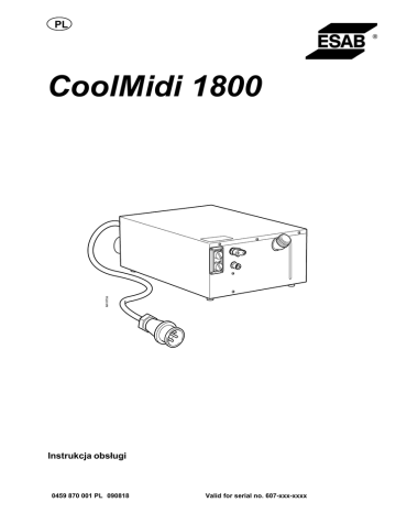 PL CoolMidi 1800 Instrukcja obsługi 0459 870 001 PL 090818 Valid for serial no. 607-xxx-xxxx 1 DYREKTYWA . . . . . . . . . . . . . . . . . . . . . . . . . . . . . . . . . . . . . . . . . . . . . . . . . . . . . . 2 Bezpieczeństwo . . . . . . . . . . . . . . . . . . . . . . . . . . . . . . . . . . . . . . . . . . . . . . . . . . . 3 WPROWADZENIE . . . . . . . . . . . . . . . . . . . . . . . . . . . . . . . . . . . . . . . . . . . . . . . . . . 3.1 3 3 5 Sprzęt . . . . . . . . . . . . . . . . . . . . . . . . . . . . . . . . . . . . . . . . . . . . . . . . . . . . . . . . . . . . . . . . . . . 5 4 DANE TECHNICZNE . . . . . . . . . . . . . . . . . . . . . . . . . . . . . . . . . . . . . . . . . . . . . . . . 5 INSTALACJA . . . . . . . . . . . . . . . . . . . . . . . . . . . . . . . . . . . . . . . . . . . . . . . . . . . . . . 5 6 5.1 5.2 5.3 5.4 Lokalizacja . . . . . . . . . . . . . . . . . . . . . . . . . . . . . . . . . . . . . . . . . . . . . . . . . . . . . . . . . . . . . . . Zasilanie sieciowe . . . . . . . . . . . . . . . . . . . . . . . . . . . . . . . . . . . . . . . . . . . . . . . . . . . . . . . . . Podłączanie sprzętu zgrzewającego . . . . . . . . . . . . . . . . . . . . . . . . . . . . . . . . . . . . . . . . . . Podłączanie rezystora bezpieczeństwa . . . . . . . . . . . . . . . . . . . . . . . . . . . . . . . . . . . . . . . 6 6 6 7 6 OBSŁUGA . . . . . . . . . . . . . . . . . . . . . . . . . . . . . . . . . . . . . . . . . . . . . . . . . . . . . . . . . 7 6.1 6.2 6.3 Podłączenia . . . . . . . . . . . . . . . . . . . . . . . . . . . . . . . . . . . . . . . . . . . . . . . . . . . . . . . . . . . . . . Przyłącze wody . . . . . . . . . . . . . . . . . . . . . . . . . . . . . . . . . . . . . . . . . . . . . . . . . . . . . . . . . . . Ochrona przepływu wody . . . . . . . . . . . . . . . . . . . . . . . . . . . . . . . . . . . . . . . . . . . . . . . . . . . 7 8 8 7 KONSERWACJA . . . . . . . . . . . . . . . . . . . . . . . . . . . . . . . . . . . . . . . . . . . . . . . . . . . 8 7.1 7.2 Kontrola i czyszczenie . . . . . . . . . . . . . . . . . . . . . . . . . . . . . . . . . . . . . . . . . . . . . . . . . . . . . Dolewanie chłodziwa . . . . . . . . . . . . . . . . . . . . . . . . . . . . . . . . . . . . . . . . . . . . . . . . . . . . . . . 8 9 8 WYSZUKIWANIE USZKODZEŃ . . . . . . . . . . . . . . . . . . . . . . . . . . . . . . . . . . . . . . 9 ZAMAWIANIE CZĘŚCI ZAMIENNYCH . . . . . . . . . . . . . . . . . . . . . . . . . . . . . . . . SCHEMAT . . . . . . . . . . . . . . . . . . . . . . . . . . . . . . . . . . . . . . . . . . . . . . . . . . . . . . . . . . . . NUMER ZAMÓWIENIOWY . . . . . . . . . . . . . . . . . . . . . . . . . . . . . . . . . . . . . . . . . . . . . WYPOSAŻENIE . . . . . . . . . . . . . . . . . . . . . . . . . . . . . . . . . . . . . . . . . . . . . . . . . . . . . . . 9 9 10 14 15 Zastrzegamy sobie prawo do wprowadzenia zmian. TOCo -2- PL 1 DYREKTYWA ZAPEWNIENIE ZGODNOŚCI Z NORMA ESAB AB, Welding Equipment, SE-695 81 Laxå, Szwecja, zapewnia z pelną odpowiedzialnością że agregat chłodniczy CoolMidi 1800 od numeru seryjnego 607 zostaľy skonstruowane i przetestowane zgodnie z normą EN 60974-2, EN 60974-10 (Class A) według warunków ustalonych w dyrektywie (2006/95/EEG), (2004/108/EEG). -------------------------------------------------------------------------------------------------------------Laxå 2008-08-12 Kent Eimbrodt Global Director Equipment and Automation 2 BEZPIECZEŃSTWO Użytkownicy sprzętu spawalniczego firmy ESAB są odpowiedzialni za przestrzeganie odpowiednich przepisów bezpieczeństwa przez osoby pracujące z lub przy tym sprzęcie. Zasady bezpieczeństwa muszą być zgodne z wymaganiami stawianymi tego rodzaju sprzętowi. Poza standardowymi przepisami dotyczącymi miejsca pracy należy przestrzegać przedstawionych zaleceń. Wszelkie prace muszą być wykonywane przez przeszkolony personel, dobrze znający zasady działania sprzętu spawalniczego. Niewłaściwe działanie sprzętu może prowadzić do sytuacji niebezpiecznych, a w rezultacie do obrażeń operatora oraz uszkodzenia sprzętu. 1. Każdy, kto używa sprzętu spawalniczego, musi znać się na: S jego obsłudze S lokalizacji przycisków awaryjnego zatrzymania S jego działaniu S odpowiednich środków ostrożności S spawaniu 2. Operator musi upewnić się, że: S w momencie uruchomienia sprzętu w miejscu pracy nie znajduje się żadna nieupoważniona osoba S w chwili zajarzenia łuku wszystkie osoby są odpowiednio zabezpieczone 3. Miejsce pracy musi być: S odpowiednie do tego celu S wolne od przeciągów 4. Sprzęt ochrony osobistej S Należy zawsze stosować zalecany sprzęt ochrony osobistej, taki jak okulary ochronne, odzież ognioodporna, rękawice ochronne. Uwaga! Nie należy nosić rękawic ochronnych podczas wymiany drutu. S Nie należy nosić żadnych luźnych przedmiotów, takich jak szaliki, bransolety, pierścionki, itp., które mogłyby się o coś zahaczyć lub spowodować poparzenie. 5. Ogólne środki ostrożności S Należy upewnić się czy przewód powrotny został prawidłowo podłączony. S Praca na sprzęcie o wysokim napięciu powinna być wykonywana wyłącznie przez wykwalifikowanego elektryka. S Odpowiedni sprzęt gaśniczy powinien być wyraźnie oznaczony i znajdować się w pobliżu. S Smarowania i konserwacji sprzętu nie wolno przeprowadzać podczas jego pracy. bk06d1oa -3- PL OSTROŻNIE! Przed instalacją i rozruchem urządzenia należy zapoznać się z niniejszą instrukcją. OSTRZEŻENIE Spawanie i cięcie łukowe może zagrażać bezpieczeństwu operatora i pozostałych osób przebywających w pobliżu. Dlatego podczas spawania należy zachować szczególne środki ostrożności. Przed przystąpieniem do spawania zapoznaj się z przepisami bezpieczeństwa i higieny pracy obowiązująymi na twoism stanowisku pracy. PORAŻENIE ELEKTRYCZNE - może być przyczyną śmierci. S Urządzenie spawalnicze należy zainstalow