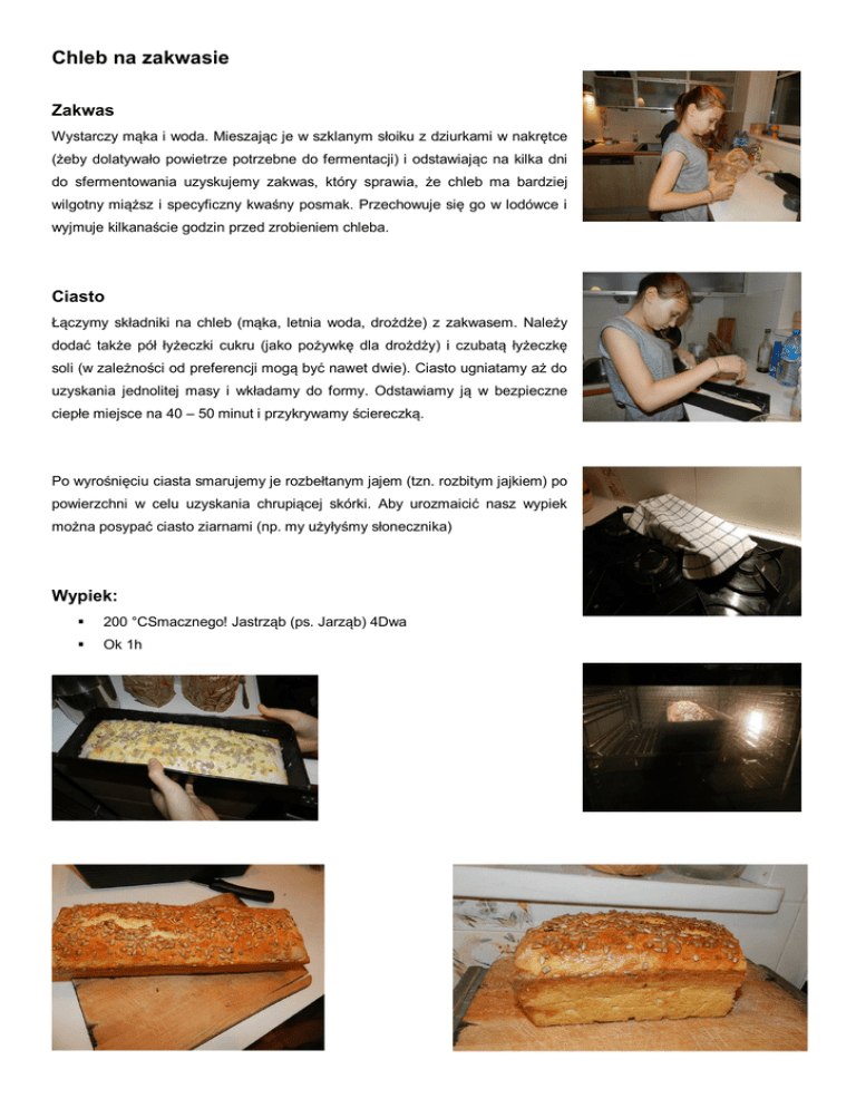 Chleb na zakwasie Zakwas Wystarczy mąka i woda. Mieszając je w szklanym słoiku z dziurkami w nakrętce (żeby dolatywało powietrze potrzebne do fermentacji) i odstawiając na kilka dni do sfermentowania uzyskujemy zakwas, który sprawia, że chleb ma bardziej wilgotny miąższ i specyficzny kwaśny posmak. Przechowuje się go w lodówce i wyjmuje kilkanaście godzin przed zrobieniem chleba. Ciasto Łączymy składniki na chleb (mąka, letnia woda, drożdże) z zakwasem. Należy dodać także pół łyżeczki cukru (jako pożywkę dla drożdży) i czubatą łyżeczkę soli (w zależności od preferencji mogą być nawet dwie). Ciasto ugniatamy aż do uzyskania jednolitej masy i wkładamy do formy. Odstawiamy ją w bezpieczne ciepłe miejsce na 40 – 50 minut i przykrywamy ściereczką. Po wyrośnięciu ciasta smarujemy je rozbełtanym jajem (tzn. rozbitym jajkiem) po powierzchni w celu uzyskania chrupiącej skórki. Aby urozmaicić nasz wypiek można posypać ciasto ziarnami (np. my użyłyśmy słonecznika) Wypiek: 200 °CSmacznego! Jastrząb (ps. Jarząb) 4Dwa Ok 1h