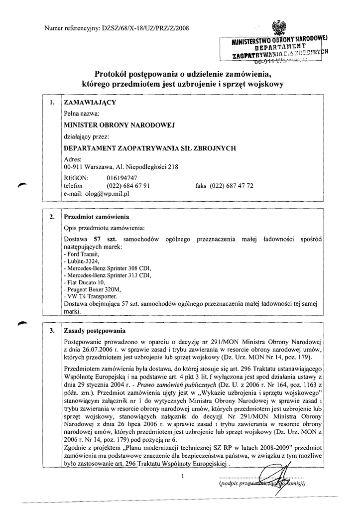 • Numer referencyjny: DZSZ/68IX-18/uZ/PRZ/Z/2008 rA1K'SlERSTWO OB DEPARTLHIH~NT ZAOPATRYWfUW\ Lt. ZW:-:!HHY It "" ., ... ",.. ',' ", ~, Protok61 postepowania 0 udzielenie zam6wienia, kt6rego przedmiotem jest uzbrojenie i sprzet wojskowy 1. ZAMAWIAJJ\CY Pelna nazwa: MINISTER OBRONY NARODOWEJ dzialajacy przez: DEPARTAMENT ZAOPATRYWANIA SIL ZBROJNYCH Adres: 00-911 Warszawa, AI. Niepodleglosci 218 REGON: 016194747 telefon (022) 684 67 91 e-mail: [email protected] 2. faks (022) 687 47 72 Przedmiot zamowienia Opis przedmiotu zamowienia: Dostawa 57 szt. samochodow ogolnego przeznaczenia malej ladownosci sposrod nastepujacych marek: - Ford Transit, - Lublin-3324, - Mercedes-Benz Sprinter 308 cm, - Mercedes-Benz Sprinter 313 cm, - Fiat Ducato 10, - Peugeot Boxer 320M, - VW T4 Transporter. Dostawa obejmujaca 57 szt. samochodow og61nego przeznaczenia malej ladownosci tej samej marki. 3. Zasady postepowania Postepowanie prowadzono w oparciu 0 decyzje nr 291IMON Ministra Obrony Narodowej z dnia 26.07.2006 r. w sprawie zasad i trybu zawierania w resorcie obrony narodowej um6w, ktorych przedmiotem jest uzbrojenie lub sprzet wojskowy (Dz. Urz. MON Nr 14, poz. 179). Przedmiotem zamowienia byla dostawa, do ktorej stosuje sie art. 296 Traktatu ustanawiajacego Wspolnote Europejska i na podstawie art. 4 pkt 3 lit. f wylaczona jest spod dzialania ustawy z dnia 29 stycznia 2004 r. - Prawo zamowien publicznych (Dz. U. z 2006 r. Nr 164, poz. 1163 z pozn, zm.). Przedmiot zamowienia ujety jest w .Wykazie uzbrojenia i sprzetu wojskowego" stanowiacym zalacznik nr 1 do wytycznych Ministra Obrony Narodowej w sprawie zasad i trybu zawierania w resorcie obrony narodowej umow, ktorych przedmiotemjest uzbrojenie lub sprzet wojskowy, stanowiacych zalacznik do decyzji Nr 2911MON Ministra Obrony Narodowej z dnia 26 lipca 2006 r. w sprawie zasad i trybu zawierania w resorcie obrony narodowej umow, ktorych przedmiotemjest uzbrojenie lub sprzet wojskowy (Dz. Urz. MON z 2006 r. Nr 14, poz. 179) pod pozycja nr 6. Zgodnie z projektem .Planu modernizacji technicznej SZ RP w latach 2008-2009" przedmiot zamowienia rna podstawowe znaczenie dla bezpieczenstwa panstwa, w zwiazku z tym mozliwe b lo zastosowanie art. 296 Traktatu Ws olna Euro e'skie' . (podpis przew.art.tid~rg0 Numer referencyjny: DZSZ/68/X-18ruZlPRZ/Z/2008 4. Tryb postepowania Przedmiot zamowienia posiada ustalone wymagania taktyczno-techniczne (zgodnie z § 20 Decyzji Nr 291IMON z dnia 26lipca 2006 r.). W zwiazku z brakiem rnozliwosci okreslenia przez Kornisje liczby wykonawc6w, kt6rzy rnoga ubiegac sie 0 udzielenie zarnowienia oraz uwzgledniajac fakt, ze wiekszosc pojazd6w bedacych przedmiotem zam6wienia (FORD TRANSIT, MERCEDES-BENZ SPRINTER 308 CDI, MERCEDES-BENZ SPRINTER 313 CDI, FIAT DUCATO, PEUGEOT BOXER) pochodzi z importu, w celu zapewnienia wiekszej konkurencji, takze wsrod wykonawc6w zagranicznych, przeprowadzono postepowanie w trybie przetargu. 5. Osoby i zakres wykonanych przez nie czynnosci Osoby biorace udzial w postepowaniu oraz zakres wykonywanych przez nie czynnosci okresla zalacznik or 3 do protokolu, Osoby wykonujqce czynnosci w postepowaniu 0 udzielenie zamowienia zlozyiy oswiadczenie okreslone w § 7 ust. 2 decyzji Nr 291lMON na druku stanowiqcym zalqcznik nr 1 do protokolu. ,-----,--~----------_._----------------------, 6. Ogloszenie 0 zamowieniu 1. Ogloszenie 0 postepowaniu zostalo zamieszczone: - na stronie intemetowej Europejskiej Agencji Obrony* od dnia 07.03.2008 r. - w Biuletynie Informacji Publicznej MON od dnia 07.03.2008r. - na stronie intemetowej Zarnawiajacego - www.dostawy.wp.mil.pl od dnia 07.03 .2008r. - w siedzibie Zamawiajacego na tablicy ogloszen od dnia 07.03 .2008r. 2. Za-proszenie do negocjacji w)'stano - pismo nr 'R)'oh.... 7, Vi dniu ... * Miejsce i termin skladania ofert Termin zlozenia ofert uplynal w dniu 15.04.2008 r. 0 godz. 9.00 Termin zlozenia ofert przedluzono" - pismo or wych. 2059/XIDZ z dnia 09.04.2008r. oraz or wych. 25321X1DZ z dnia 30.04.2008r. - przesunieto z dnia 15.04.2008r. na dzien 12.05.2008r. Oferty zlozono: or 118 w dniu 09.05.2008r. 8.00. 8, 0 godz. 10.45, or 119 w dniu 12.05.2008r. Termin otwarcia ofert 1. Otwarcie ofert odbylo sie w dniu 12.05.2008 r. 0 godz. 11.00 w: Departamencie Zaopatrywania Si1 Zbrojnych adres: AI. Niepodleglosci 218,00-911 Warszawa, pok. 020A. 2. Do uplywu terminu skladania ofert zlozono 2 oferty. 3. Zestawienie zlozonych ofert stanowi zalaczony druk - zalacznik or 4 do protokolu, W otwarciu ofert uczestniczyl: Glowny Specjalista ds. ekonomiczno - finansowych - mgr KrzysztofPALUCH Zbiorcze zestawienie otwartych olert przedstawiono w zaiqczniku nr 4 do prot 2 0 godz. Numer referencyjny: DZSZ/681X -18IUZ/PRZ/ZI2008 9. Informacja 0 spelnianiu warunk6w udzialu w postepowaniu Wymagane warunki udzialu w postepowaniu spelnia 2 Wykonawc6w. Injormacja 0 spelnianiu warunkow udzialu w postepowaniu zawarta jest na zalqczonym druku - zalqcznik nr 5 do protokolu. 10. Informacje i wyjasnienia udzielone Wykonawcom w trakcie postepowania - pismo nr - pismo nr - pismo nr - pismo nr 11. 2779/XIDZ z dnia 13.05.2008r. 2780/x/DZ z dnia 13.05.2008r. 2532/XIDZ z dnia 30.04.2008r. 19671X1DZ z dnia 04.04.2008r. Oferty nieprzyjete W postepowaniu nie przyjeto 0 ofert. Lisle o.ferl nieprzyjetych wr612 z uztlstldnieniem ion nie przyjecitl okreSkmo w ztlfetezniku nr ...... 12. Informacje 0 zakonczeniu postepowania Informacje 0 wyborze oferty najkorzystniejszej*: . W ramach prowadzonego postepowania zlozone zostaly 2 oferty nr: 118 przez firme AUTO HIT Sp. z 0.0., uI. Oswiecimska 323, 43-100 Tychy i nr 119 przez firme Dom Samochodowy GERMAZ Sp. z 0.0., ul. Strzegomska 139, 54-428 Wroclaw. W zwiazku z tym, ze wplynely dwie oferty, odpowiadajace tresci Warunk6w przetargu, na podstawie § 36. 1 Wytycznych Ministra Obrony Narodowej w sprawie zasad i trybu zawierania umow, ktorych przedmiotem jest uzbrojenie lub sprzet wojskowy, stanowiacych zalacznik do decyzji nr 291IMON Ministra Obrony Narodowej z dnia 26 lipca 