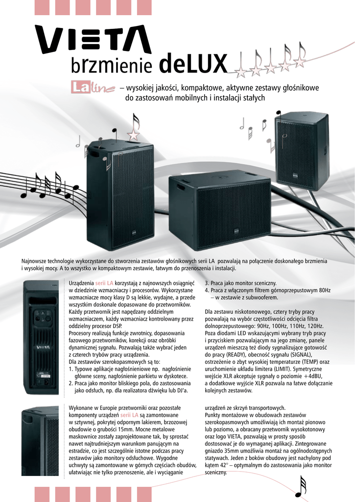 brzmienie deLUX – wysokiej jakości, kompaktowe, aktywne zestawy głośnikowe do zastosowań mobilnych i instalacji stałych Najnowsze technologie wykorzystane do stworzenia zestawów głośnikowych serii LA pozwalają na połączenie doskonałego brzmienia i wysokiej mocy. A to wszystko w kompaktowym zestawie, łatwym do przenoszenia i instalacji. Urządzenia serii LA korzystają z najnowszych osiągnięć w dziedzinie wzmacniaczy i procesorów. Wykorzystane wzmacniacze mocy klasy D są lekkie, wydajne, a przede wszystkim doskonale dopasowane do przetworników. Każdy przetwornik jest napędzany oddzielnym wzmacniaczem, każdy wzmacniacz kontrolowany przez oddzielny procesor DSP. Procesory realizują funkcje zwrotnicy, dopasowania fazowego przetworników, korekcji oraz obróbki dynamicznej sygnału. Pozwalają także wybrać jeden z czterech trybów pracy urządzenia. Dla zestawów szerokopasmowych są to: 1. Typowe aplikacje nagłośnieniowe np. nagłośnienie główne sceny, nagłośnienie parkietu w dyskotece. 2. Praca jako monitor bliskiego pola, do zastosowania jako odsłuch, np. dla realizatora dźwięku lub DJ’a. 3. Praca jako monitor sceniczny. 4. Praca z włączonym filtrem górnoprzepustowym 80Hz – w zestawie z subwooferem. Wykonane w Europie przetworniki oraz pozostałe komponenty urządzeń serii LA są zamontowane w sztywnej, pokrytej odpornym lakierem, brzozowej obudowie o grubości 15mm. Mocne metalowe maskownice zostały zaprojektowane tak, by sprostać nawet najtrudniejszym warunkom panującym na estradzie, co jest szczególnie istotne podczas pracy zestawów jako monitory odsłuchowe. Wygodne uchwyty są zamontowane w górnych częściach obudów, ułatwiając nie tylko przenoszenie, ale i wyciąganie urządzeń ze skrzyń transportowych. Punkty montażowe w obudowach zestawów szerokopasmowych umożliwiają ich montaż pionowo lub poziomo, a obracany przetwornik wysokotonowy oraz logo VIETA, pozwalają w prosty sposób dostosować je do wymaganej aplikacji. Zintegrowane gniazdo 35mm umożliwia montaż na ogólnodostępnych statywach. Jeden z boków obudowy jest nachylony pod kątem 42° – optymalnym do zastosowania jako monitor sceniczny. Dla zestawu niskotonowego, cztery tryby pracy pozwalają na wybór częstotliwości odcięcia filtra dolnoprzepustowego: 90Hz, 100Hz, 110Hz, 120Hz. Poza diodami LED wskazującymi wybrany tryb pracy i przyciskiem pozwalającym na jego zmianę, panele urządzeń mieszczą też diody sygnalizujące gotowość do pracy (READY), obecność sygnału (SIGNAL), ostrzeżenie o zbyt wysokiej temperaturze (TEMP) oraz uruchomienie układu limitera (LIMIT). Symetryczne wejście XLR akceptuje sygnały o poziomie +4dBU, a dodatkowe wyjście XLR pozwala na łatwe dołączanie kolejnych zestawów. LA-8 LA-12/60 i LA-12/80 LA-112S Ciągły: 120dB Maksymalny: 126dB Ciągły: 125dB Maksymalny: 131dB Ciągły: 125dB Maksymalny: 131dB Pasmo przenoszenia (±3dB) 89Hz – 18kHz 89Hz – 18kHz 39Hz – 160Hz Użyteczny zakres częstotliwości (-10dB) 55Hz – 20kHz 55Hz – 20kHz - 90° / 60° LA-12/60: 60° / 50° LA-12/80: 80° / 50° - Parametry akustyczne Poziom dźwięku SPL Kąty zasięgu w poziomie / pionie (-6dB) Parametry wejścia Czułość 1 Vrms / 2,22 dBU Złącza Symetryczne XLR Maksymalny poziom sygnału wejściowego 4,5 Vrms Parametry procesora DSP Próbkowanie Rozdzielczość: 24 bit; częstotliwość próbkowania 48kHz Zakres dynamiki 100dB Ilość trybów pracy (pamięci) 4 Parametry wzmacniacza mocy LF: 350W (4Ω) HF: 180W (8Ω) Moc wzmacniaczy LF: 350W (4Ω) HF: 180W (8Ω) Wzmocnienie LF: 500W 32dB (40 razy) Parametry przetworników Ilość i rozmiar LF: 1 x 8” HF: 1 x 1” HF: 1 x 1” HF: 1 x 1,4” LF: 1 x 12” Materiał membrany Poliester Tytan Tytan 12kg 18kg 25kg 418 x 267 x 270 mm 610 x 633,5 x 370 mm 380 x 530 x 390 mm Parametry obudowy Ciężar Wymiary (wysokość x szerokość x głębokość) Zasilanie Napięcie sieci 100 – 250 V Częstotliwość sieci 40 – 80 Hz Zastosowanie: – kluby muzyczne, dyskoteki, teatry, przenośne i stacjonarne systemy audiowizualne, – nagłośnienie główne, efektowe, side-fill, monitoring sceny. Inne serie produktów marki Vieta Wysokiej jakości głośniki instalacyjne Zestawy głośnikowe szerokopasmowe i niskotonowe do zastosowań instalacyjnych i estradowych. Wysokiej jakości głośniki instalacyjne sufitowe i do montażu w ścianie. Zestawy głośnikowe szerokopasmowe i niskotonowe dużej mocy do zastosowań estradowych. Profesjonalny system z bezprzewodowymi głośnikami do transmisji mowy i muzyki. Niewielkich rozmiarów wzmacniacze i odtwarzacze sterowane zdalnie, przeznaczone do montażu na szynie DIN. Dystrybutor: Linearic, ul. Chrzanowskiego 62, 51-141 Wrocław tel. 71/ 78 73 900, faks: 71/ 78 73 899, www.akustyk.pl
