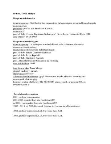 dr hab. Tersa Muryn Rozprawa doktorska temat rozprawy: Distribution des expressions métonymiques personnelles en français contemporain promotor: prof dr hab Stanisław Karolak recenzenci: prof. dr hab. Urszula Dąmbska-Prokop prof. Pierre Lerat, Université Paris XIII data obrony: 19.06.1987 Rozprawa habilitacyjna temat rozprawy: Le syntagme nominal abstrait et la cohérence discursive recenzenci wydawniczy: recenzenci do kolokwium habilitacyjnego : prof. dr hab. Teresa Giermak-Zielińska prof. dr hab. Jerzy Sypnicki prof. dr hab. Stanisław Karolak prof. Alain Berendoner Université de Fribourg data kolokwium: 1999 imię i nazwisko: Tersa Muryn stopień naukowy: dr hab. stanowisko: profesor zainteresowania naukowe: językoznawstwo, aspekt, składnia semantyczna, rzeczownik abstrakcyjny kontakt: telefon służbowy: 012 662 62 00, adres e-mail , nr pokoju 254, ul. Podchorążych 2 Doświadczenie zawodowe 2001- profesor nadzwyczajny 2001-2003, dyrektor Instytutu Neofilologii UP od 2003, vice-dyrektor Instytutu Neofilologii UP 2003 – 2010, od 2012, kierownik Katedry Językoznawstwa Romańskiego 2011, profesor zaproszony, LDI, Université Paris XIII, 2013, profesor zaproszony, LDI, Université Paris XIII, Uczestnictwo w projektach międzynarodowych: Nazwy abstrakcyjne w jezykach romańskich i słowiańskich, Uniwersytet Florencki- UP; 1994-6, wykonawca, Wyrażanie związków czasowych w jezyku polskim i francuskim – leksyka oraz kategoria czasu i aspektu, Laboratoire Nancy2/ATILF-CNRS – UP, 2006-2009, wykonawca; Typologie sémantique des expressions de cause en français et en polonais, POLONIUM/EGIDE, LDI, Université Paris XIII – UP, 2006-2007, koordynator ze strony polskiej ; Traitement automatique des langues naturelles :la détermination complexe en polonais et en français, POLONIUM/EGIDE, LDI, Université Paris XIII – UP, 2010 -2011, koordynator ze strony polskiej . Tłumaczenie francusko-polskie i polsko-francuskie predeterminantów kataforycznych skorelowanych z modyfikatorem koniecznym.(French-polish and polish-french translation of cataphoric predeminants correlated with the necessary modifiers). POLONIUM/ EGIDE, LDI, Université Paris XIII – UP, 2013 -2014, koordynator ze strony polskiej . Phraséologie et discours , COOPERA, Université Grenoble 3 / Stendhal –UP, 2013-2014, koordynator ze strony polskiej. POLONIUM/EGIDE, LDI, Université Paris XIII – Uniwersytet Warszawski, 2015, wykonawca. Monografie: 1991,Métonymie. Utilisation personnelle des noms impersonnels en français, Wydawnictwo Naukowe WSP, Kraków. 1999, Le syntagme nominal abstrait et la cohérence discursive. La composition du SN comme signe d’équivalence entre les structures sémantique et formelle, WN WSP Artykuły (pohabilitacyjne) 1. 2000, L’impersonnel, le SN et la modalité [w:] P. Seriot et A. Berrendonner (éd), Le paradoxe du sujet: les constructions impersonnelles dans les langues slaves et romanes, Les cahiers de l’ILSL, No 12, Lausanne, , ISSN 1019-94446, ss. 207-21. 2. 2003, Encore une fois sur les propositions circonstancielles de but, Etudes Cognitives 5 / Studia Kognitywne 5, 135-141, SOW, Warszawa, ISBN 83-89191-08-3, ISSN 1641-9758 3. 2003, Etre en/à - état ou action? in W. Banyś, L. Bednarczuk, K. Polański (éd.), Etudes linguistiques romano-slaves offertes à Stanisław Karolak, 339-345, Oficyna Wydawnicza "Edukacja", Kraków, ISBN 83-917539-0-5 4. 2004, Une phrase habituelle et/ou dispositive?, Etudes Cognitives /Studia Kognitywne, 6, Warszawa: SOW, 81-91, ISBN 83-89191-08-3, ISSN 1641-9758 5. 2005, Continuité, intensité et fréquence, Synergies Pologne, 1, 78-84, ISSN 1734-4387. 6. 2006, L’expression de l’aspect limitatif dans le SN, Synergies Pologne, 2 , 100-114, ISSN: 1734-4387. 7. 2007, Le parfait existentiel ou le Je qui s’exprime, Synergies Pologne, 3, 189-196, ISSN 1734-4387 8. 2009, Projekt mam już napisany - un PC à l’état naissant? Du discours technique en version quotidienne, in U. Paprocka-Piotrowska, J. Zając (éd.), "L’enseignement / apprentissage du français langue étrangère", Lublin : Towarzystwo Naukowe KUL, 203-215. 9. 2009, Le passé composé en fonction de parfait non-testimonial. Une analyse contrastive français-polonais, in. J. Kortas, J.Jereczek-Lipińska, G.Quentel (éd.), La Globalisation Communicationnelle : Enrichissement et Menace pour les langues, Gdańsk : Fundacja Rozwoju Uniwersytetu Gdańskiego, ss. 289-295, ISBN 978-83-7531-137-2. 10. 2009, Comment calculer la valeur aspectuelle d’un SN ?, Synergies Pologne, 6, 113-127, ISSN 1734-4387 11. 2010, La préposition comme exposant de l'aspect dans les constructions prép+N à valeur causale. Une analyse contrastive français-polonais, in I. Novakova et E. Dontchenko (éd.) Grammaire et lexique : regards croisés, Astrakhan-Grenoble : Maison d’édition de l’Université d’Astrakhan, ELLUG, Université Stendhal, Grenoble, 93-115. http://www.fabula.org/ actualites/iva-novakova-et-elena-dontchenko-grammaire-et-lexique-regardscroises_45946.php 12. 2010, (Muryn, T., Hajok, A.), Les quantifieurs nominaux, Le 3ème Colloque International des doctorants et jeunes chercheurs en linguistique (12 & 13 mars 2009), Sousse, 13. 2010, Les constructions du type maintenant, aujourd’hui, à présent + Imparfait comme expression du changement d’état dans un texte au passé in J. Górnikiewicz, H. Grzmil-Tylutki, I. Piechnik (éd.), En quête de sens. Etudes dédiées à Marcela Świątkowska, , Kraków, Wyd. UJ, 347-354. ISBN 978-83-233-2989-3 14. 2011, La détermination en polonais ; un déterminant zéro ?, Neophilologica, 22 , 96-107. 15. 2011, Le nom, le Syntagme Nominal, la construction Vsup+N et leur valeur aspectuelle. Une analyse contrastive français-polonais, Romanica Cracoviensia, UJ, 292 -299 16. 2013, Le rôle de la détermination du nom dans le calcul aspectuel sur l’exemple de quelques verbes polonais préfixés par na- . Une analyse contrastive polonais –