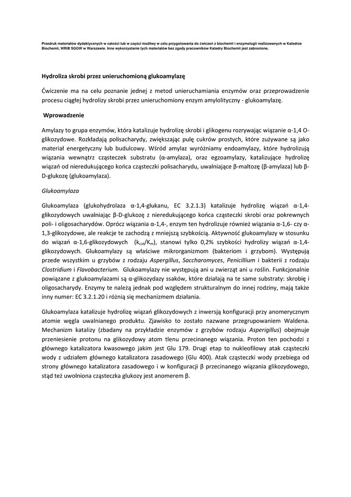 Przedruk materiałów dydaktycznych w całości lub w części możliwy w celu przygotowania do ćwiczeń z biochemii i enzymologii realizowanych w Katedrze Biochemii, WRiB SGGW w Warszawie. Inne wykorzystanie tych materiałów bez zgody pracowników Katedry Biochemii jest zabronione. Hydroliza skrobi przez unieruchomioną glukoamylazę Ćwiczenie ma na celu poznanie jednej z metod unieruchamiania enzymów oraz przeprowadzenie procesu ciągłej hydrolizy skrobi przez unieruchomiony enzym amylolityczny - glukoamylazę. Wprowadzenie Amylazy to grupa enzymów, która katalizuje hydrolizę skrobi i glikogenu rozrywając wiązanie α-1,4 Oglikozydowe. Rozkładają polisacharydy, zwiększając pulę cukrów prostych, które zużywane są jako materiał energetyczny lub budulcowy. Wśród amylaz wyróżniamy endoamylazy, które hydrolizują wiązania wewnątrz cząsteczek substratu (α-amylaza), oraz egzoamylazy, katalizujące hydrolizę wiązań od nieredukującego końca cząsteczki polisacharydu, uwalniające β-maltozę (β-amylaza) lub βD-glukozę (glukoamylaza). Glukoamylaza Glukoamylaza (glukohydrolaza α-1,4-glukanu, EC 3.2.1.3) katalizuje hydrolizę wiązań α-1,4glikozydowych uwalniając β-D-glukozę z nieredukującego końca cząsteczki skrobi oraz pokrewnych poli- i oligosacharydów. Oprócz wiązania α-1,4-, enzym ten hydrolizuje również wiązania α-1,6- czy α1,3-glikozydowe, ale reakcje te zachodzą z mniejszą szybkością. Aktywność glukoamylazy w stosunku do wiązań α-1,6-glikozydowych (kcat/Km), stanowi tylko 0,2% szybkości hydrolizy wiązań α-1,4glikozydowych. Glukoamylazy są właściwe mikrorganizmom (bakteriom i grzybom). Występują przede wszystkim u grzybów z rodzaju Aspergillus, Saccharomyces, Penicillium i bakterii z rodzaju Clostridium i Flavobacterium. Glukoamylazy nie występują ani u zwierząt ani u roślin. Funkcjonalnie powiązane z glukoamylazami są α-glikozydazy ssaków, które działają na te same substraty: skrobię i oligosacharydy. Enzymy te należą jednak pod względem strukturalnym do innej rodziny, mają także inny numer: EC 3.2.1.20 i różnią się mechanizmem działania. Glukoamylaza katalizuje hydrolizę wiązań glikozydowych z inwersją konfiguracji przy anomerycznym atomie węgla uwalnianego produktu. Zjawisko to zostało nazwane przegrupowaniem Waldena. Mechanizm katalizy (zbadany na przykładzie enzymów z grzybów rodzaju Asperigillus) obejmuje przeniesienie protonu na glikozydowy atom tlenu przecinanego wiązania. Proton ten pochodzi z głównego katalizatora kwasowego jakim jest Glu 179. Drugi etap to nukleofilowy atak cząsteczki wody z udziałem głównego katalizatora zasadowego (Glu 400). Atak cząsteczki wody przebiega od strony głównego katalizatora zasadowego i w konfiguracji β przecinanego wiązania glikozydowego, stąd też uwolniona cząsteczka glukozy jest anomerem β. Rys. 1 Mechanizm katalizy hydrolizy skrobi z udziałem glukoamylazy (A – Glu179, B – Glu400) Glukoamylazy z grzybów, jak większość wydzielanych białek eukariotycznych, są glikozylowane (zarówno O- jak i N-glikozylacje). Większość szczepów A. niger wydziela dwie główne formy glukoamylazy różniące się masą cząsteczkową (forma G1 – 99 kDa, G2 – 112 kDa) przy czym obie posiadają podobną budowę części białkowej, a różnią się udziałem części cukrowej (we frakcji cięższej udział reszt cukrowych jest dwa razy większy). Formy te są kodowane przez jeden gen i forma G2 powstaje w wyniku wycięcia intronu z pierwotnego transkryptu. Glikozylacja obu form jest skutkiem modyfikacji potranslacyjnych powstałych białek. Uważa się, że wysoka zawartość reszt cukrowych w enzymie pozwala na utrzymanie biologicznie aktywnej konformacji enzymu oraz wpływa na jego stabilność w podwyższonej temperaturze, czy w szerokim zakresie pH. Część białkowa składa się z dwóch domen, domeny katalitycznej i domeny wiążącej skrobię. Domena katalityczna składa się z 13 α-helis, z czego 12 tworzy kształt podobny do beczki [(α/α)6-barrel]. Wewnątrz niej znajduje się centrum aktywne, utworzone przez 6 wysoce konserwatywnych odcinków α→α. Tu znajdują się kluczowe dla reakcji hydrolizy aminokwasy kontaktowe (A. awamori – Glu 179 i Glu 400). Do C-terminalnej części domeny katalitycznej przyłączona jest, poprzez giętki łącznik, domena wiążąca skrobię. Po przeciwległych jej stronach znajdują się dwa regiony odpowiedzialne za przyłączanie substratu. Domena ta wiąże skrobię rozrywając jej zbitą strukturę, co wydatnie ułatwia jej hydrolizę przez domenę katalityczną. Zastosowanie glukoamylazy w przemyśle Ze względu na stosunkowo prosty sposób otrzymywania preparatów enzymatycznych glukoamylazy i ich stabilność, uzyskuje się je na skalę przemysłową głównie z grzybów z rodzaju Aspergillus. Te glukoamylazy są odporne na zmiany pH, (zachowując aktywność w zakresie pH od 1,8 do 10,5) i wysoką temperaturę, ich optymalna temperatura to 40 – 65°C. Glukoamylaza jest wykorzystywana do produkcji cukrów rozpuszczalnych ze skrobi po uprzedniej jej hydrolizie. Znanych jest kilka metod hydrolizy skrobi. Na skalę techniczną stosuje się kwaśną hydrolizę lub metody enzymatyczne. Wydajność procesu kwaśnej hydrolizy skrobi nie przekracza 80% z powodu rewersji lub też rozkładu glukozy. Dlatego metoda ta jest coraz rzadziej wykorzystywana, a zastępuje się ją tańszą i wydajniejszą (o 5 – 12%) metodą hydrolizy enzymatycznej. Otrzymuje się w ten sposób hydrolizaty o wyższej jakości, bez konieczności stosowania materiałów odpornych na działanie silnych kwasów i wysokiej temperatury. Opracowano kilka metod enzymatycznej hydrolizy skrobi na skalę przemysłową, z czego najczęściej stosowane są dwie: metoda kwas-enzym i metoda enzym-enzym. Najpierw skrobia jest częściowo hydrolizowana (upłynniana) za pomocą kwasu solnego (kwas-enzym) lub enzymatycznie (m