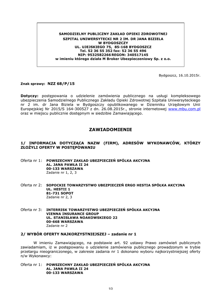 SAMODZIELNY PUBLICZNY ZAKŁAD OPIEKI ZDROWOTNEJ SZPITAL UNIWERSYTECKI NR 2 IM. DR JANA BIZIELA W BYDGOSZCZY UL. UJEJSKIEGO 75, 85-168 BYDGOSZCZ Tel. 52 36 55 352 fax: 52 36 55 496 NIP: 9532582266 REGON: 340517145 w imieniu którego działa M Broker Ubezpieczeniowy Sp. z o.o. Bydgoszcz, 16.10.2015r. Znak sprawy: NZZ 68/P/15 Dotyczy: postępowania o udzielenie zamówienia publicznego na usługi kompleksowego ubezpieczenia Samodzielnego Publicznego Zakładu Opieki Zdrowotnej Szpitala Uniwersyteckiego nr 2 im. dr Jana Biziela w Bydgoszczy opublikowanego w Dzienniku Urzędowym Unii Europejskiej Nr 2015/S 164-300527 z dn. 26.08.2015r., stronie internetowej www.mbu.com.pl oraz w miejscu publicznie dostępnym w siedzibie Zamawiającego. ZAWIADOMIENIE 1/ INFORMACJA DOTYCZĄCA NAZW (FIRM), ADRESÓW WYKONAWCÓW, KTÓRZY ZŁOŻYLI OFERTY W POSTĘPOWANIU Oferta nr 1: POWSZECHNY ZAKŁAD UBEZPIECZEŃ SPÓLKA AKCYJNA AL. JANA PAWŁA II 24 00-133 WARSZAWA Zadanie nr 1, 2, 3 Oferta nr 2: SOPOCKIE TOWARZYSTWO UBEZPIECZEŃ ERGO HESTIA SPÓŁKA AKCYJNA UL. HESTII 1 81-731 SOPOT Zadanie nr 2, 3 Oferta nr 3: INTERRISK TOWARZYSTWO UBEZPIECZEŃ SPÓŁKA AKCYJNA VIENNA INSURANCE GROUP UL. STANISŁAWA NOAKOWSKIEGO 22 00-668 WARSZAWA Zadanie nr 2 2/ WYBÓR OFERTY NAJKORZYSTNIEJSZEJ – zadanie nr 1 W imieniu Zamawiającego, na podstawie art. 92 ustawy Prawo zamówień publicznych zawiadamiam, iż w postępowaniu o udzielenie zamówienia publicznego prowadzonym w trybie przetargu nieograniczonego, w zakresie zadania nr 1 dokonano wyboru najkorzystniejszej oferty n/w Wykonawcy: Oferta nr 1: POWSZECHNY ZAKŁAD UBEZPIECZEŃ SPÓLKA AKCYJNA AL. JANA PAWŁA II 24 00-133 WARSZAWA 1/3 Uzasadnienie wyboru oferty: wybrano ofertę z najkorzystniejszym bilansem ceny oraz innych kryteriów odnoszących się do przedmiotu zamówienia, określonych w SIWZ (podstawa prawna: art. 91 ust. 1 ustawy Prawo zamówień publicznych). Streszczenie oceny i porównania złożonych ofert podlegających ocenie (punktacja przyznana ofertom w każdym kryterium oceny ofert, łączna punktacja) – zadanie 1 Oferta nr 1: Kryterium cena (C) = 90,00 pkt. Kryterium zakres ochrony ubezpieczeniowej (Z) = 0,00 pkt. Łączna punktacja (suma punktów) (O) = 90,00 pkt. W postępowaniu nie wykluczono żadnego Wykonawcy i nie odrzucono żadnej oferty. Zgodnie z dyspozycją art. 94 ust. 1 pkt. 1) ustawy Prawo zamówień publicznych informuję, że umowa dla zadania 1 może być zawarta w terminie nie krótszym niż 10 dni o dnia przesłania niniejszego zawiadomienia. Uwzględniając zapisy art. 94 ust. 2 pkt. 1a) ustawy PZP Zamawiający może zawrzeć umowę przed upływem w/w terminu, (przed upływem 10 dni od dnia przesłania zawiadomienia o wyborze w sposób określony w art. 27 ust. 2 ustawy PZP), w zw. z faktem, iż w postępowaniu prowadzonym w trybie przetargu nieograniczonego złożono tylko jedną ofertę. Wykonawca zostanie poinformowany o terminie i miejscu zawarcia umowy. 3/ WYBÓR OFERTY NAJKORZYSTNIEJSZEJ – zadanie nr 2 W imieniu Zamawiającego, na podstawie art. 92 ustawy Prawo zamówień publicznych zawiadamiam, iż w postępowaniu o udzielenie zamówienia publicznego prowadzonym w trybie przetargu nieograniczonego, w zakresie zadania nr 2 dokonano wyboru najkorzystniejszej oferty n/w Wykonawcy: Oferta nr 1: POWSZECHNY ZAKŁAD UBEZPIECZEŃ SPÓLKA AKCYJNA AL. JANA PAWŁA II 24 00-133 WARSZAWA Uzasadnienie wyboru oferty: wybrano ofertę z najkorzystniejszym bilansem ceny oraz innych kryteriów odnoszących się do przedmiotu zamówienia, określonych w SIWZ (podstawa prawna: art. 91 ust. 1 ustawy Prawo zamówień publicznych). Streszczenie oceny i porównania złożonych ofert podlegających ocenie (punktacja przyznana ofertom w każdym kryterium oceny ofert, łączna punktacja) – zadanie 2 Oferta nr 1: Kryterium cena (C) = 90,00 pkt. Kryterium zakres ochrony ubezpieczeniowej (Z) = 10,00 pkt. Łączna punktacja (suma punktów) (O) = 100,00 pkt. Oferta nr 2: Kryterium cena (C) = 56,42 pkt. Kryterium zakres ochrony ubezpieczeniowej (Z) = 5,00 pkt. Łączna punktacja (suma punktów) (O) = 61,42 pkt. Oferta nr 3: Kryterium cena (C) = 77,84 pkt. Kryterium zakres ochrony ubezpieczeniowej (Z) = 0,00 pkt. Łączna punktacja (suma punktów) (O) = 77,84 pkt. W postępowaniu nie wykluczono żadnego Wykonawcy i nie odrzucono żadnej oferty. Zgodnie z dyspozycją art. 94 ust. 1 pkt. 1) ustawy Prawo zamówień publicznych informuję, że umowa dla zadania 2 może być zawarta w terminie nie krótszym niż 10 dni o dnia przesłania niniejszego zawiadomienia. Wykonawca zostanie poinformowany o terminie i miejscu zawarcia umowy. 2/3 4/ WYBÓR OFERTY NAJKORZYSTNIEJSZEJ – zadanie nr 3 W imieniu Zamawiającego, na podstawie art. 92 ustawy Prawo zamówień publicznych zawiadamiam, iż w postępowaniu o udzielenie zamówienia publicznego prowadzonym w trybie przetargu nieograniczonego, dokonano wyboru najkorzystniejszej oferty n/w Wykonawcy: Oferta nr 2: SOPOCKIE TOWARZYSTWO UBEZPIECZEŃ ERGO HESTIA SPÓŁKA AKCYJNA UL. HESTII 1 81-731 SOPOT Uzasadnienie wyboru oferty: wybrano ofertę z najkorzystniejszym bilansem ceny oraz innych kryteriów odnoszących się do przedmiotu zamówienia, określonych w SIWZ (podstawa prawna: art. 91 ust. 1 ustawy Prawo zamówień publicznych). Streszczenie oceny i porównania złożonych ofert podlegających ocenie (punktacja przyznana ofertom w każdym kryterium oceny ofert, łączna punktacja) – zadanie 3 Oferta nr 2: Kryterium cena (C) = 90,00 pkt. Kryterium zakres ochrony ubezpieczeniowej (Z) = 10,00 pkt. Łączna punktacja (suma punktów) (O) = 100,00 pkt. Oferta nr 3: Kryterium cena (C) = 76,81 pkt. Kryterium zakres ochrony ubezpieczeniowej (Z) = 10,00 pkt. Łączna punktacja (suma punktów) (O) = 86,81 pkt. W postępowaniu nie wykluczono żadnego Wykonawcy i nie odrzucono żadnej oferty. Zgodnie z dyspozycją art. 94 ust. 1 pkt. 1) ustawy Prawo zamówień publicznych informuję, że umowa dla zadania 3 może być zawart
