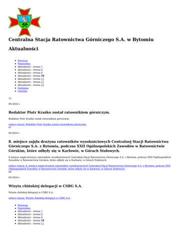 Centralna Stacja Ratownictwa Górniczego S.A. w Bytomiu Aktualności Pierwsza Poprzednia Aktualności - strona 7 Aktualności - strona 8 Aktualności - strona 9 Aktualności - strona 10 Aktualności - strona 11 Aktualności - strona 12 Aktualności - strona 13 Następna Ostatnia 15 09.2016 r. Redaktor Piotr Kraśko został ratownikiem górniczym. Redaktor Piotr Kraśko został ratownikiem górniczym. zobacz więcej: Redaktor Piotr Kraśko został ratownikiem górniczym. 07 09.2016 r. 8. miejsce zajęła drużyna ratowników wysokościowych Centralnej Stacji Ratownictwa Górniczego S.A. z Bytomia, podczas XXII Ogólnopolskich Zawodów w Ratownictwie Górskim, które odbyły się w Karłowie, w Górach Stołowych. 8 miejsce zajęła drużyna ratowników wysokościowych Centralnej Stacji Ratownictwa Górniczego S.A. z Bytomia, podczas XXII Ogólnopolskich Zawodów w Ratownictwie Górskim, które odbyły się w Karłowie, w Górach Stołowych. zobacz więcej: 8. miejsce zajęła drużyna ratowników wysokościowych Centralnej Stacji Ratownictwa Górniczego S.A. z Bytomia, podczas XXII Ogólnopolskich Zawodów w Ratownictwie Górskim, które odbyły się w Karłowie, w Górach Stołowych. 06 09.2016 r. Wizyta chińskiej delegacji w CSRG S.A. Wizyta chińskiej delegacji w CSRG S.A. zobacz więcej: Wizyta chińskiej delegacji w CSRG S.A. Pierwsza Poprzednia Aktualności - strona 7 Aktualności - strona 8 Aktualności - strona 9 Aktualności - strona 10 Aktualności - strona 11 Aktualności - strona 12 Aktualności - strona 13 Następna Ostatnia