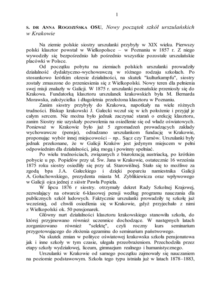 1 S. DR ANNA ROGOZIŃSKA OSU, Nowy początek szkół urszulańskich w Krakowie Na ziemie polskie siostry urszulanki przybyły w XIX wieku. Pierwszy polski klasztor powstał w Wielkopolsce – w Poznaniu w 1857 r. Z niego wywodziły się bezpośrednio lub pośrednio wszystkie pozostałe urszulańskie placówki w Polsce. Od początku pobytu na ziemiach polskich urszulanki prowadziły działalność dydaktyczno-wychowawczą w różnego rodzaju szkołach. Po stosunkowo krótkim okresie działalności, na skutek "kulturkampfu", siostry zostały zmuszone do przeniesienia się z Wielkopolski. Nowy teren dla pełnienia swej misji znalazły w Galicji. W 1875 r. urszulanki poznańskie przeniosły się do Krakowa. Fundatorką klasztoru urszulanek krakowskich była M. Bernarda Morawska, założycielka i długoletnia przełożona klasztoru w Poznaniu. Zanim siostry przybyły do Krakowa, napotkały na wiele różnych trudności. Biskup krakowski J. Gałecki wczuł się w ich położenie i przyjął je całym sercem. Nie można było jednak zaczynać starań o erekcję klasztoru, zanim Siostry nie uzyskały pozwolenia na osiedlenie się od władz oświatowych. Ponieważ w Krakowie było już 5 zgromadzeń prowadzących zakłady wychowawcze (pensje), odradzano urszulankom fundację w Krakowie, proponując wybór innej miejscowości – np.. Sącz czy Tarnów. Urszulanki były jednak przekonane, że w Galicji Kraków jest jedynym miejscem w pełni odpowiednim dla działalności, jaką mogą i powinny spełniać. Po wielu trudnościach, związanych z biurokracją austriacką, po krótkim pobycie u pp. Popielów przy ul. Św. Jana w Krakowie, ostatecznie 16 września 1875 roku siostry osiedliły się przy ul. Starowiślnej. Stało się to możliwe za zgodą bpa J.A. Gałeckiego i dzięki poparciu namiestnika Galicji A. Gołuchowskiego, prezydenta miasta M. Zyblikiewicza oraz wpływowego w Galicji ojca jednej z sióstr Pawła Popiela. W lipcu 1876 r siostry. otrzymały dekret Rady Szkolnej Krajowej, zezwalający na otwarcie 6-klasowej pensji według programu nauczania dla publicznych szkół ludowych. Faktycznie urszulanki prowadziły tę szkołę już wcześniej, od chwili osiedlenia się w Krakowie, gdyż przyjechało z nimi z Wielkopolski ok. 50 pensjonarek. Główny nurt działalności klasztoru krakowskiego stanowiła szkoła, do której przyjmowano również uczennice dochodzące. W następnych latach zorganizowano również "selektę", czyli roczny kurs seminarium przygotowującego do złożenia egzaminu do seminarium państwowego. Na skutek zmian w polityce oświatowej krakowska szkoła pensjonatowa jak i inne szkoły w tym czasie, ulegała przeobrażeniom. Przechodziła przez etapy szkoły wydziałowej, liceum, gimnazjum realnego i humanistycznego. Urszulanki w Krakowie od samego początku zajmowały się nauczaniem na poziomie podstawowym. Szkoła tego typu istniała już w latach 1878–1883, 2 a potem została ponownie otwarta w 1908 r. Równocześnie od początku swej działalności w Krakowie Siostry zajęły się kształceniem i wychowaniem dziewcząt na poziomie średnim. Już w 1875 roku utworzyły szkołę pensjonatową, która w 1898 roku została przekształcona w szkołę wydziałową. Kolejnym etapem przekształceń szkoły średniej było utworzenie w 1909 roku liceum. Chociaż nauka w liceum kończyła się egzaminem dojrzałości, to jednak nie dawał on absolwentkom uprawnień do podejmowania studiów wyższych, a jedynie dawał możliwość uczęszczania na nie w charakterze wolnych słuchaczek. Licea te stanowiły typ pośredni między szkołą wydziałową a właściwą szkolą średnią ogólnokształcącą. Popularność gimnazjów żeńskich wzrosła zwłaszcza po 1909 r., dzięki stworzeniu przez Ministerstwo Wychowania i Oświaty nowego typu szkoły – gimnazjum realnego, które otwierało wstęp na wyższe uczelnie. Urszulanki dla umożliwienia swym wychowankom dostępu do wyższych uczelni zaczęły prowadzić w 1910 r. obok liceum – Realne Gimnazjum Żeńskie, dla którego otrzymały prawa publiczne. Po odzyskaniu niepodległości, sprawą ważną stała się reforma szkoły średniej ogólnokształcącej. Zaczęły zanikać licea, a szkolnictwo średnie ogólnokształcące podzielono na dwa główne typy: gimnazjum matematycznofizyczne i humanistyczne. Tak więc w latach dwudziestych zlikwidowano liceum (1923 r.), a gimnazjum realne zostało przekształcone w 8–letnie gimnazjum humanistyczne już w 1921 roku. Rozpoczęty z dniem 1 lipca 1932 r. proces reorganizacji szkoły średniej ogólnokształcącej doprowadził do ponownych przemian w szkolnictwie. Po tzw. reformie jędrzejewiczowskiej w 1932 roku, rozpoczęło działalność urszulańskie 4-letnie gimnazjum ogólnokształcące, przekształcone z 8-letniego gimnazjum humanistycznego. W następnym okresie urszulanki uzyskały pozwolenie na otwarcie liceum ogólnokształcącego z wydziałem humanistycznym i przyrodniczym. Szkoły, zwłaszcza szkoły średnie typu ogólnokształcącego, stanowiły główny nurt pracy sióstr urszulanek w okresie międzywojennym. W Polsce w tym okresie działało 12 placówek urszulańskich. Wśród nich, pod względem ilości uczennic , pierwsze miejsce zajmował Kraków, gdzie np. w 1935/36 r. w różnych typach szkół kształciło się ponad 700 uczennic. W Krakowie, w latach 1925-1938 redagowane były także czasopisma dla młodzieży szkół średnich "Dziś i jutro" oraz "Mały światek" dla dzieci ze szkoły podstawowej. Chociaż w dwudziestoleciu służba zgromadzenia krakowskiego dla Zakonu była różnoraka (m.in. rezydował tutaj zarząd generalny), to jednak działalność urszulanek krakowskich zawsze koncentrowała się na prowadzeniu wciąż powiększającego się zakładu dydaktyczno-wychowawczego. Czołową postacią na tym polu była ówczesna dyrektorka gimnazjum i liceum M. Jadwiga Glemówna, odznaczona w 1936 r. złotym krzyżem zasługi. W 1930 r. urszulanki
