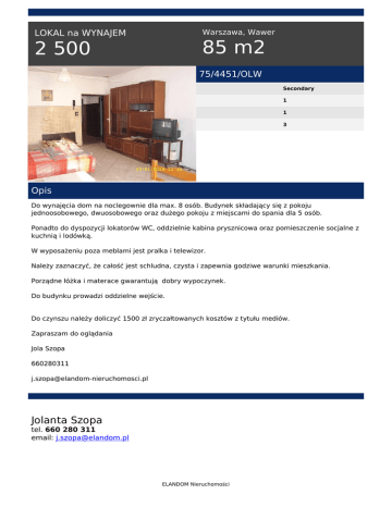 Warszawa, Wawer LOKAL na WYNAJEM 85 m2 2 500 75/4451/OLW Secondary 1 1 3 Opis Do wynajęcia dom na noclegownie dla max. 8 osób. Budynek składający się z pokoju jednoosobowego, dwuosobowego oraz dużego pokoju z miejscami do spania dla 5 osób. Ponadto do dyspozycji lokatorów WC, oddzielnie kabina prysznicowa oraz pomieszczenie socjalne z kuchnią i lodówką. W wyposażeniu poza meblami jest pralka i telewizor. Należy zaznaczyć, że całość jest schludna, czysta i zapewnia godziwe warunki mieszkania. Porządne łóżka i materace gwarantują dobry wypoczynek. Do budynku prowadzi oddzielne wejście. Do czynszu należy doliczyć 1500 zł zryczałtowanych kosztów z tytułu mediów. Zapraszam do oglądania Jola Szopa 660280311 [email protected] Jolanta Szopa tel. 660 280 311 email: [email protected] ELANDOM Nieruchomości Powered by TCPDF (www.tcpdf.org)