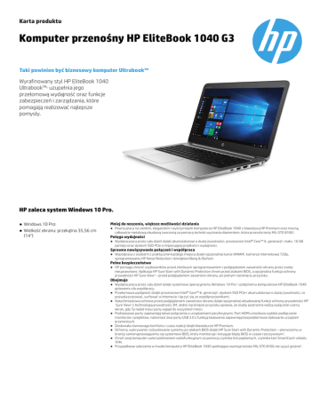 Karta produktu Komputer przenośny HP EliteBook 1040 G3 Taki powinien być biznesowy komputer Ultrabook™ Wyrafinowany styl HP EliteBook 1040 Ultrabook™ uzupełnia jego przełomową wydajność oraz funkcje zabezpieczeń i zarządzania, które pomagają realizować najlepsze pomysły. 2 HP zaleca system Windows 10 Pro. ● Windows 10 Pro1 ● Wielkość ekranu: przekątna 35,56 cm (14") Mniej do noszenia, większe możliwości działania ● Pewna praca na cienkim, eleganckim i wytrzymałym komputerze HP EliteBook 1040 z klawiaturą HP Premium oraz mocną, całkowicie metalową obudową tworzoną za pomocą techniki wycinania diamentem, która przeszła testy MIL-STD 810G3. Potęga wydajności ● Wydajna praca przez cały dzień dzięki akumulatorowi o dużej żywotności, procesorom Intel® Core™ 6. generacji4, maks. 16 GB pamięci oraz dyskom SSD PCIe o imponującej prędkości i wydajności. Sprawne nawiązywanie połączeń i współpraca ● Współpraca z osobami z praktycznie każdego miejsca dzięki opcjonalnej karcie WWAN5, kamerze internetowej 720p, oprogramowaniu HP Noise Reduction i dźwiękowi Bang & Olufsen. Pełne bezpieczeństwo ● HP pomaga chronić użytkowników przed złośliwym oprogramowaniem i podglądaniem zawartości ekranu przez osoby nieuprawnione. Aplikacja HP Sure Start with Dynamic Protection chroni przed atakami BIOS, a opcjonalna funkcja ochrony prywatności HP Sure View6 – przed podglądaniem zawartości ekranu, po jednym naciśnięciu przycisku. Obejmuje ● Wydajna praca przez cały dzień dzięki systemowi operacyjnemu Windows 10 Pro1 i potężnemu komputerowi HP EliteBook 1040 gotowemu do współpracy. ● Przełomowa wydajność dzięki procesorowi Intel® Core™ 6. generacji4, dyskom SSD PCIe i akumulatorowi o dużej żywotności, co pozwala pracować, surfować w Internecie i łączyć się ze współpracownikami. ● Natychmiastowa ochrona przed podglądaniem zawartości ekranu dzięki opcjonalnej wbudowanej funkcji ochrony prywatności HP Sure View6 z technologią prywatności 3M. Jedno naciśnięcie przycisku sprawia, że osoby postronne widzą wyłącznie czarny ekran, gdy Ty nadal masz jasny wgląd do wszystkich treści. ● Podstawowe porty zapewniają łatwe połączenia z urządzeniami peryferyjnymi. Port HDMI umożliwia szybkie podłączanie monitorów i projektów, natomiast dwa porty USB 3.0 z funkcją ładowania zapewniają bezproblemowe ładowanie urządzeń przenośnych. ● Doskonała równowaga komfortu i czasu reakcji dzięki klawiaturze HP Premium. ● Ochrona, wykrywanie i odzyskiwanie systemu po atakach BIOS dzięki HP Sure Start with Dynamic Protection – pierwszemu w branży samonaprawiającemu się systemowi BIOS, który monitoruje i koryguje błędy BIOS w czasie rzeczywistym7. ● Chroń swój komputer uwierzytelnianiem wielofunkcyjnym za pomocą czytnika linii papilarnych, czytnika kart SmartCard i układu TPM. ● Przypadkowe uderzenia w trwałe komputery HP EliteBook 1040 spełniające wymogi testów MIL-STD 810G nie są już groźne3. Karta produktu Komputer przenośny HP EliteBook 1040 G3 Tabela specyfikacji HP zaleca system Windows 10 Pro. Dostępny system operacyjny Windows 10 Pro 641 Windows 10 Home 641 Windows 10 Home Single Language 641 Windows 7 Professional 64 (dostępny poprzez możliwość zmiany wersji Windows 10 Pro 64 na niższą)2 Windows 7 Professional 641 FreeDOS 2.0 Rodzaj procesora3 Procesor Intel® Core™ i7; Procesor Intel® Core™ i5 Dostępne procesory3,4 Procesor Intel® Core™ i7-6600U z kartą graficzną Intel HD Graphics 520 (2,6 GHz, maks. 3,4 GHz z technologią Intel Turbo Boost, 4 MB pamięci podręcznej, 2 rdzenie); Procesor Intel® Core™ i7-6500U z kartą graficzną Intel HD Graphics 520 (2,5 GHz, maks. 3,1 GHz z technologią Intel Turbo Boost, 4 MB pamięci podręcznej, 2 rdzenie); Procesor Intel® Core™ i5-6300U z kartą graficzną Intel HD Graphics 520 (2,4 GHz, maks. 3 GHz z technologią Intel Turbo Boost, 3 MB pamięci podręcznej, 2 rdzenie); Procesor Intel® Core™ i5-6200U z kartą graficzną Intel HD Graphics 520 (2,3 GHz, maks. 2,8 GHz z technologią Intel Turbo Boost, 3 MB pamięci podręcznej, 2 rdzenie) Zestaw układów Układ zintegrowany z procesorem Maksymalna wielkość pamięci Maksymalnie 16 GB pamięci DDR4-2133 SDRAM Informacje o standardowej pamięci: Dostępne 16 GB pamięci DDR4-2133 SDRAM z procesorem Intel® Core™ i5-6300U lub Intel® Core™ i7-6600U. Prędkość transmisji do 2133 MT/s. Rozbudowa elementów wewnętrznych pamięci nie jest możliwa po przeprowadzeniu konfiguracji fabrycznej. Wewnętrzna pamięć masowa Maksymalnie 128 GB, 256 GB lub 512 GB Napęd SSD M.2 SATA TLC5 Maksymalnie 180 GB Napęd SSD M.2 SATA MLC5 Maksymalnie 256 GB Napęd SSD M.2 SATA MLC SED5 Maksymalnie 256 GB Napęd SSD M.2 PCIe5 Wyświetlacz Cienki ekran dotykowy FHD SVA o przekątnej 35,56 cm (14″), z funkcją HP Sure View i podświetleniem LED (1920 × 1080); Cienki ekran dotykowy FHD SVA o przekątnej 35,56 cm (14″), z funkcją HP Sure View, podświetleniem LED i kamerą (1920 × 1080); Cienki ekran FHD SVA o przekątnej 35,56 cm (14″), z powłoką antyrefleksyjną i podświetleniem LED (1920 × 1080); Cienki ekran FHD SVA o przekątnej 35,56 cm (14″), z powłoką antyrefleksyjną, podświetleniem LED i WWAN (1920 × 1080); Cienki ekran FHD SVA o przekątnej 35,56 cm (14″), z powłoką antyrefleksyjną, podświetleniem LED i kamerą (1920 × 1080); Cienki ekran FHD SVA o przekątnej 35,56 cm (14″), z powłoką antyrefleksyjną, podświetleniem LED, kamerą i WWAN (1920 × 1080); Ekran QHD UWVA o przekątnej 35,56 cm (14″), z powłoką antyrefleksyjną i podświetleniem LED (2560 × 1440); Ekran QHD UWVA o przekątnej 35,56 cm (14″), z powłoką antyrefleksyjną, podświetleniem LED i WWAN (2560 × 1440); Ekran QHD UWVA o przekątnej 35,56 cm (14″), z powłoką antyrefleksyjną, podświetleniem LED i kamerą (2560 × 1440); Ekran QHD UWVA o 