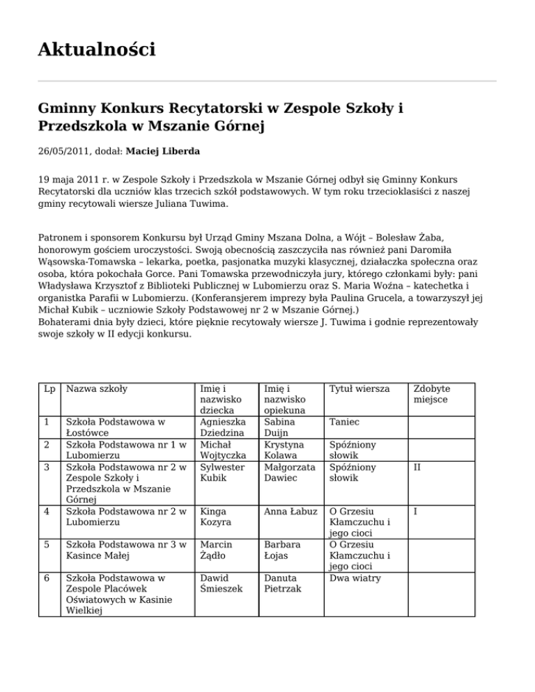 Aktualności Gminny Konkurs Recytatorski w Zespole Szkoły i Przedszkola w Mszanie Górnej 26/05/2011, dodał: Maciej Liberda 19 maja 2011 r. w Zespole Szkoły i Przedszkola w Mszanie Górnej odbył się Gminny Konkurs Recytatorski dla uczniów klas trzecich szkół podstawowych. W tym roku trzecioklasiści z naszej gminy recytowali wiersze Juliana Tuwima. Patronem i sponsorem Konkursu był Urząd Gminy Mszana Dolna, a Wójt – Bolesław Żaba, honorowym gościem uroczystości. Swoją obecnością zaszczyciła nas również pani Daromiła Wąsowska-Tomawska – lekarka, poetka, pasjonatka muzyki klasycznej, działaczka społeczna oraz osoba, która pokochała Gorce. Pani Tomawska przewodniczyła jury, którego członkami były: pani Władysława Krzysztof z Biblioteki Publicznej w Lubomierzu oraz S. Maria Woźna – katechetka i organistka Parafii w Lubomierzu. (Konferansjerem imprezy była Paulina Grucela, a towarzyszył jej Michał Kubik – uczniowie Szkoły Podstawowej nr 2 w Mszanie Górnej.) Bohaterami dnia były dzieci, które pięknie recytowały wiersze J. Tuwima i godnie reprezentowały swoje szkoły w II edycji konkursu. Lp Nazwa szkoły 1 Szkoła Podstawowa w Łostówce Szkoła Podstawowa nr 1 w Lubomierzu Szkoła Podstawowa nr 2 w Zespole Szkoły i Przedszkola w Mszanie Górnej Szkoła Podstawowa nr 2 w Lubomierzu 2 3 4 Imię i nazwisko dziecka Agnieszka Dziedzina Michał Wojtyczka Sylwester Kubik Imię i nazwisko opiekuna Sabina Duijn Krystyna Kolawa Małgorzata Dawiec Tytuł wiersza Kinga Kozyra Anna Łabuz O Grzesiu Kłamczuchu i jego cioci O Grzesiu Kłamczuchu i jego cioci Dwa wiatry 5 Szkoła Podstawowa nr 3 w Kasince Małej Marcin Żądło Barbara Łojas 6 Szkoła Podstawowa w Zespole Placówek Oświatowych w Kasinie Wielkiej Dawid Śmieszek Danuta Pietrzak Zdobyte miejsce Taniec Spóźniony słowik Spóźniony słowik II I 7 8 9 10 11 12 Szkoła Podstawowa w Zespole Placówek Oświatowych nr 1 w Kasince Małej Szkoła Podstawowa nr 2 w Kasince Małej Szkoła Podstawowa w Łętowem Szkoła Podstawowa w Glisnem Szkoła Podstawowa nr 1 w Zespole Placówek Oświatowych w Mszanie Górnej Szkoła Podstawowa w Zespole Szkoły i przedszkola w Olszówce Patryk Szczypka Grażyna Szczypka Rycerz Krzykalski Agata Jakubiak Gabriela Dawiec Zofia Wójcik Wojciech Węglarz Irena Marszalik Mirosława Jarosz Elżbieta Pustelnik Jadwiga Borowiecka W aeroplanie Wyróżnienie Spóźniony słowik Zosia Samosia III Lokomotywa I Izabela Nowak Wioletta Kraus Rycerz Krzykalski Laureaci Konkursu otrzymali nagrody rzeczowe. Wszyscy uczestnicy – dyplomy, albumy promocyjne „Gmina Mszana Dolna” i słodkie prezenciki. Szczególną nagrodą były tomiki wierszy „Postoje” i „Ślad stopy” Daromiły Wąsowskiej-Tomawskiej, które autorka przekazała recytatorom i organizatorom. Gratulujemy dzieciom, ich opiekunom, rodzicom i serdecznie dziękujemy za zainteresowanie i zaangażowanie w Konkurs. Z nadzieją spotkania za rok – życzymy wszystkim miłych wakacji. zobacz zdjęcia Ewa Jasica-Ociepka Stanisława Nowak