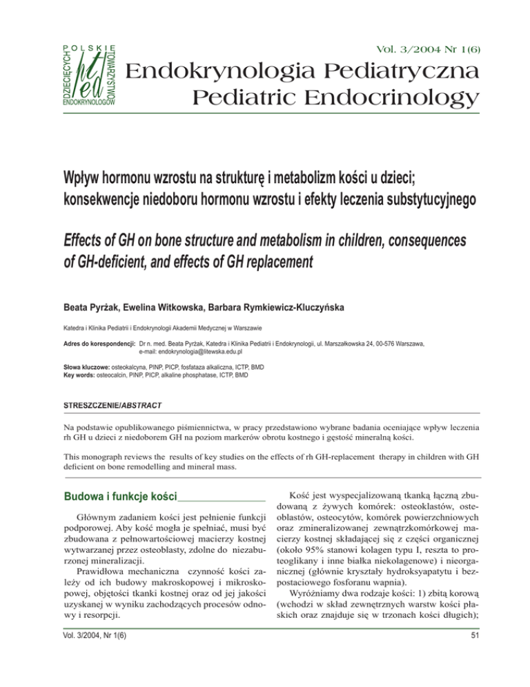 Vol. 3/2004 Nr 1(6) Endokrynologia Pediatryczna Pediatric Endocrinology Wpływ hormonu wzrostu na strukturę i metabolizm kości u dzieci; konsekwencje niedoboru hormonu wzrostu i efekty leczenia substytucyjnego Effects of GH on bone structure and metabolism in children, consequences of GH-deficient, and effects of GH replacement Beata Pyrżak, Ewelina Witkowska, Barbara Rymkiewicz-Kluczyńska Katedra i Klinika Pediatrii i Endokrynologii Akademii Medycznej w Warszawie Adres do korespondencji: Dr n. med. Beata Pyrżak, Katedra i Klinika Pediatrii i Endokrynologii, ul. Marszałkowska 24, 00-576 Warszawa, e-mail: [email protected] Słowa kluczowe: osteokalcyna, PINP, PICP, fosfataza alkaliczna, ICTP, BMD Key words: osteocalcin, PINP, PICP, alkaline phosphatase, ICTP, BMD STRESZCZENIE/ STRESZCZENIE/ABSTRACT Na podstawie opublikowanego piśmiennictwa, w pracy przedstawiono wybrane badania oceniające wpływ leczenia rh GH u dzieci z niedoborem GH na poziom markerów obrotu kostnego i gęstość mineralną kości. This monograph reviews the results of key studies on the effects of rh GH-replacement therapy in children with GH deficient on bone remodelling and mineral mass. Budowa i funkcje kości Głównym zadaniem kości jest pełnienie funkcji podporowej. Aby kość mogła je spełniać, musi być zbudowana z pełnowartościowej macierzy kostnej wytwarzanej przez osteoblasty, zdolne do niezaburzonej mineralizacji. Prawidłowa mechaniczna czynność kości zależy od ich budowy makroskopowej i mikroskopowej, objętości tkanki kostnej oraz od jej jakości uzyskanej w wyniku zachodzących procesów odnowy i resorpcji. Vol. 3/2004, Nr 1(6) Kość jest wyspecjalizowaną tkanką łączną zbudowaną z żywych komórek: osteoklastów, osteoblastów, osteocytów, komórek powierzchniowych oraz zmineralizowanej zewnątrzkomórkowej macierzy kostnej składającej się z części organicznej (około 95% stanowi kolagen typu I, reszta to proteoglikany i inne białka niekolagenowe) i nieorganicznej (głównie kryształy hydroksyapatytu i bezpostaciowego fosforanu wapnia). Wyróżniamy dwa rodzaje kości: 1) zbitą korową (wchodzi w skład zewnętrznych warstw kości płaskich oraz znajduje się w trzonach kości długich); 51 Praca przeglądowa 2) beleczkowatą, gąbczastą (znajduje się w nasadach i przynasadach kości długich oraz wypełnia wnętrze kości płaskich). Na metabolizm kości składają się dwa główne procesy: 1) budowanie kości (modelling), trwające przez cały okres wzrastania aż do osiągnięcia dojrzałości; 2) przebudowa kości (remodelling), zachodząca przez całe życie. Budowanie kości odbywa się poprzez zwiększanie wymiaru poprzecznego kości długich i wszystkich wymiarów innych kości oraz przez wzrost odchrzęstny na długość. Przebudowa kości polega na resorpcji starej kości przez osteoblasty. Proces ten zachodzi w małych odcinkach szkieletu tzw. jednostkach metabolicznych kości (BMU – bone metabolic unit). W tym samym czasie przebudowa zachodzi w milionach jednostek metabolicznych kości w całym układzie kostnym. Każdy odcinek szkieletu podlega przebudowie co 2-4 lata. Proces resorpcji, tworzenia i mineralizacji kości trwa zwykle 3-6 miesięcy. Ocena obrotu kostnego (bone turnover) Przemiany zachodzące w kościach można ocenić za pomocą oznaczania we krwi lub moczu markerów kościotworzenia i resorpcji kości. 1. Markery kościotworzenia: – PINP (procollagen I N-terminal propetide) – N końcowy propeptyd prokolagenu typu I; – PICP (procollagen I C-terminal propeptide) – C końcowy propeptyd prokolagenu typu I; – osteokalcyna (tzw. białko gla); – fosfataza alkaliczna, a zwłaszcza jej izoenzym kostny. 2. Markery resorpcji kostnej: Dla dojrzałego kolagenu macierzy kostnej charakterystyczne są wiązania pirydynolinowe: – Pirydynolina (Pyr); – Dezoksypirydynolina (DPyr) W trakcie resorpcji kości Pyr i DPyr (piridinum cross-links) są uwalniane do krążenia i pojawiają się w moczu, gdzie mogą być oznaczane jako markery resorpcji tkanki kostnej. Szybkość resorpcji kości można też oceniać na podstawie pomiaru: w surowicy krwi stężenia Ckońcowego telopeptydu kolagenu typu I (ICTP-C – terminal cross-linked telopeptide of type I collagen); w moczu stężenia N-końcowego telopeptydu kolagenu typu I (NTX). W okresie rozwoju organizmu stężenia markerów kościotworzenia i resorpcji kolagenu tkanki kostnej są wielokrotnie wyższe niż u dorosłych. 52 Endokrynol. Ped., 3/2004;1(6):51-56 Odzwierciedlają one procesy modelowania i wewnętrznej przebudowy kości zachodzące podczas wzrostu organizmu. Ma to swoje odbicie w dodatnich korelacjach między stężeniami wymienionych markerów a szybkością wzrastania. U dzieci z niedoborem hormonu wzrostu stwierdza się znaczne obniżenie stężenia wymienionych markerów [1-10]. Fizjologiczne działanie hormonu wzrostu na rozwój kości Działanie hormonu wzrostu (GH) jest wielokierunkowe. Hormon wzrostu stymuluje wzrost kości, chrząstki i tkanki łącznej, a także wpływa na gospodarką lipidową, węglowodanową i białkową. Hormon wzrostu oddziałuje bezpośrednio na komórki docelowe (chondrocyty i osteoblasty) poprzez specyficzny receptor błonowy, a pośrednio przez IGF-I (insulinopodobny czynnik wzrostu typu I, somatomedynę C). W warunkach fizjologicznych GH zwiększa: obrót kostny, zwiększając wytwarzanie i resorpcję kostną z przewagą procesów kościotworzenia: gęstość mineralną kości (bone mineral density – BMD); zawartość minerałów w kościach (bone mineral content – BMC). Działa on na kości w sposób bezpośredni (działanie na płytkę nasadową) i pośredni. Bezpośrednio poprzez swoje receptory zlokalizowane w osteoblastach stymuluje aktywność i proliferację osteoblastów. Ponadto zwiększa liczbę i różnicowanie osteoklastów. Pośrednie działanie GH na kości zachodzi z udziałem IGF-I produkowanego w wątrobie i wytwarzanego 