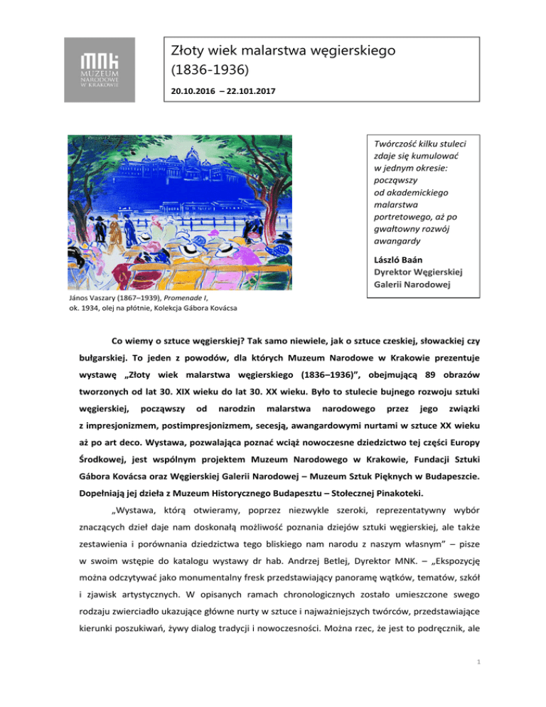 Złoty wiek malarstwa węgierskiego (1836-1936) 20.10.2016 – 22.101.2017 Twórczość kilku stuleci zdaje się kumulować w jednym okresie: począwszy od akademickiego malarstwa portretowego, aż po gwałtowny rozwój awangardy László Baán Dyrektor Węgierskiej Galerii Narodowej János Vaszary (1867–1939), Promenade I, ok. 1934, olej na płótnie, Kolekcja Gábora Kovácsa Co wiemy o sztuce węgierskiej? Tak samo niewiele, jak o sztuce czeskiej, słowackiej czy bułgarskiej. To jeden z powodów, dla których Muzeum Narodowe w Krakowie prezentuje wystawę „Złoty wiek malarstwa węgierskiego (1836–1936)”, obejmującą 89 obrazów tworzonych od lat 30. XIX wieku do lat 30. XX wieku. Było to stulecie bujnego rozwoju sztuki węgierskiej, począwszy od narodzin malarstwa narodowego przez jego związki z impresjonizmem, postimpresjonizmem, secesją, awangardowymi nurtami w sztuce XX wieku aż po art deco. Wystawa, pozwalająca poznać wciąż nowoczesne dziedzictwo tej części Europy Środkowej, jest wspólnym projektem Muzeum Narodowego w Krakowie, Fundacji Sztuki Gábora Kovácsa oraz Węgierskiej Galerii Narodowej – Muzeum Sztuk Pięknych w Budapeszcie. Dopełniają jej dzieła z Muzeum Historycznego Budapesztu – Stołecznej Pinakoteki. „Wystawa, którą otwieramy, poprzez niezwykle szeroki, reprezentatywny wybór znaczących dzieł daje nam doskonałą możliwość poznania dziejów sztuki węgierskiej, ale także zestawienia i porównania dziedzictwa tego bliskiego nam narodu z naszym własnym” – pisze w swoim wstępie do katalogu wystawy dr hab. Andrzej Betlej, Dyrektor MNK. – „Ekspozycję można odczytywać jako monumentalny fresk przedstawiający panoramę wątków, tematów, szkół i zjawisk artystycznych. W opisanych ramach chronologicznych zostało umieszczone swego rodzaju zwierciadło ukazujące główne nurty w sztuce i najważniejszych twórców, przedstawiające kierunki poszukiwań, żywy dialog tradycji i nowoczesności. Można rzec, że jest to podręcznik, ale 1 Złoty wiek malarstwa węgierskiego (1836-1936) 20.10.2016 – 22.101.2017 podręcznik nam bliski, bo dotyczący również nas. Dzięki temu, że wystawa jest prezentowana w Gmachu Głównym, każdy ma możliwość łatwego odnalezienia – w stałej Galerii Sztuki Polskiej XX wieku (ale oczywiście także w Galerii Sztuki Polskiej XIX wieku mieszczącej się w Sukiennicach) – polskich dzieł z analogicznego okresu, stanowiących widomy znak tej łączności. Możemy więc tworzyć własne narracje, opierając się na tych pracach, paralelnych czy wręcz bliźniaczych. Warto też pamiętać, że okres, kiedy powstawały, był znamienny, wtenczas – zarówno na Węgrzech, jak i na ziemiach polskich – kreowano podstawowe toposy świadomości, budując »pomost między mitami przeszłości a utopiami przyszłości, ku której spogląda niecierpliwa nadzieja czasu«”. Jak stwierdził w katalogu wystawy Dyrektor Muzeum sztuk Pięknych - Węgierskiej Galerii Narodowej dr László Baán: „Stulecie reprezentowane na wystawie węgierskiego malarstwa w Muzeum Narodowym w Krakowie rozpoczęło się wraz z XIX-wiecznym przebudzeniem narodowym Węgrów, a zakończyło modernizmem XX wieku – już na pierwszy rzut oka ma się wrażenie, że obejmuje ono więcej niż jeden wiek. Twórczość kilku stuleci zdaje się kumulować w jednym okresie: począwszy od akademickiego malarstwa portretowego, aż po gwałtowny rozwój awangardy. Artyści historyzujący i realiści, romantycy i symboliści, naturaliści i węgierscy fowiści, uczniowie szkół i poszukiwacze własnych dróg – ich dzieła pomagają w przebyciu szczególnej podróży w czasie i przestrzeni przez niezwykle płodną erę węgierskiego malarstwa”. Obrazy są prezentowane z podziałem na dziewięć grup tematycznych: pierwsze cztery ogniskują się na dziejach malarstwa węgierskiego w XIX wieku, zaś kolejne pięć ukazuje jego dynamiczny rozwój w następnym stuleciu: I. Początki węgierskiego malarstwa narodowego. Wystawę otwierają portrety postaci zasłużonych dla budowania węgierskiej tożsamości narodowej – Istvána Széchenyiego, Sándora Petőfiego i Ferenca Liszta, a także XIX-wieczne malarstwo pejzażowe, m.in. Károlya Markó starszego i Sándora Brodskiego. II. Idealna przeszłość i realna teraźniejszość. Dzieła w tej części składają się na gorzką refleksję nad historią Węgier. Podobizny węgierskich bohaterów, którzy zasłynęli w walce o niezależność 2 Złoty wiek malarstwa węgierskiego (1836-1936) 20.10.2016 – 22.101.2017 względem Habsburgów (Péter Zrínyi, Ferenc Frangepán, Franciszek II Rakoczy), zestawiono z przedstawieniami Cyganów i uchodźców, a także biedy i rozpaczy. III. Od realizmu do naturalizmu. Ten fragment obejmuje zarówno portrety eleganckich dam, jak i naturalistyczne sceny z udziałem ludu. Na pierwszy plan wysuwa się opozycja między realizmem a idealizującym nastawieniem romantyków. IV. Ćwiczenia malarskie w plenerze – Monachium, Nagybánya, Szolnok. Edukacja twórców zgromadzonych w tej sali wiodła od monachijskiej Akademii po słynne kolonie artystów w miejscowościach Nagybánya czy Szolnok, gdzie Simon Hollósy z uczniami mogli obserwować zmieniające się światło i barwy. V. Sny i wizje przełomu wieków. Ta przestrzeń poświęcona jest dwóm samotnikom i wizjonerom przełomu wieków – Tivadarowi Csontváryemu Kosztce i Lajosowi Gulácsyemu. Obaj malowali senne wizje i majaki. VI. Urok Paryża – poszukiwanie nowoczesności na początku XX wieku. Wśród ważnych węgierskich artystów przełomu wieków wielu studiowało lub wystawiało w Paryżu. Stąd kolejną część prezentacji otwierają przedstawienia francuskich salonów. Krajobrazy, sceny miejskie i martwe natury są wynikiem fascynacji wybitnymi francuskimi artystami, takimi jak Matisse, Cézanne czy Gauguin. Nie zabraknie też obrazów członków grupy Ośmiu, w tym Bél