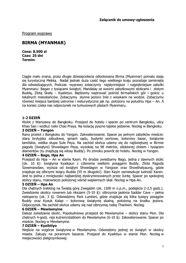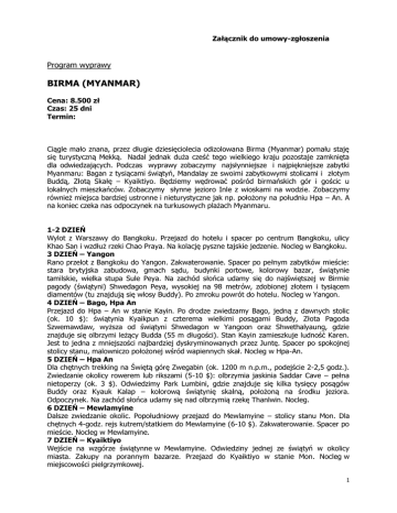 Załącznik do umowy-zgłoszenia Program wyprawy BIRMA (MYANMAR) Cena: 8.500 zł Czas: 25 dni Termin: Ciągle mało znana, przez długie dziesięciolecia odizolowana Birma (Myanmar) pomału staję się turystyczną Mekką. Nadal jednak duża cześć tego wielkiego kraju pozostaje zamknięta dla odwiedzających. Podczas wyprawy zobaczymy najsłynniejsze i najpiękniejsze zabytki Myanmaru: Bagan z tysiącami świątyń, Mandalay ze swoimi zabytkowymi stolicami i złotym Buddą, Złotą Skałę – Kyaiktiyo. Będziemy wędrować pośród birmańskich gór i gościc u lokalnych mieszkańców. Zobaczymy słynne jezioro Inle z wioskami na wodzie. Zobaczymy również miejsca bardziej ustronne i nieturystyczne jak np. położony na południu Hpa – An. A na koniec czeka nas odpoczynek na turkusowych plażach Myanmaru. 1-2 DZIEŃ Wylot z Warszawy do Bangkoku. Przejazd do hotelu i spacer po centrum Bangkoku, ulicy Khao San i wzdłuż rzeki Chao Praya. Na kolację pyszne tajskie jedzenie. Nocleg w Bangkoku. 3 DZIEŃ – Yangon Rano przelot z Bangkoku do Yangon. Zakwaterowanie. Spacer po pełnym zabytków mieście: stara brytyjska zabudowa, gmach sądu, budynki portowe, kolorowy bazar, świątynie tamilskie, wielka stupa Sule Peya. Na zachód słońca udamy się do najświętszej w Birmie pagody (świątyni) Shwedagon Peya, wysokiej na 98 metrów, zdobionej złotem i tysiącem diamentów (tu znajdują się włosy Buddy). Po zmroku powrót do hotelu. Nocleg w Yangon. 4 DZIEŃ – Bago, Hpa An Przejazd do Hpa – An w stanie Kayin. Po drodze zwiedzamy Bago, jedną z dawnych stolic (ok. 10 $): świątynia Kyaikpun z czterema wielkimi posągami Buddy, Złota Pagoda Szwemawdaw, wyższa od świątyni Shwedagon w Yangoon oraz Shwethalyaung, gdzie znajduje się olbrzymi leżący Budda (55 m długości). Stan Kayin zamieszkuje ludność Karen. Jest to jedna z mniejszości najbardziej dyskryminowanych przez Juntę. Spacer po spokojnej stolicy stanu, malowniczo położonej wśród wapiennych skał. Nocleg w Hpa-An. 5 DZIEŃ – Hpa An Dla chętnych trekking na Świętą górę Zwegabin (ok. 1200 m n.p.m., podejście 2-2,5 godz.). Zwiedzanie okolicy rowerem lub rikszami (5-10 $): olbrzymia jaskinia Saddar Cave – pełna nietoperzy (ok. 3 $). Odwiedzimy Park Lumbini, gdzie znajduje się kilka tysięcy posągów Buddy oraz Kyauk Kalap – kolorową świątynię skalną, położoną na środku jeziora. Odpoczynek. Na zachód słońca udamy się nad olbrzymią rzekę Thanlwin. Nocleg. 6 DZIEŃ – Mewlamyine Dalsze zwiedzanie okolic. Popołudniowy przejazd do Mewlamyine – stolicy stanu Mon. Dla chętnych 4-godz. rejs kutrem/statkiem do Mewlamyine (6-10 $). Zakwaterowanie. Spacer po mieście. Nocleg w Mewlamyine. 7 DZIEŃ – Kyaiktiyo Wejście na wzgórze świątynne w Mewlamyine. Odwiedziny jednej ze świątyń w okolicy miasta. Zakupy na porannym bazarze. Przejazd do Kyaiktiyo w stanie Mon. Nocleg w miejscowości pielgrzymkowej. 1 8 DZIEŃ – Kyaiktiyo Wczesnym rankiem wyjazd ciężarówką do najważniejszego centrum pielgrzymkowego w Birmie – Złotej Skały. Kyaiktiyo to sanktuarium na szczycie wzgórza, w jego centrum znajduje się olbrzymi głaz, który w cudowny sposób utrzymuje się na skale, ponoć za sprawą włosa Buddy. Godzinne podejście do sanktuarium na wzgórzu wraz z birmańskimi pielgrzymami. Po obiedzie wyjazd na północ do Taungoo – kolejnej dawnej stolicy Birmy. Nocleg w Taungoo. 9 DZIEŃ – Kalaw Dalszy przejazd do Kalaw – spokojnej górskiej miejscowości o łagodnym klimacie. W okolicach mieszka wiele różnych plemion. Spacer po mieście, zakupy herbaty, odpoczynek. Nocleg w Kalaw. 10-11 DZIEŃ – trekking Trekking (ok. 15 $, w tym wyżywienie) górskimi drogami przez malownicze okolice. Po drodze odwiedzamy wioski zamieszkałe przez plemiona Pa-O i Palaung, zajmujące się głównie uprawą herbaty. Nocleg w jednej z wiosek w lokalnym domu. Drugiego dnia przejazd na nocleg do Nyaungshwe nad jeziorem Inle. 12 DZIEŃ – Inle Całodzienny rejs łodzią po Jeziorze Inle. Jezioro słynie z domów położonych na wodzie, pływających ogrodów, a przede wszystkim rybaków, którzy używają do wiosłowania jednej nogi. Odwiedzimy wioski na wodzie, buddyjskie klasztory, lokalne sklepy i markety. Na kolację smażona ryba. Nocleg w Nyaungshwe. 13 DZIEŃ – Mandalay Całodzienny przejazd do miasta Mandalay, XIX-wiecznej stolicy Birmy. W okolicach miasta znajduje się kilka dawnych stolic królewskich, pełnych świątyń i pałaców. Nocleg w Mandalay. 14 DZIEŃ – Mandalay Zwiedzanie Mandalay i okolic (ok. 10 $ – combo ticket). Odwiedzimy świątynię Mahamuni Peya, gdzie znajduje się najważniejszy w Birmie posąg Buddy, cały pokryty złotem. Sagaing – spacer po wzgórzach pełnych świątyń. W Awa (ok. 3 $ – konne taxi) zobaczymy Bagaya Kyaung – drewniany klasztor, którego podpory stanowi 267 olbrzymich pni z drzewa tekowego, królewski klasztor – Maha Aumgnye oraz wieżę, która pozostała z dawnego pałacu. Na zachód słońca pojedziemy do Amarapury, gdzie znajduje się najdłuższy na świecie most tekowy (1,3 km). Nocleg w Mandalay. 15 DZIEŃ – Mingun Wycieczka łodzią, rzeką Irawadi, do Mingun (ok. 5 $). Zwiedzanie: Stupa Mingun, która miała być najwyższą na świecie stupą i mierzyć 150 metrów, jednak król nie ukończył nigdy swojego dzieła. Sama podstawa stupy, która ma 50 merów wysokości jest imponująca. Powrót do Mandalay. Po obiedzie odwiedzimy świątynię Kuthodaw – najwiekszą bibliotekę kamienną na świecie. Na 729 marmurowych tablicach zapisano Tipitakę – podstawę kanonu buddyjskiego. W kolejnej świątyni Sadamuni Peya zobaczymy spisany na ponad tysiącu tablic komentarz do Tipitaki. Wejście na zachód słońca na Wzgórze Mandalay. 16 DZIEŃ – Bagan, Popa Przejazd do Bagan. Po drodze odwiedzimy malowniczą Górę Popa. Góra jest najświętszym miejscem kultu duchów Nat, które są nieodłącznym elementem buddyz