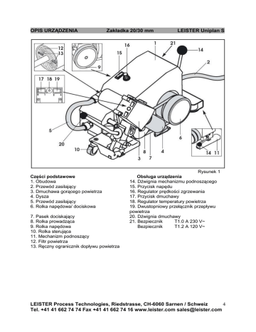 OPIS URZĄDZENIA Zakładka 20/30 mm Części podstawowe 1. Obudowa 2. Przewód zasilający 3. Dmuchawa gorącego powietrza 4. Dysza 5. Przewód zasilający 6. Rolka napędowa/ dociskowa 7. Pasek dociskający 8. Rolka prowadząca 9. Rolka napędowa 10. Rolka sterująca 11. Mechanizm podnoszący 12. Filtr powietrza 13. Ręczny ogranicznik dopływu powietrza LEISTER Uniplan S Rysunek 1 Obsługa urządzenia 14. Dźwignia mechanizmu podnoszącego 15. Przycisk napędu 16. Regulator prędkości zgrzewania 17. Przycisk dmuchawy 18. Regulator temperatury powietrza 19. Dwustopniowy przełącznik przepływu powietrza 20. Dźwignia dmuchawy 21. Bezpiecznik T1.0 A 230 V~ Bezpiecznik T1.2 A 120 V~ 4 LEISTER Process Technologies, Riedstrasse, CH-6060 Sarnen / Schweiz Tel. +41 41 662 74 74 Fax +41 41 662 74 16 www.leister.com [email protected] OBSŁUGA LEISTER Uniplan S Przygotowanie urządzenia - Sprawdzić pozycję wyjściową dyszy zgrzewającej (patrz rysunek) Podłączyć urządzenie do źródła zasilania. Pozycjonowanie urządzenia - - Wysunąć i podnieść dmuchawę (3) za pomocą dźwigni (20) do momentu zablokowania połoŜenia w górnej pozycji. Za pomocą dźwigni podnośnika (14) przestawić mechanizm podnoszący (11) w taki sposób, aby rolka napędowa/dociskowa (6) były luźne. Ustawić urządzenie nad nałoŜonymi na siebie materiałami. Zewnętrzna krawędź rolki napędowej/dociskowej (6) musi zostać umiejscowiona równo z krawędzią zakładki. Za pomocą dźwigni podnośnika (11) opuścić urządzenie na materiał przeznaczony do zgrzania. Parametry zgrzewania - Ustawić prędkość zgrzewania za pomocą regulatora prędkości (16). Ustawić poŜądaną temperaturę regulatorem temperatury zgrzewania (18). Ustawić przycisk dmuchawy (17) w pozycji I. Ustawić przełącznik przepływu powietrza (19) w pozycji 3 i odczekać 3-5 minut aŜ pełnego nagrzania się urządzenia. WAśNE: zbyt niskie napięcie W przypadku, gdy maksymalna temperatura nie zostaje osiągnięta naleŜy zredukować przepływ powietrza za pomocą przełącznika (19) oraz ręcznego ogranicznika dopływu powietrza (13). Proces zgrzewania - - - - Dmuchawę gorącego powietrza (3) dosunąć do końca za pomocą dźwigni dmuchawy (20) w taki sposób, aby dysza gorącego powietrza znalazła się pomiędzy zgrzewanymi warstwami materiału i od razu nacisnąć przycisk napędu (15) (zgrzewanie rozpoczęte). Kontrolować proces zgrzewania. JeŜeli zajdzie taka konieczność, dostosować prędkość zgrzewania regulatorem (16). Prowadzić urządzenie prosto wzdłuŜ zakładki. Wyłączyć przycisk napędu (15). Po zakończeniu zgrzewania ustawić regulator temperatury powietrza (18) w pozycji 0 i pozostawić pracujące urządzenie przez kilka minut w celu wychłodzenia elementów grzejnych. Następnie wyłączyć dmuchawę przyciskiem (17). Odłączyć urządzenie od źródła zasilania. 5 LEISTER Process Technologies, Riedstrasse, CH-6060 Sarnen / Schweiz Tel. +41 41 662 74 74 Fax +41 41 662 74 16 www.leister.com [email protected]