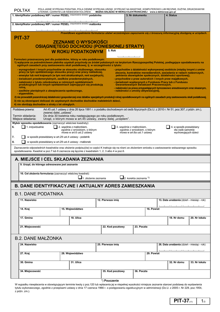 POLA JASNE WYPEŁNIA PODATNIK, POLA CIEMNE WYPEŁNIA URZĄD. WYPEŁNIĆ NA MASZYNIE, KOMPUTEROWO LUB RĘCZNIE, DUŻYMI, DRUKOWANYMI LITERAMI, CZARNYM LUB NIEBIESKIM KOLOREM. MOŻNA SKŁADAĆ W WERSJI ELEKTRONICZNEJ www.e-deklaracje.gov.pl POLTAX 1. Identyfikator podatkowy NIP / numer PESEL (niepotrzebne skreślić) podatnika 3. Nr dokumentu └────┴────┴────┴────┴────┴────┴────┴────┴────┴────┴────┘ 2. Identyfikator podatkowy NIP / numer PESEL (niepotrzebne skreślić) małżonka 4. Status 3. 4. └────┴────┴────┴────┴────┴────┴────┴────┴────┴────┴────┘ Prawidłowe wypełnienie formularza ułatwi wcześniejsze zapoznanie się z broszurą informacyjną dostępną w urzędach. PIT-37 ZEZNANIE O WYSOKOŚCI OSIĄGNIĘTEGO DOCHODU (PONIESIONEJ STRATY) W ROKU PODATKOWYM 5. Rok └────┴────┴────┴────┘ Formularz przeznaczony jest dla podatników, którzy w roku podatkowym: 1) wyłącznie za pośrednictwem płatnika uzyskali przychody ze źródeł położonych na terytorium Rzeczypospolitej Polskiej, podlegające opodatkowaniu na ogólnych zasadach przy zastosowaniu skali podatkowej, tj. w szczególności z tytułu: - wynagrodzeń i innych przychodów ze stosunku służbowego, stosunku - przychodów z działalności wykonywanej osobiście (między innymi z umów pracy (w tym spółdzielczego stosunku pracy) oraz pracy nakładczej, zlecenia, kontraktów menedżerskich, zasiadania w radach nadzorczych, - emerytur lub rent krajowych (w tym rent strukturalnych, rent socjalnych), pełnienia obowiązków społecznych, działalności sportowej), - świadczeń przedemerytalnych, zasiłków przedemerytalnych, - przychodów z praw autorskich i innych praw majątkowych, - należności z tytułu członkostwa w rolniczych spółdzielniach - świadczeń wypłaconych z Funduszu Pracy lub z Funduszu produkcyjnych lub innych spółdzielniach zajmujących się produkcją Gwarantowanych Świadczeń Pracowniczych, rolną, - należności za pracę przypadających tymczasowo aresztowanym oraz skazanym, - zasiłków pieniężnych z ubezpieczenia społecznego, - należności z umowy aktywizacyjnej, - stypendiów, 2) nie prowadzili pozarolniczej działalności gospodarczej oraz działów specjalnych produkcji rolnej opodatkowanych na ogólnych zasadach przy zastosowaniu skali podatkowej, 3) nie są obowiązani doliczać do uzyskanych dochodów dochodów małoletnich dzieci, 4) nie obniżają dochodów o straty z lat ubiegłych. Podstawa prawna: Termin składania: Miejsce składania: Art.45 ust.1 ustawy z dnia 26 lipca 1991 r. o podatku dochodowym od osób fizycznych (Dz.U. z 2010 r. Nr 51, poz.307, z późn. zm.), zwanej dalej ustawą”. ” Do dnia 30 kwietnia roku następującego po roku podatkowym. Urząd, o którym mowa w art.45 ustawy, zwany dalej urzędem”. ” Wybór sposobu opodatkowania (zaznaczyć właściwe kwadraty): 6. 1. indywidualnie wspólnie z małżonkiem, 2. zgodnie z wnioskiem, o którym 7. w sposób przewidziany w art.29 ust.4 ustawy - podatnik w sposób przewidziany w art.29 ust.4 ustawy - małżonek z małżonkiem, 3. wspólnie zgodnie z wnioskiem, o którym mowa w art.6 ust.2 ustawy 8. przewidziany 4. wdlasposób osób samotnie wychowujących dzieci mowa w art.6a ust.1 ustawy Zaznaczenie odpowiednich kwadratów oraz złożenie podpisu(ów) w części K traktuje się na równi ze złożeniem wniosku o zastosowanie wskazanego sposobu opodatkowania. Kwadrat w poz.7 lub 8 zaznacza się łącznie z kwadratem 1, 2, 3 albo 4 w poz.6. A. MIEJSCE I CEL SKŁADANIA ZEZNANIA 9. Urząd, do którego adresowane jest zeznanie 10. Cel złożenia formularza (zaznaczyć właściwy kwadrat): 1. złożenie zeznania 2. korekta zeznania 1) B. DANE IDENTYFIKACYJNE I AKTUALNY ADRES ZAMIESZKANIA B.1. DANE PODATNIKA 11. Nazwisko 12. Pierwsze imię 13. Data urodzenia (dzień - miesiąc - rok) └────┴────┘-└────┴────┘-└────┴────┴────┴────┘ 14. Kraj 15. Województwo 17. Gmina 16. Powiat 18. Ulica 21. Miejscowość 19. Nr domu 22. Kod pocztowy 20. Nr lokalu 23. Poczta B.2. DANE MAŁŻONKA 24. Nazwisko 25. Pierwsze imię 26. Data urodzenia (dzień - miesiąc - rok) └────┴────┘-└────┴────┘-└────┴────┴────┴────┘ 27. Kraj 30. Gmina 34. Miejscowość 28. Województwo 29. Powiat 31. Ulica 32. Nr domu 35. Kod pocztowy 33. Nr lokalu 36. Poczta *) Pouczenie W wypadku niewpłacenia w obowiązującym terminie kwoty z poz.120 lub wpłacenia jej w niepełnej wysokości niniejsze zeznanie stanowi podstawę do wystawienia tytułu wykonawczego, zgodnie z przepisami ustawy z dnia 17 czerwca 1966 r. o postępowaniu egzekucyjnym w administracji (Dz.U. z 2005 r. Nr 229, poz.1954, z późn. zm.). PIT-37 (17) 1/3 POLA JASNE WYPEŁNIA PODATNIK, POLA CIEMNE WYPEŁNIA URZĄD. WYPEŁNIĆ NA MASZYNIE, KOMPUTEROWO LUB RĘCZNIE, DUŻYMI, DRUKOWANYMI LITERAMI, CZARNYM LUB NIEBIESKIM KOLOREM. MOŻNA SKŁADAĆ W WERSJI ELEKTRONICZNEJ www.e-deklaracje.gov.pl POLTAX C. DOCHODY / STRATY ZE ŹRÓDEŁ PRZYCHODÓW C.1. DOCHODY I STRATY PODATNIKA Źródła przychodów Koszty uzyskania przychodów Przychód zł, a gr zł, b 1. Należności ze stosunku: pracy, służbowego, spółdzielczego i z pracy nakładczej, a także zasiłki pieniężne z ubezpieczenia społecznego wypłacone przez zakład pracy 37. 2. Emerytury - renty oraz inne krajowe świadczenia, o których mowa w art.34 ust.7 ustawy 3. Działalność wykonywana osobiście, o której mowa w art.13 ustawy (w tym umowy o dzieło i zlecenia) 4. Prawa autorskie i inne prawa, o których mowa w art.18 ustawy 42. 5. Inne źródła, niewymienione w wierszach od 1 do 4 55. 6. RAZEM 60. Doch