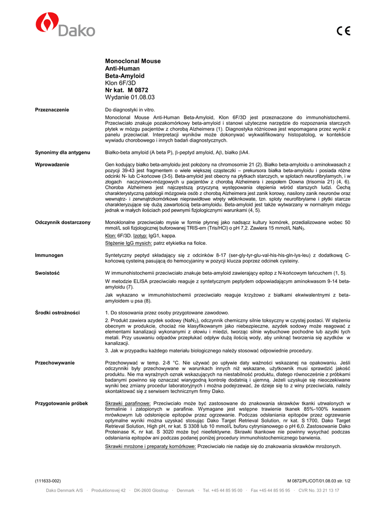 Monoclonal Mouse Anti-Human Beta-Amyloid Klon 6F/3D Nr kat. M 0872 Wydanie 01.08.03 Przeznaczenie Do diagnostyki in vitro. Monoclonal Mouse Anti-Human Beta-Amyloid, Klon 6F/3D jest przeznaczone do immunohistochemii. Przeciwciało znakuje pozakomórkowy beta-amyloid i stanowi użyteczne narzędzie do rozpoznania starczych płytek w mózgu pacjentów z chorobą Alzheimera (1). Diagnostyka różnicowa jest wspomagana przez wyniki z panelu przeciwciał. Interpretacji wyników może dokonywać wykwalifikowany histopatolog, w kontekście wywiadu chorobowego i innych badań diagnostycznych. Synonimy dla antygenu Białko-beta amyloid (A beta P), -peptyd amyloid, A, białko A4. Wprowadzenie Gen kodujący białko beta-amyloidu jest położony na chromosomie 21 (2). Białko beta-amyloidu o aminokwasach z pozycji 39-43 jest fragmentem o wiele większej cząsteczki – prekursora białka beta-amyloidu i posiada różne odcinki N- lub C-końcowe (3-5). Beta-amyloid jest obecny na płytkach starczych, w splotach neurofibrylarnych, i w złogach naczyniowo-mózgowych u pacjentów z chorobą Alzheimera i zespołem Downa (trisomia 21) (4, 6). Choroba Alzheimera jest najczęstszą przyczyną występowania otępienia wśród starszych ludzi. Cechą charakterystyczną patologii mózgowia osób z chorobą Alzheimera jest zanik korowy, nasilony zanik neuronów oraz wewnątrz- i zerwnątrzkomórkowe nieprawidłowe wtręty włóknkowate, tzn. sploty neurofibrylarne i płytki starcze charakteryzujące się dużą zawartością beta-amyloidu. Beta-amyloid jest także wytwarzany w normalnym mózgu jednak w małych ilościach pod pewnymi fizjologicznymi warunkami (4, 5). Odczynnik dostarczony Monoklonalne przeciwciało mysie w formie płynnej jako nadsącz kultury komórek, przedializowane wobec 50 mmol/L soli fizjologicznej buforowanej TRIS-em (Tris/HCl) o pH 7,2. Zawiera 15 mmol/L NaN3. Klon: 6F/3D. Izotyp: IgG1, kappa. Stężenie IgG mysich: patrz etykietka na fiolce. Immunogen Syntetyczny peptyd składający się z odcinków 8-17 (ser-gly-tyr-glu-val-his-his-gln-lys-leu) z dodatkową Ckońcową cysteiną pasującą do hemocyjaniny w pozycji klucza poprzez odcinek cysteiny. Swoistość W immunohistochemii przeciwciało znakuje beta-amyloid zawierający epitop z N-końcowym łańcuchem (1, 5). W metodzie ELISA przeciwciało reaguje z syntetycznym peptydem odpowiadającym aminokwasom 9-14 betaamyloidu (7). Jak wykazano w immunohistochemii przeciwciało reaguje krzyżowo z białkami ekwiwalentnymi z betaamyloidem u psa (8). Środki ostrożności 1. Do stosowania przez osoby przygotowane zawodowo. 2. Produkt zawiera azydek sodowy (NaN3), odczynnik chemiczny silnie toksyczny w czystej postaci. W stężeniu obecnym w produkcie, chociaż nie klasyfikowanym jako niebezpieczne, azydek sodowy może reagować z elementami kanalizacji wykonanymi z ołowiu i miedzi, tworząc silnie wybuchowe pochodne lub azydki tych metali. Przy usuwaniu odpadów przepłukać odpływ dużą ilością wody, aby uniknąć tworzenia się azydków w kanalizacji. 3. Jak w przypadku każdego materiału biologicznego należy stosować odpowiednie procedury. Przechowywanie Przechowywać w temp. 2-8 °C. Nie używać po upływie daty ważności wskazanej na opakowaniu. Jeśli odczynniki były przechowywane w warunkach innych niż wskazane, użytkownik musi sprawdzić jakość produktu. Nie ma wyraźnych oznak wskazujących na niestabilność produktu, dlatego równocześnie z próbkami badanymi powinno się oznaczać wiarygodną kontrolę dodatnią i ujemną. Jeżeli uzyskuje się nieoczekiwane wyniki bez zmiany procedur laboratoryjnych i można podejrzewać, że dzieje się to z winy przeciwciała, należy skontaktować się z serwisem technicznym firmy Dako. Przygotowanie próbek Skrawki parafinowe: Przeciwciało może być zastosowane do znakowania skrawków tkanki utrwalonych w formalinie i zatopionych w parafinie. Wymagane jest wstępne trawienie tkanek 85%-100% kwasem mrówkowym lub odsłonięcie epitopów przez ogrzewanie. Podczas odsłaniania epitopów przez ogrzewanie optymalne wyniki można uzyskać stosując Dako Target Retrieval Solution, nr kat. S 1700, Dako Target Retrieval Solution, High pH, nr kat. S 3308 lub 10 mmol/L buforu cytrynianowego o pH 6,0. Zastosowanie Dako Proteinase K, nr kat. S 3020 może być nieefektywne. Skrawki tkankowe nie powinny wysychać podczas odsłaniania epitopów ani podczas podanej poniżej procedury immunohistochemicznego barwienia. Skrawki mrożone i preparaty komórkowe: Przeciwciało nie nadaje się do znakowania skrawków mrożonych. (111633-002) M 0872/PL/COT/01.08.03 str. 1/2 Dako Denmark A/S · Produktionsvej 42 · DK-2600 Glostrup · Denmark · Tel. +45 44 85 95 00 · Fax +45 44 85 95 95 · CVR No. 33 21 13 17 Procedura barwienia Rozcieńczenie: Monoclonal Mouse Anti-Human Beta-Amyloid, nr kat. M 0872 może być używane w zakresie rozcieńczeń 1:50-1:100, gdy stosuje się go na skrawki mózgu ludzkiego od pacjentów z chorobą Alzheimera utrwalane formaliną i zatapiane w parafinie, po odsłanianiu epitopów przez 2-10 min. ogrzewanie w Dako Target Retrieval Solution, nr kat. S 1700 i 30 min. inkubacji z pierwszym przeciwciałem w temperaturze pokojowej. Optymalne warunki mogą się różnić zależnie od próbki i metod jej przygotowania, i powinny zostać dobrane w każdym laboratorium. Zalecaną kontrolą ujemną jest Dako Mouse IgG1, nr kat. X 0931, rozcieńczone do takiego samego stężenia przeciwciał IgG mysich jak roztwór pierwszego przeciwciała. Jeśli nie udowodniono trwałości przeciwciała i kontroli ujemnej w danej metodzie, zaleca się rozcieńczanie tych odczynników tuż przed użyciem lub rozcieńczanie w Antibody Diluent, nr kat. S 0809. Dodatnia i ujemna kontrola powinna być oznaczana razem z materiałem badanym. Uwidocznienie: Zalecane są zestawy odczynnikowe DAKO LSAB™+/HRP, nr kat. K 0679, oraz DAKO EnVision™+/HRP, nr kat. K 4004 i K 4006. Procedura wykonania jest op