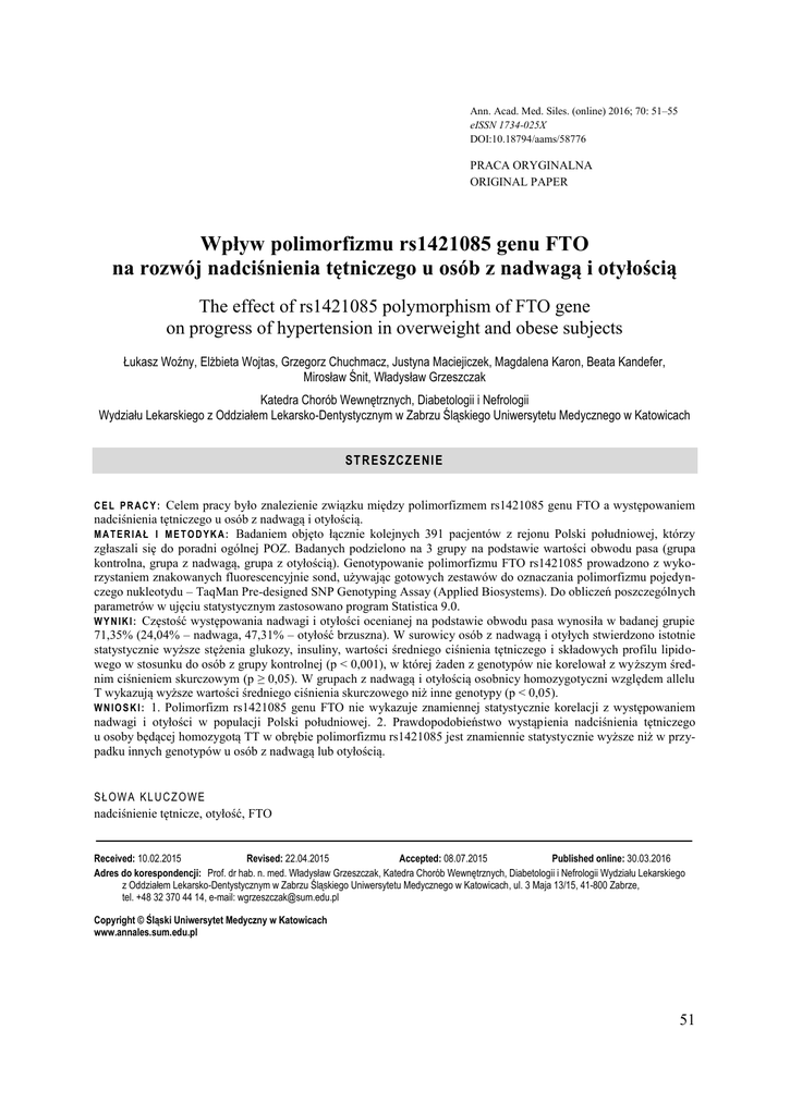 Ann. Acad. Med. Siles. (online) 2016; 70: 51–55 eISSN 1734-025X DOI:10.18794/aams/58776 PRACA ORYGINALNA ORIGINAL PAPER Wpływ polimorfizmu rs1421085 genu FTO na rozwój nadciśnienia tętniczego u osób z nadwagą i otyłością The effect of rs1421085 polymorphism of FTO gene on progress of hypertension in overweight and obese subjects Łukasz Woźny, Elżbieta Wojtas, Grzegorz Chuchmacz, Justyna Maciejiczek, Magdalena Karon, Beata Kandefer, Mirosław Śnit, Władysław Grzeszczak Katedra Chorób Wewnętrznych, Diabetologii i Nefrologii Wydziału Lekarskiego z Oddziałem Lekarsko-Dentystycznym w Zabrzu Śląskiego Uniwersytetu Medycznego w Katowicach ST R ES ZCZ E NI E C E L P R A C Y : Celem pracy było znalezienie związku między polimorfizmem rs1421085 genu FTO a występowaniem nadciśnienia tętniczego u osób z nadwagą i otyłością. M A T E R I A Ł I M E T O D Y K A : Badaniem objęto łącznie kolejnych 391 pacjentów z rejonu Polski południowej, którzy zgłaszali się do poradni ogólnej POZ. Badanych podzielono na 3 grupy na podstawie wartości obwodu pasa (grupa kontrolna, grupa z nadwagą, grupa z otyłością). Genotypowanie polimorfizmu FTO rs1421085 prowadzono z wykorzystaniem znakowanych fluorescencyjnie sond, używając gotowych zestawów do oznaczania polimorfizmu pojedynczego nukleotydu – TaqMan Pre-designed SNP Genotyping Assay (Applied Biosystems). Do obliczeń poszczególnych parametrów w ujęciu statystycznym zastosowano program Statistica 9.0. W Y N I K I : Częstość występowania nadwagi i otyłości ocenianej na podstawie obwodu pasa wynosiła w badanej grupie 71,35% (24,04% – nadwaga, 47,31% – otyłość brzuszna). W surowicy osób z nadwagą i otyłych stwierdzono istotnie statystycznie wyższe stężenia glukozy, insuliny, wartości średniego ciśnienia tętniczego i składowych profilu lipidowego w stosunku do osób z grupy kontrolnej (p < 0,001), w której żaden z genotypów nie korelował z wyższym średnim ciśnieniem skurczowym (p ≥ 0,05). W grupach z nadwagą i otyłością osobnicy homozygotyczni względem allelu T wykazują wyższe wartości średniego ciśnienia skurczowego niż inne genotypy (p < 0,05). W N I O S K I : 1. Polimorfizm rs1421085 genu FTO nie wykazuje znamiennej statystycznie korelacji z występowaniem nadwagi i otyłości w populacji Polski południowej. 2. Prawdopodobieństwo wystąpienia nadciśnienia tętniczego u osoby będącej homozygotą TT w obrębie polimorfizmu rs1421085 jest znamiennie statystycznie wyższe niż w przypadku innych genotypów u osób z nadwagą lub otyłością. SŁOWA KLUCZOWE nadciśnienie tętnicze, otyłość, FTO Received: 10.02.2015 Revised: 22.04.2015 Accepted: 08.07.2015 Published online: 30.03.2016 Adres do korespondencji: Prof. dr hab. n. med. Władysław Grzeszczak, Katedra Chorób Wewnętrznych, Diabetologii i Nefrologii Wydziału Lekarskiego z Oddziałem Lekarsko-Dentystycznym w Zabrzu Śląskiego Uniwersytetu Medycznego w Katowicach, ul. 3 Maja 13/15, 41-800 Zabrze, tel. +48 32 370 44 14, e-mail: [email protected] Copyright © Śląski Uniwersytet Medyczny w Katowicach www.annales.sum.edu.pl 51 ANN. ACAD. MED. SILES. (online) 2016; 70: 51–55 AB ST R ACT A I M : The aim of the study was to demonstrate the potential association between the rs1421085 polymorphism of the FTO gene and the incidence of hypertension and overweight and obesity in consecutive patients reporting to a primary care physician in a Public Health Centre. M A T E R I A L S A N D M E T H O D S : The study included a total of 391 patients from the area of southern Poland, who in turn reported to the Public Health Centre. The patients were divided into 3 groups based on their waist circumference score (control group, group of overweight patients and obese patients). Genotyping was carried out using a fluorescently labeled probe and readily prepared single nucleotide polymorphism kits – TaqMan Pre-designed SNP Genotyping Assay (Applied Biosystems). For statistical analysis we used the Statistica 9.0 program. R E S U L T S : The prevalence of overweight and obesity judged by the waist circumference score was 71.35%, for 24.04% of which constituted overweight people and 47.31% the obese. In the serum of overweight and obese people statistically significant higher levels of glucose concentration, insulin, mean arterial pressure and lipid profile components were found in comparison to the people from the control group (p < 0.001). In the control group no genotype showed a correlation with a higher average systolic pressure – statistically expressed as p ≥ 0.05. In the overweight and obese groups, homozygotes for the T allele exhibit a higher average systolic pressure than the other genotypes (p < 0.05). C O N C L U S I O N S : 1. Polymorphism rs1421085 of the FTO gene does not show a statistically significant correlation with the prevalence of overweight and obesity in the population of southern Poland. 2. The probability of exhibiting hypertension in a person who is a TT homozygote within the rs1421085 polymorphism is statistically significantly higher than in other genotypes, in overweight or obese subjects. KEY WORDS obesity, hypertension, FTO, overweight W ST Ę P Nadciśnienie tętnicze stanowi poważny problem społeczny, medyczny i ekonomiczny, będący istotnym wyzwaniem dla przyszłych pokoleń. Określa się je mianem światowej epidemii, a rosnąca liczba zapadających na to schorzenie oraz obniżająca się średnia wieku chorych jest sygnałem alarmującym dla lekarzy i badaczy naukowych. Znaczenie dalszego zainteresowania problemem nie podlega dyskusji, gdyż nadciśnienie stało się najczęstszą przyczyną powikłań sercowo-naczyniowych, takich jak udar mózgu czy zawał serca. Według danych Światowej Organizacji Zdrowia (World Health Organization – WHO), na nadciśnienie tętnicze choruje prawie miliard osób na świecie, a przewiduje się, że w 2025 r. liczba ta przekroczy 1,5 ml