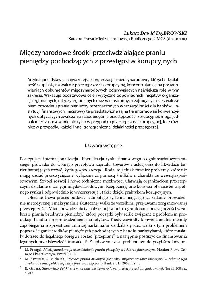 Lukasz Dawid DĄBROWSKI Katedra Prawa Międzynarodowego Publicznego UMCS (doktorant) Międzynarodowe środki przeciwdziałające praniu pieniędzy pochodzących z przestępstw korupcyjnych Artykuł przedstawia najważniejsze organizacje międzynarodowe, których działalność skupia się na walce z przestępczością korupcyjną, koncentrując się na postanowieniach dokumentów międzynarodowych odgrywających największą rolę w tym zakresie. Wskazuje podstawowe cele i wytyczne odpowiednich inicjatyw organizacji regionalnych, międzyregionalnych oraz wielostronnych zajmujących się zwalczaniem procederu prania pieniędzy przeznaczonych w szczególności dla banków i instytucji finansowych. Inicjatywy te przedstawione są na tle unormowań konwencyjnych dotyczących zwalczania i zapobiegania przestępczości korupcyjnej, mogą jednak mieć zastosowanie nie tylko w przypadku przestępczości korupcyjnej, lecz również w przypadku każdej innej transgranicznej działalności przestępczej. I. Uwagi wstępne Postępująca internacjonalizacja i liberalizacja rynku finansowego o ogólnoświatowym zasięgu, prowadzi do wolnego przepływu kapitału, towarów i usług oraz do likwidacji barier hamujących rozwój życia gospodarczego. Rodzi to jednak również problemy, które nie mogą zostać przezwyciężone wyłącznie za pomocą środków o charakterze wewnątrzpaństwowym. Szybki rozwój i nowe techniczne możliwości ułatwiają organizacjom przestępczym działanie o zasięgu międzynarodowym. Rozpoznają one korzyści płynące ze wspólnego rynku i odpowiednio je wykorzystują1, także dzięki praktykom korupcyjnym. Obecnie trawa proces budowy jednolitego systemu mającego za zadanie prowadzenie metodycznej i maksymalnie skutecznej walki ze wszelkimi przejawami zorganizowanej przestępczości. Miarą powodzenia tych działań jest m.in. ograniczanie przestępczości w zakresie prania brudnych pieniędzy,2 której początki były ściśle związane z problemem produkcji, handlu i rozprowadzaniem narkotyków. Kiedy zawiodły konwencjonalne metody zapobiegania rozprzestrzenianiu się narkomanii zrodziła się idea walki z tym problemem poprzez ściganie środków pieniężnych pochodzących z handlu narkotykami, które musiały dotrzeć do legalnego obiegu i zostać “przeprane”, a następnie posłużyć do finansowania legalnych przedsięwzięć i transakcji3. Z upływem czasu problem ten dotyczył środków po1 2 3 M. Prengel, Międzynarodowe przeciwdziałanie praniu pieniędzy w sektorze finansowym, Monitor Prawa Celnego i Podatkowego, 1999/10, s. 1. M. Krzewski, S. Michalak, Proceder prania brudnych pieniędzy, międzynarodowe inicjatywy w zakresie jego zwalczania oraz polskie regulacje prawne, Bezpieczny Bank 2(21), 2003 r., s. 1. E. Gabara, Stanowisko Polski w zwalczaniu międzynarodowej przestępczości zorganizowanej, Toruń 2004 r., s. 217. MATERIAŁY 171 chodzących z innych dobrze prosperujących form przestępczości zorganizowanej, w tym korupcji. W skali międzynarodowej przyjęto szereg dokumentów poświęconych zwalczaniu i zapobieganiu czynom korupcyjnym. Do najważniejszych należy zaliczyć: Konwencję amerykańską przeciw korupcji4, Konwencję afrykańską o zapobieganiu i zwalczaniu korupcji5, Protokół Wspólnoty Gospodarczej Państw Afryki Zachodniej przeciw korupcji6, Protokół Południowo Afrykańskiej Wspólnoty Rozwoju przeciw korupcji7, Konwencję karnoprawną o korupcji Rady Europy8 oraz Konwencję ONZ przeciw korupcji9 (dalej: Konwencja ONZ). Zobowiązują one do kryminalizacji szerokiego wachlarza zachowań korupcyjnych. I tu jedynie Konwencje: OECD, ONZ, karnoprawna oraz afrykańska kryminalizują przestępstwo prania pieniędzy pochodzących z praktyk korupcyjnych. Konwencja ONZ, będąc dokumentem kompleksowo zwalczającym zachowania korupcyjne, jako jedyna, zawiera również ogólne wytyczne i środki przeciwdziałające procederowi prania pieniędzy pochodzących z przestępczości korupcyjnej. Artykuł przedstawia najważniejsze organizacje międzynarodowe, których działalność skupia się na walce z przestępstwami prania pieniędzy, koncentrując się jednak na postanowieniach dokumentów międzynarodowych, odgrywających największą rolę w tym zakresie, na tle unormowań konwencyjnych dotyczących zwalczania i zapobiegania przestępczości korupcyjnej. II. Organizacje międzynarodowe Postanowienia art. 14 ust. 4 Konwencji ONZ zobowiązują do wykorzystania, w charakterze wytycznych, odpowiednich inicjatyw organizacji regionalnych, międzyregionalnych oraz organizacji wielostronnych zajmujących się zwalczaniem procederu prania pieniędzy. Organizacji i instytucji zajmujących się tym zjawiskiem jest wiele, tak w wymiarze państwowym10, jak i międzynarodowym. Prezentacja i ocena zgodności polskich przepisów, 4 5 6 7 8 9 10 Organization of American States – Inter-American Convention against Corruption, Caracas, 29 III 1996, dostępna na stronie http://www.oas.org/juridico/english/Treaties/b-58.html. African Union Convention on Preventing and Combating Corruption (CPCC), Maputo, Mozambik11 VII 2003, dostępna na stronie http://www.african-union.org. Economic Community of West African States (ECOWAS) Protocol on the Fight Against Corruption, 21 XII 2001, dostępna na stronie hptt://www.ecowas.int. Southern African Development Community (SADC) Protocol against Corruption, Blantyre, Malawi, 14 VIII 2001, dostępna na stronie hptt://www.sadc.int. Criminal Law Convention on Corruption, Strasbourg, 27 I 1999, European Treaty Series No 173. (Ustawa z dnia 5 czerwca 2002 r. o ratyfikacji Karnoprawnej konwencji o korupcji, Dz.U. z 2002 r., nr 126, poz. 1066), dostępny na stronie http://www.coe.int. United Nations Convention against Corruption, New York, 31 X 2003, dostępna na stronie hptt://www.un.org. Zob. ustawia z dnia 16 listopada 2000 r. o przeciwdziałaniu wprowadzaniu do obrotu finansowego wartości majątkowych pochodzących z
