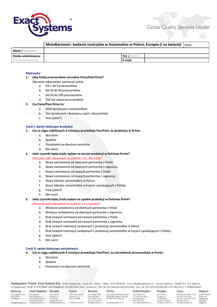 MotoBarometr: badanie nastrojów w Automotive w Polsce, Europie (i na świecie) Data: Klient / Customer Osoba ankietowana: Interviewed person: Tel. / phone: E-mail: Metryczka: 1. Jaką liczbę pracowników zatrudnia Pana/Pani firma? Odczytać odpowiedzi, zaznaczyć jedną a. Od 1 do 9 pracowników b. Od 10 do 49 pracowników c. Od 50 do 249 pracowników d. 250 lub więcej pracowników 2. Czy Pana/Pani firma to: a. OEM (producent samochodów) b. Tier (producent i dostawca części i akcesoriów) c. Inne (jakie?) Cześć I: opinie dotyczące produkcji 1. Czy w ciągu najbliższych 6 miesięcy przewiduje Pan/Pani, że produkcja w firmie: a. Wzrośnie b. Spadnie c. Pozostanie na obecnym poziomie d. Nie wiem 2. Jakie czynniki będą miały wpływ na wzrost produkcji w Państwa firmie? Odczytać, gdy odpowiedź na pytanie 1 to „Wzrośnie” a. Nowe zamówienia od obecnych partnerów z Polski b. Nowe zamówienia od obecnych partnerów z zagranicy c. Nowe zamówienia od nowych partnerów z Polski d. Nowe zamówienia od nowych partnerów z zagranicy e. Nowa fabryka samochodów w Polsce f. Nowa fabryka samochodów a krajach sąsiadujących z Polską g. Inne (jakie?) h. Nie wiem 3. Jakie czynniki będą miały wpływ na spadek produkcji w Państwa firmie? Odczytać, gdy odpowiedź na pytanie 1 to „Spadnie” a. Mniejsze zamówienia od obecnych partnerów z Polski b. Mniejsze zamówienia od obecnych partnerów z zagranicy c. Brak nowych zamówień od nowych partnerów z Polski d. Brak nowych zamówień od nowych partnerów z zagranicy e. Brak nowych inwestycji związanych z produkcją samochodów w Polsce f. Brak nowych inwestycji związanych z produkcją samochodów w krajach sąsiadujących z Polską g. Inne (jakie?) h. Nie wiem Cześć II: opinie dotyczące zatrudnienia 4. Czy w ciągu najbliższych 6 miesięcy przewiduje Pan/Pani, że zatrudnienie pracowników w firmie: a. Wzrośnie b. Spadnie c. Pozostanie na obecnym poziomie 5. 6. 7. Zapotrzebowanie na jakich pracowników w ciągu najbliższych 6 miesięcy w Państwa firmie będzie największe? a. Pracowników niższego szczebla (pracowników produkcyjnych) b. Pracowników średniego szczebla c. Pracowników wyższego szczebla (Menadżerów i kierowników) d. Innych Jakie są obecnie największe problemy związane z zatrudnieniem w branży motoryzacyjnej? a. Mała liczba kandydatów do pracy b. Brak pracowników o kierunkowym wykształceniu c. Brak placówek edukacyjnych przygotowujących do pracy w branży motoryzacyjnej d. Wysokie oczekiwania płacowe pracowników e. Inne (jakie?) f. Nie wiem Jakie są Pana/Pani zdaniem najlepsze sposoby na poprawę sytuacji w obszarze zatrudnienia w motoryzacji? a. Otwarcie kierunków na uczelniach wyższych przygotowujących do pracy w motoryzacji b. Uruchomienie profilu związanego z pracą w motoryzacji w szkołach zawodowych c. Organizowanie przez pracodawców z branży dodatkowych szkoleń d. Inne (jakie?) Cześć III opinie dotyczące Polski 8. Jakie Pan/Pani widzi możliwości rozwoju branży Automotive w Polsce w ciągu najbliższych 3 lat? Możliwość wskazania 1 odpowiedzi a. Uruchomienie nowego zakładu produkcyjnego (OEM lub Tier) b. Produkcja nowych modeli samochodów w polskich zakładach c. Rozwój nowych technologii – np. produkcja samochodów elektrycznych d. Zmniejszenie kosztów pracy e. Systematyczna poprawa jakości f. Inne, jakie? 9. Jakie Pana/Pani zdaniem są największe przewagi Polski jako miejsca ulokowania inwestycji motoryzacyjnych? Możliwość wskazania max. 3 odpowiedzi a. Koszty pracy b. Dostęp do wykwalifikowanego personelu c. System edukacyjny d. Położenie geograficzne e. Infrastruktura drogowa i logistyczna f. Ulgi podatkowe i granty g. Przepisy prawno-podatkowe h. Stabilna sytuacja polityczno-ekonomiczna i. Inne (jakie?) 10. Jakie dostrzega Pan/Pani główne zagrożenia rozwoju branży motoryzacyjnej w Polsce w najbliższym czasie? Możliwość wskazania max. 3 odpowiedzi a. Wzrost kosztów pracy b. Pogorszenie otoczenia gospodarczo-politycznego c. Pogorszenie jakości produkowanych części i samochodów d. Wzrost konkurencji ze strony innych państw e. Słaba promocja polskich możliwości na świecie przez rządowe organizacje f. Spadek sprzedaży samochodów na świecie g. Inne, jakie? 11. W którym państwie europejskim przemysł motoryzacyjny ma największe perspektywy rozwoju w ciągu najbliższych 3 lat? Możliwość wskazania max. 3 odpowiedzi a. Polska b. Czechy c. Słowacja d. Niemcy e. Węgry f. Turcja g. Rumunia h. Inne (jakie?) Cześć IV: konkurencja spoza branży motoryzacyjnej i przyszłość motoryzacji 12. Czy Pana/Pani zdaniem w ciągu najbliższych 5 lat samochody z tradycyjnym napędem mogą zostać wyparte przez auta elektryczne czy napędzane na wodór? a. Tak b. Nie c. Nie wiem (nie czytać) 13. Model której marki ma największe szanse na masową produkcję i powszechne użycie przez kierowców? a. Google (Samoprowadzące się auto) b. Uber (Samoprowadzące się auto) c. Lyft (Samoprowadzące się auto) d. Inne (jakie?) e. Nie wiem 14. Czy Pana / Pani zdaniem marki spoza branży motoryzacyjnej mają szansę na sukces w branży? a. Tak, samodzielnie b. Tak, przy współpracy z tradycyjnym producentem samochodów c. Nie d. Nie wiem ………………………………………... Podpis / Signature